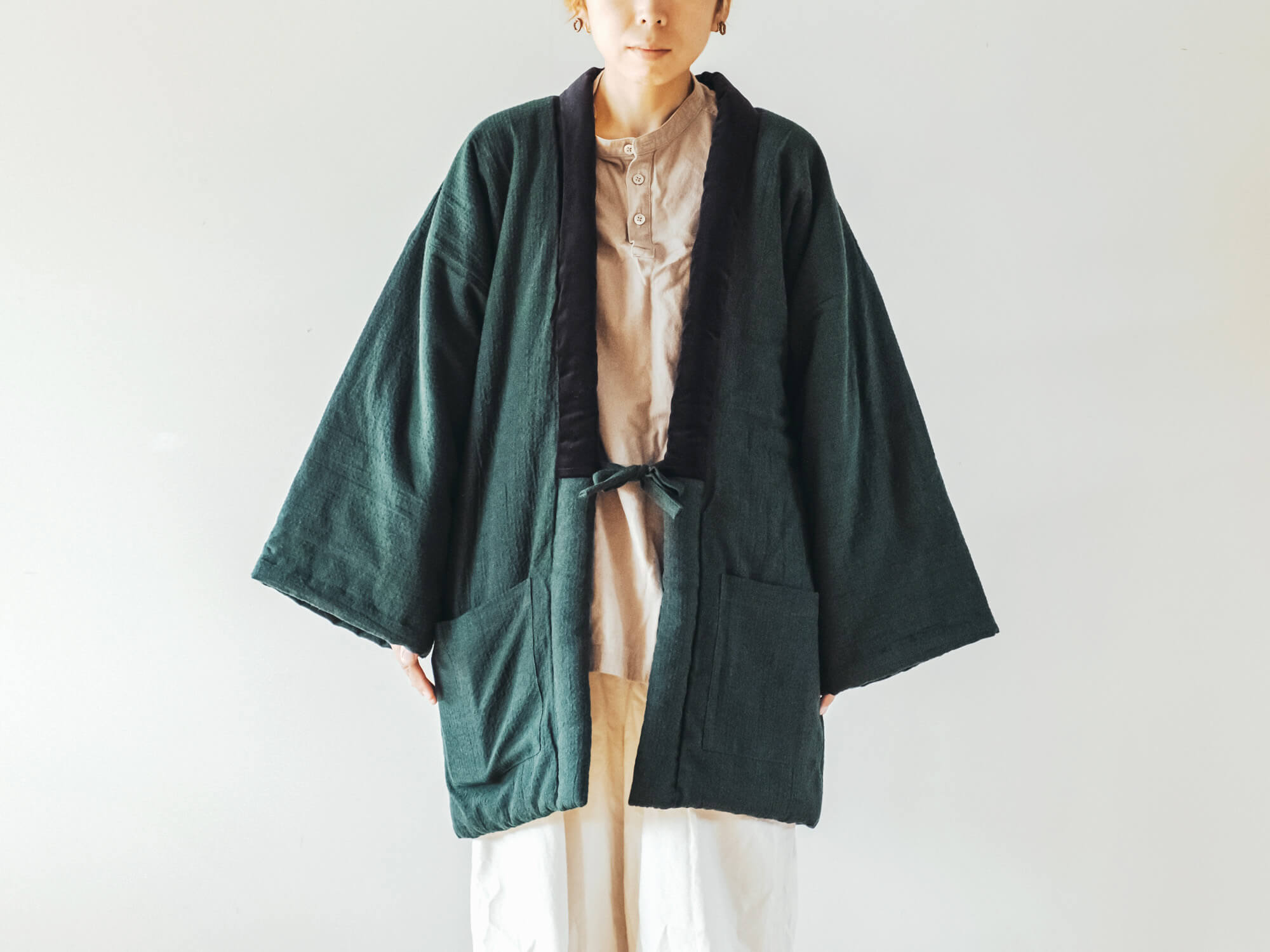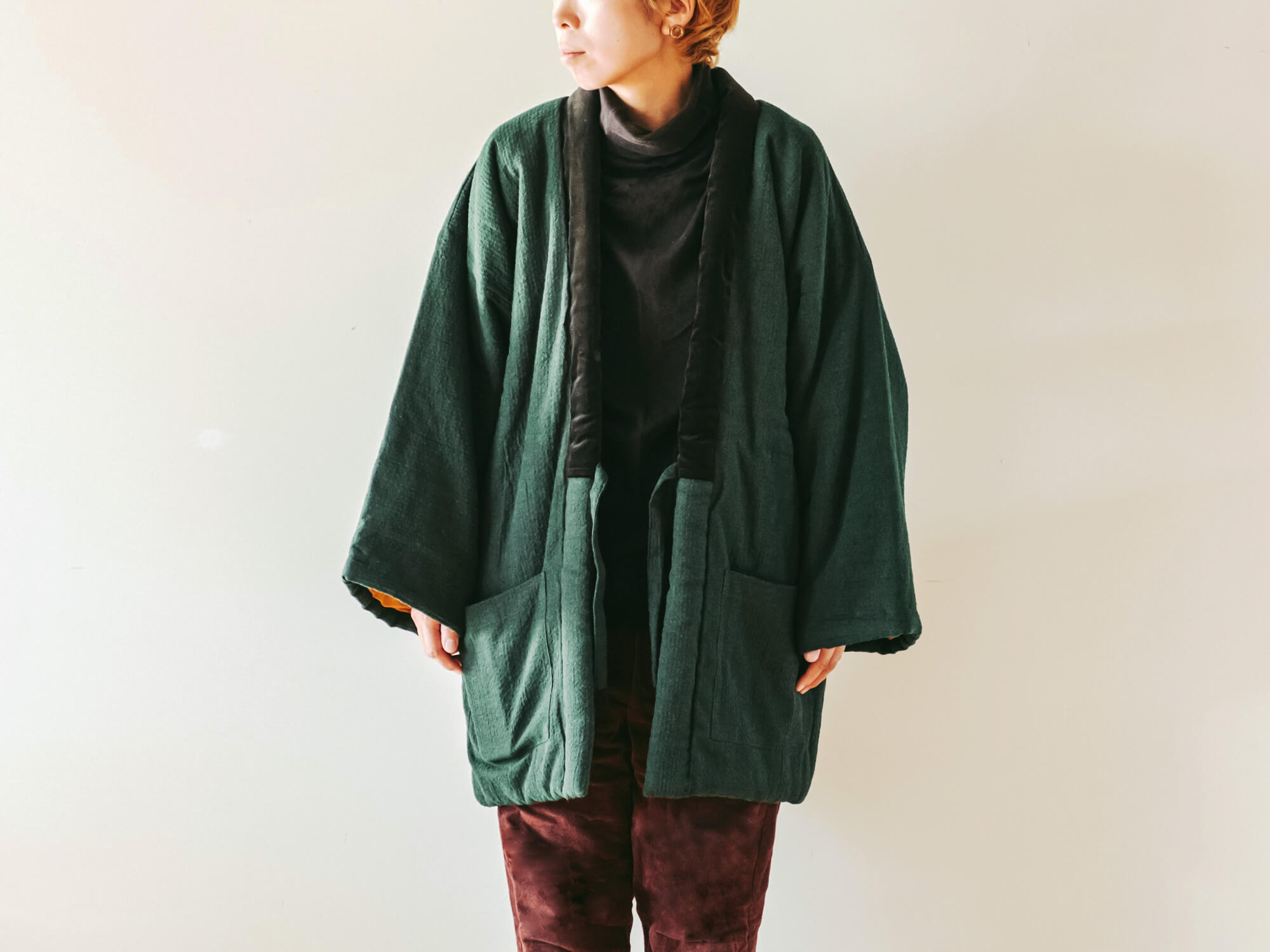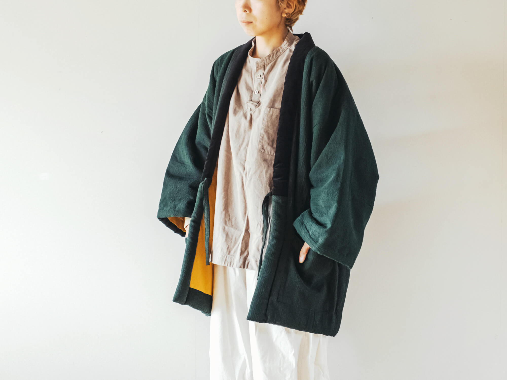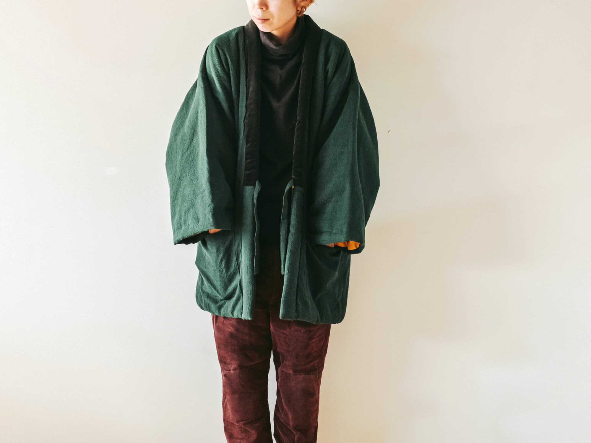 脈々はんてんに使用されている生地は、ムラ感のある糸が使用してあることで、はっきりとしたグリーンというよりは、少し曖昧な何とも言えない緑色が、四季によって変わる山のイメージや、まだまだこれからという段階の伝所鳩のイメージにもしっくりと当てはまったように思います。
