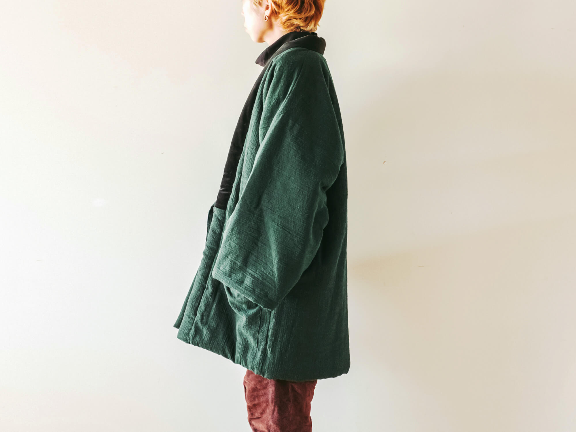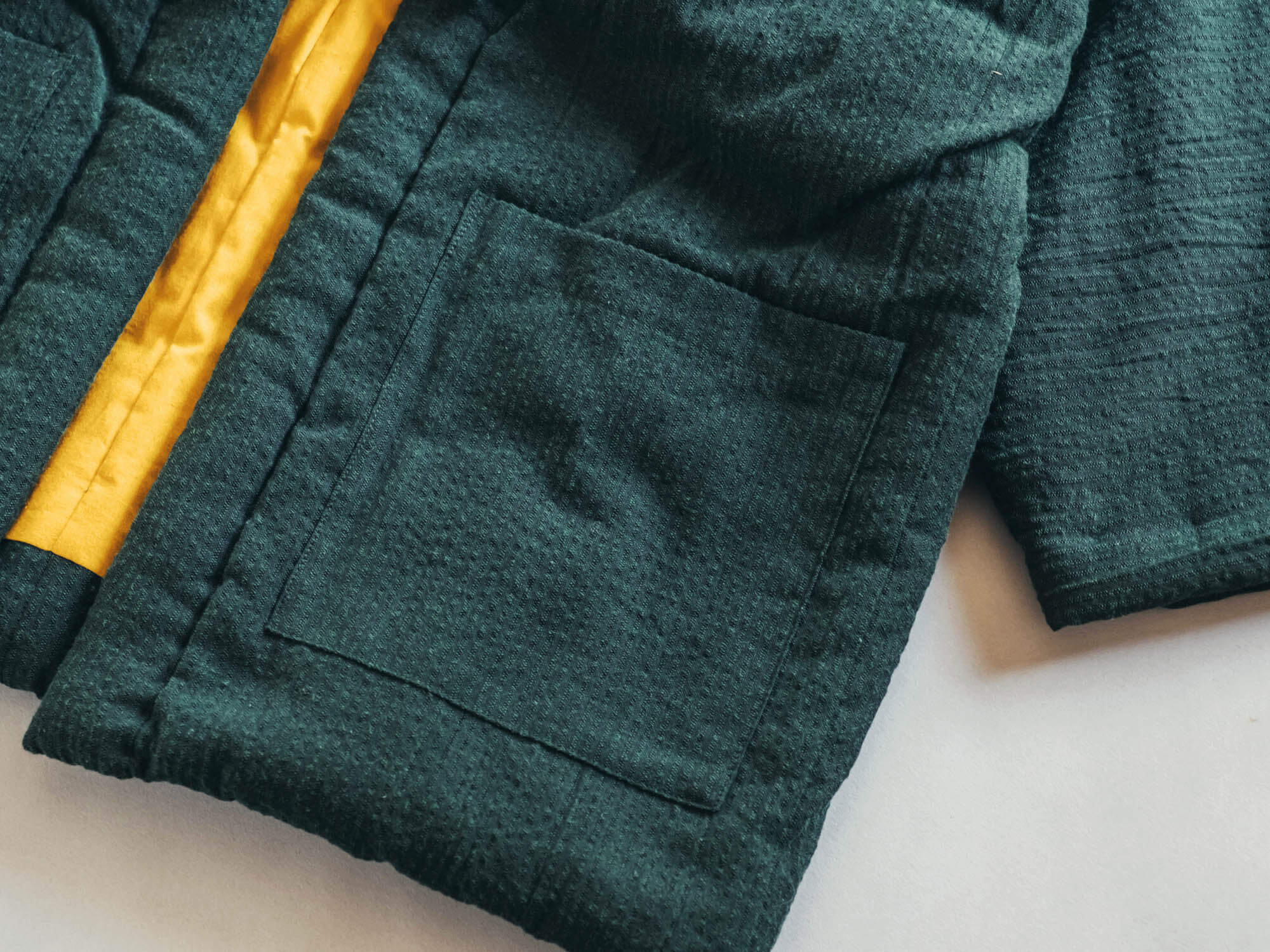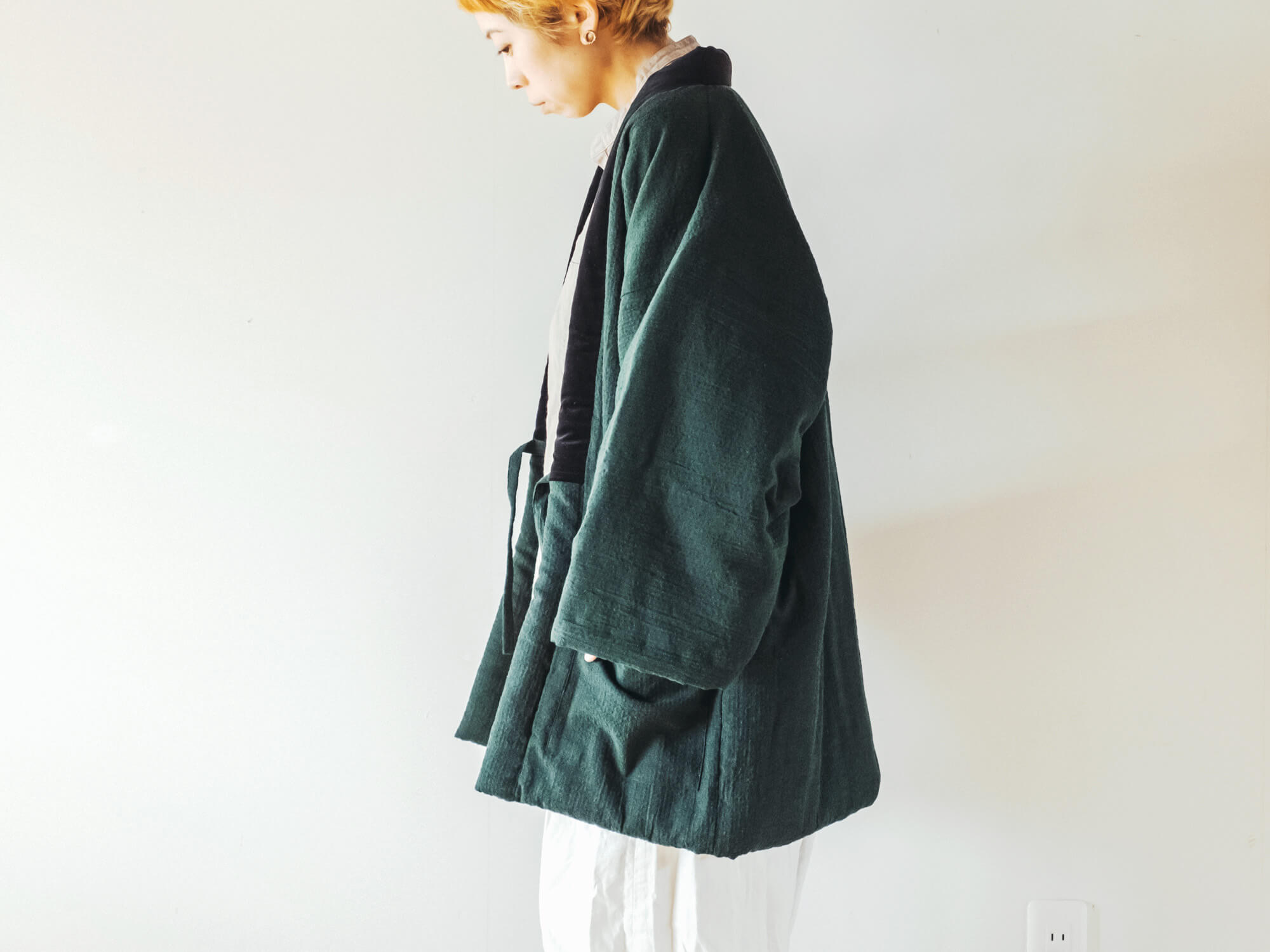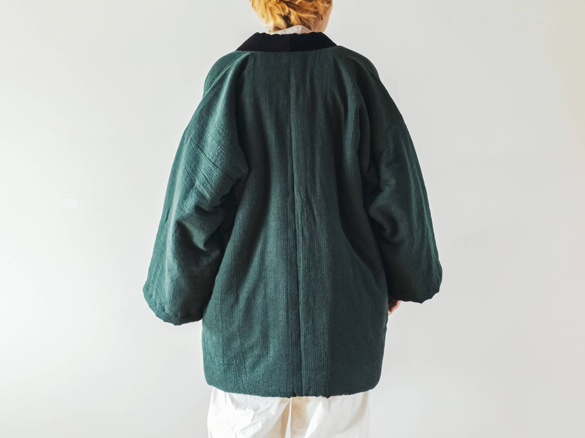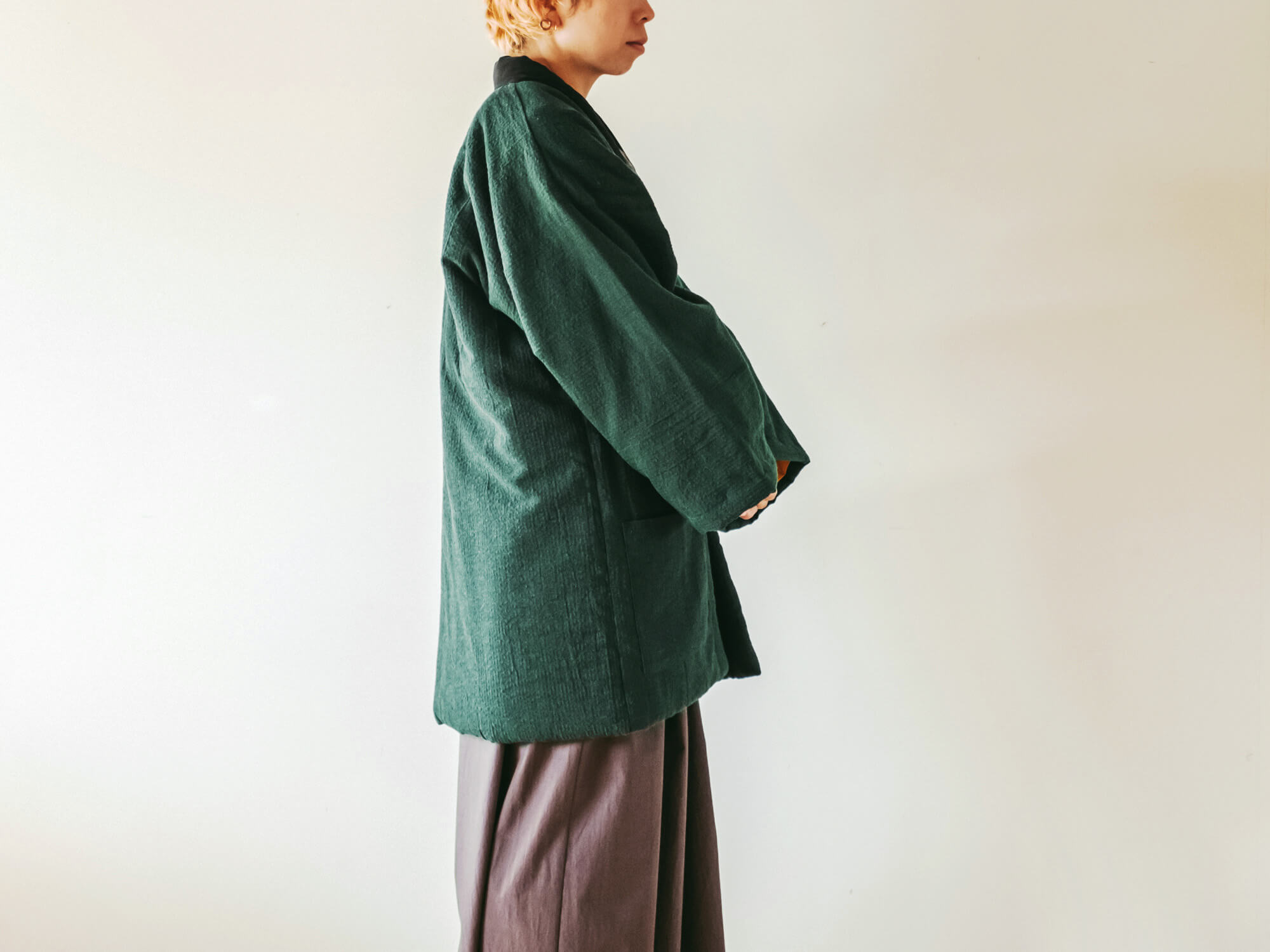 脈々はんてんに使用されている生地は、ムラ感のある糸が使用してあることで、はっきりとしたグリーンというよりは、少し曖昧な何とも言えない緑色が、四季によって変わる山のイメージや、まだまだこれからという段階の伝所鳩のイメージにもしっくりと当てはまったように思います。