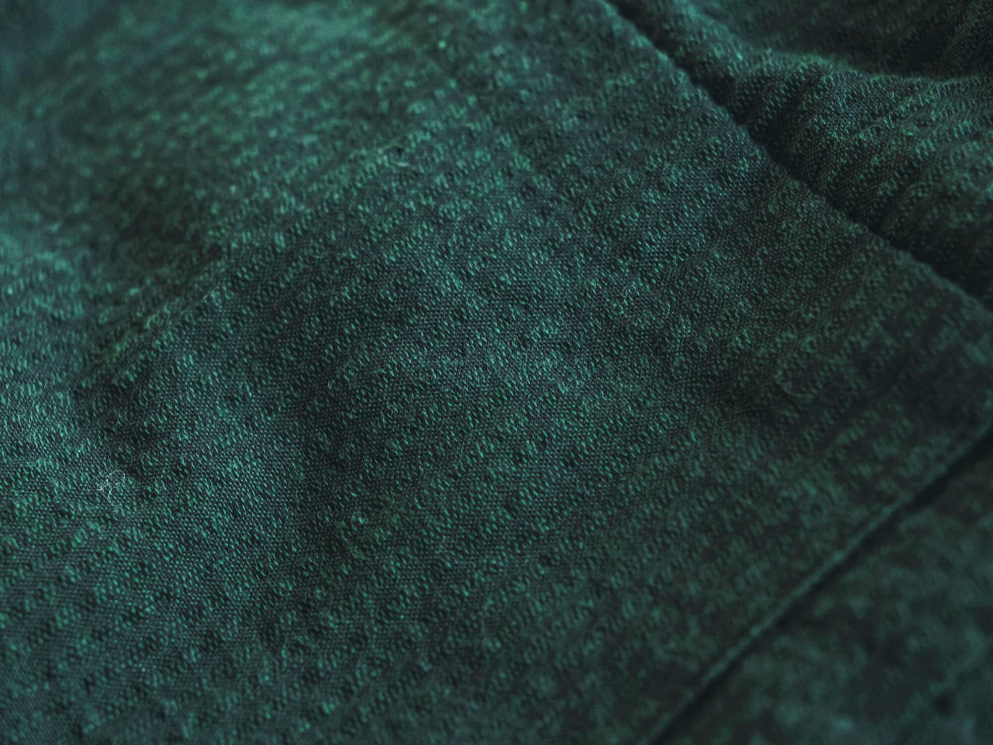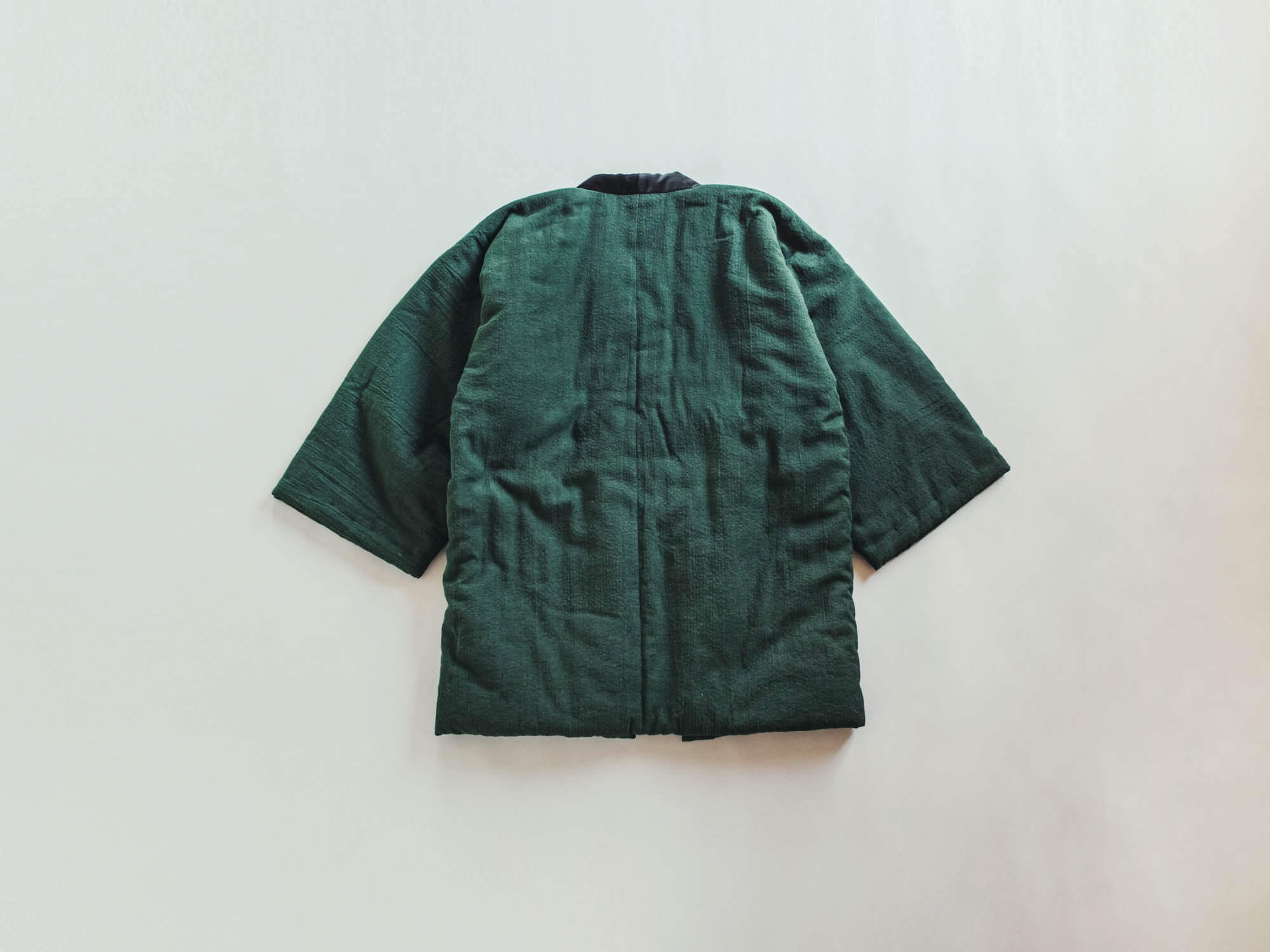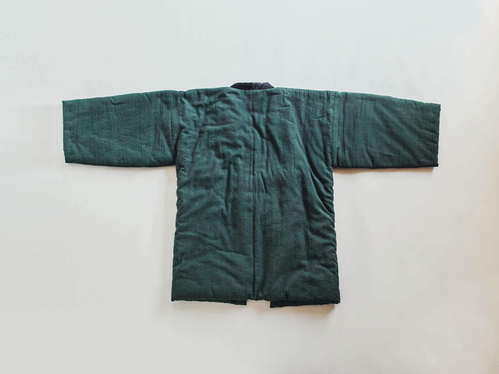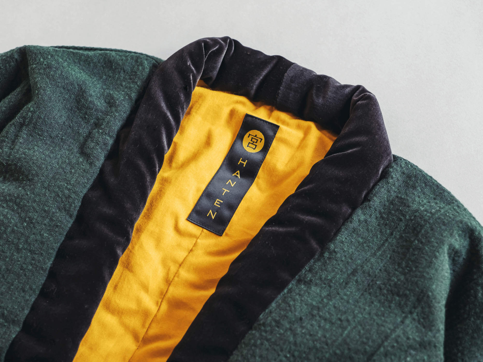 脈々はんてんに使用されている生地は、ムラ感のある糸が使用してあることで、はっきりとしたグリーンというよりは、少し曖昧な何とも言えない緑色が、四季によって変わる山のイメージや、まだまだこれからという段階の伝所鳩のイメージにもしっくりと当てはまったように思います。