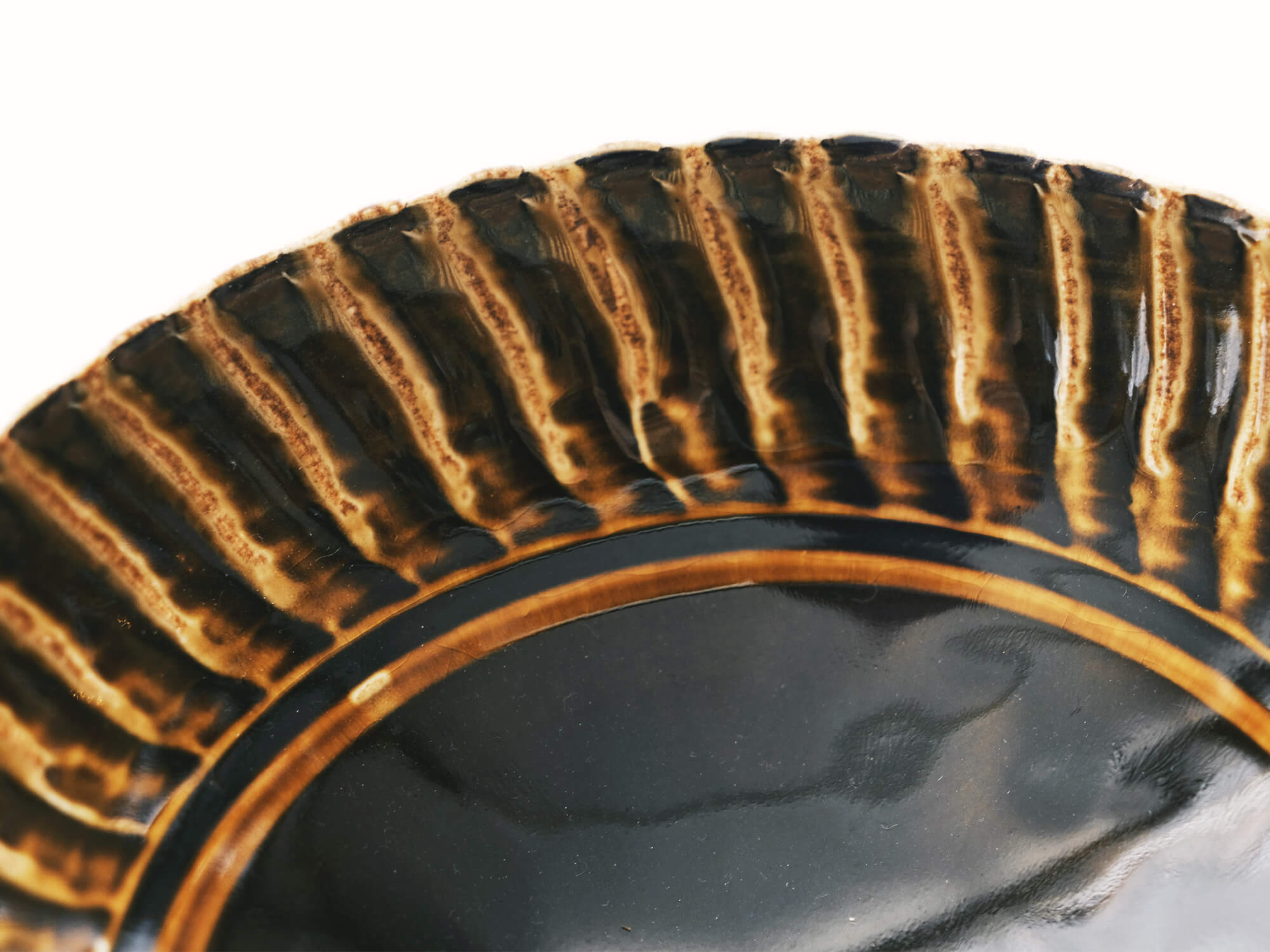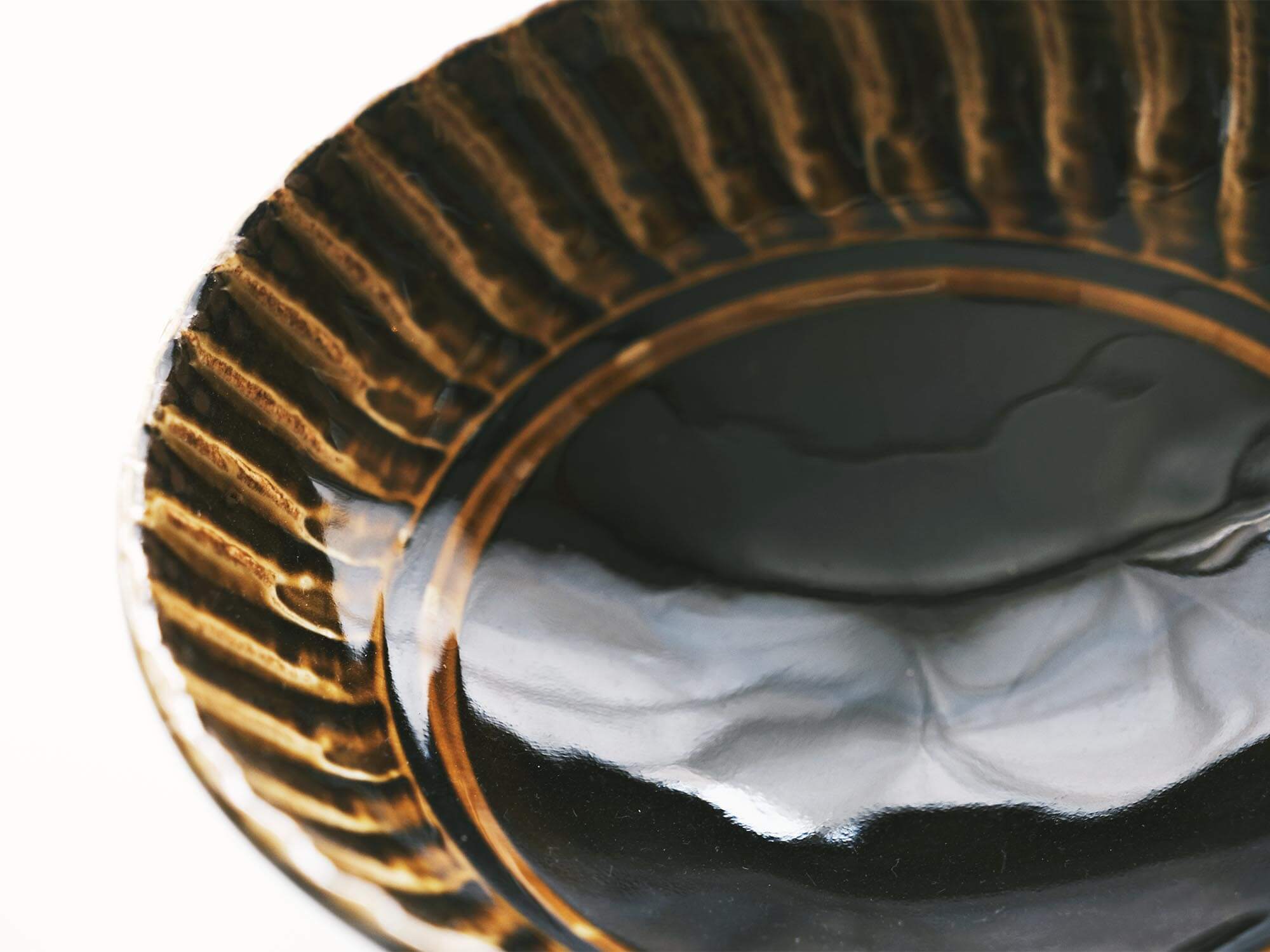 内側に施された力強い刷毛目模様と、深みのある飴釉のつややかさ。手に取ると、しっとりとした存在感とあたたかみを感じられる5寸鉢です。