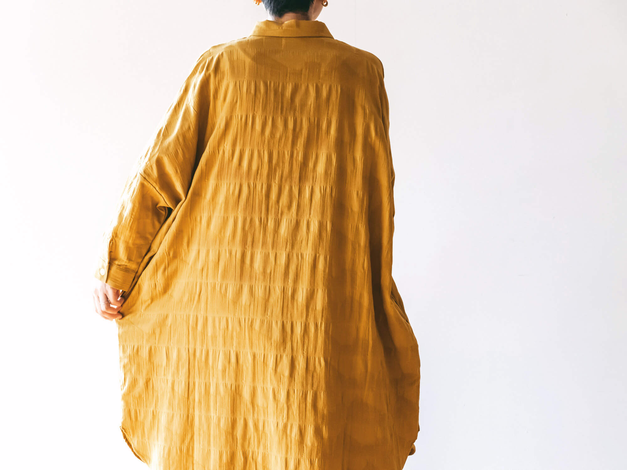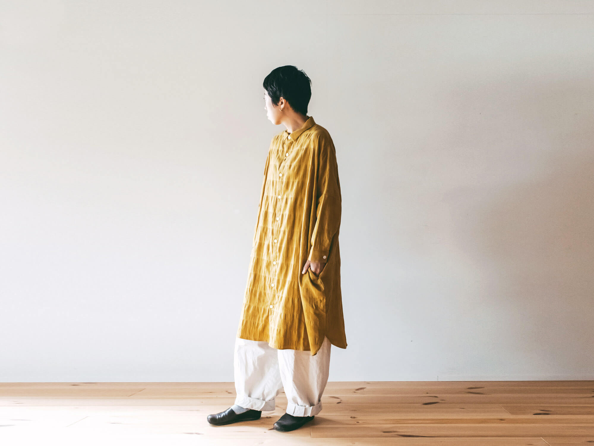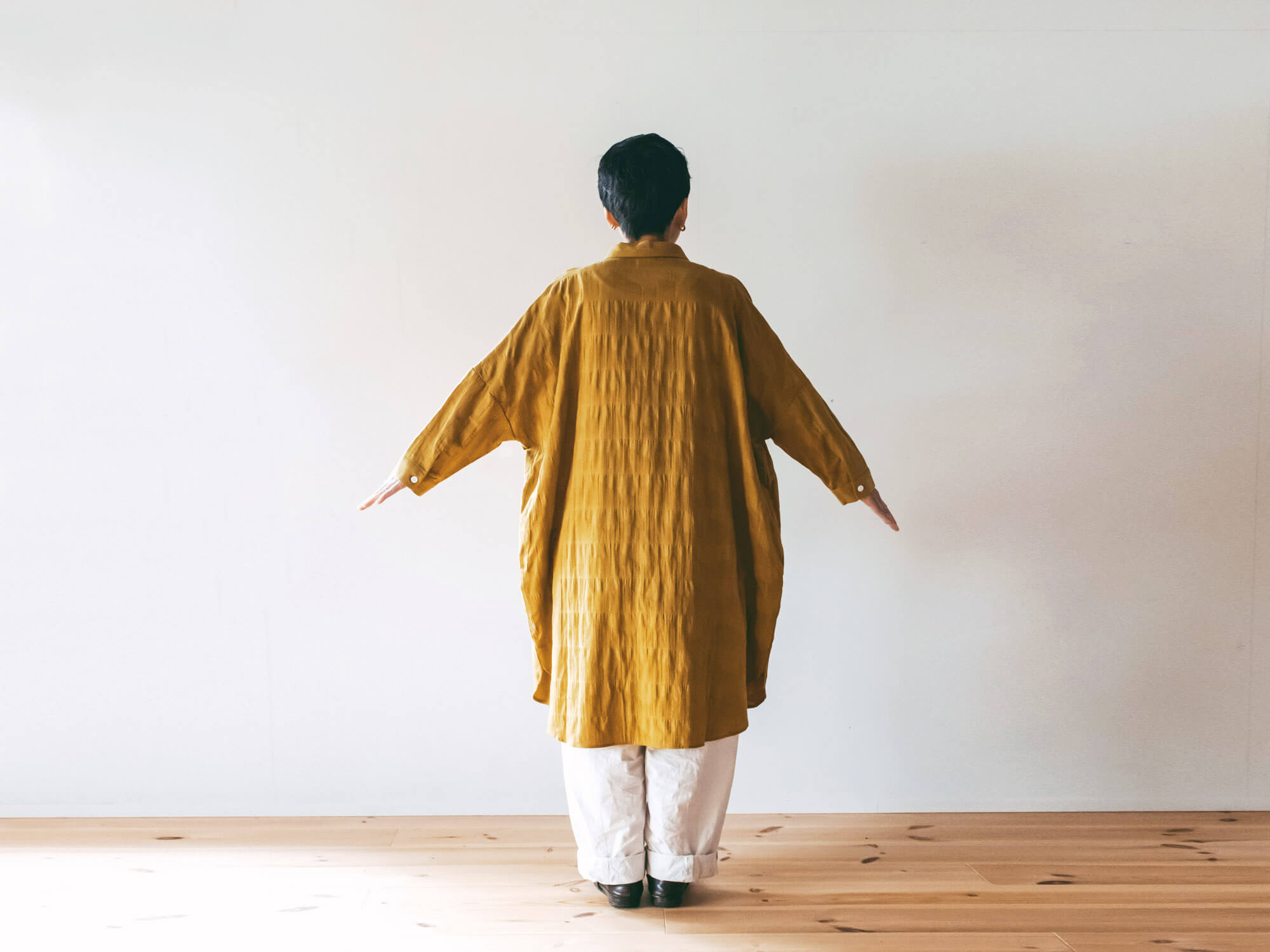 身幅をたっぷりととったオーバーサイズのデザインは、着る人を選ばず、羽織としても活躍。洗いざらしで着られる自然なシワ感も、このシャトル織機ならでは。日々の中で、着て、洗って、乾かして、それだけでサマになる、頼れる一着です。