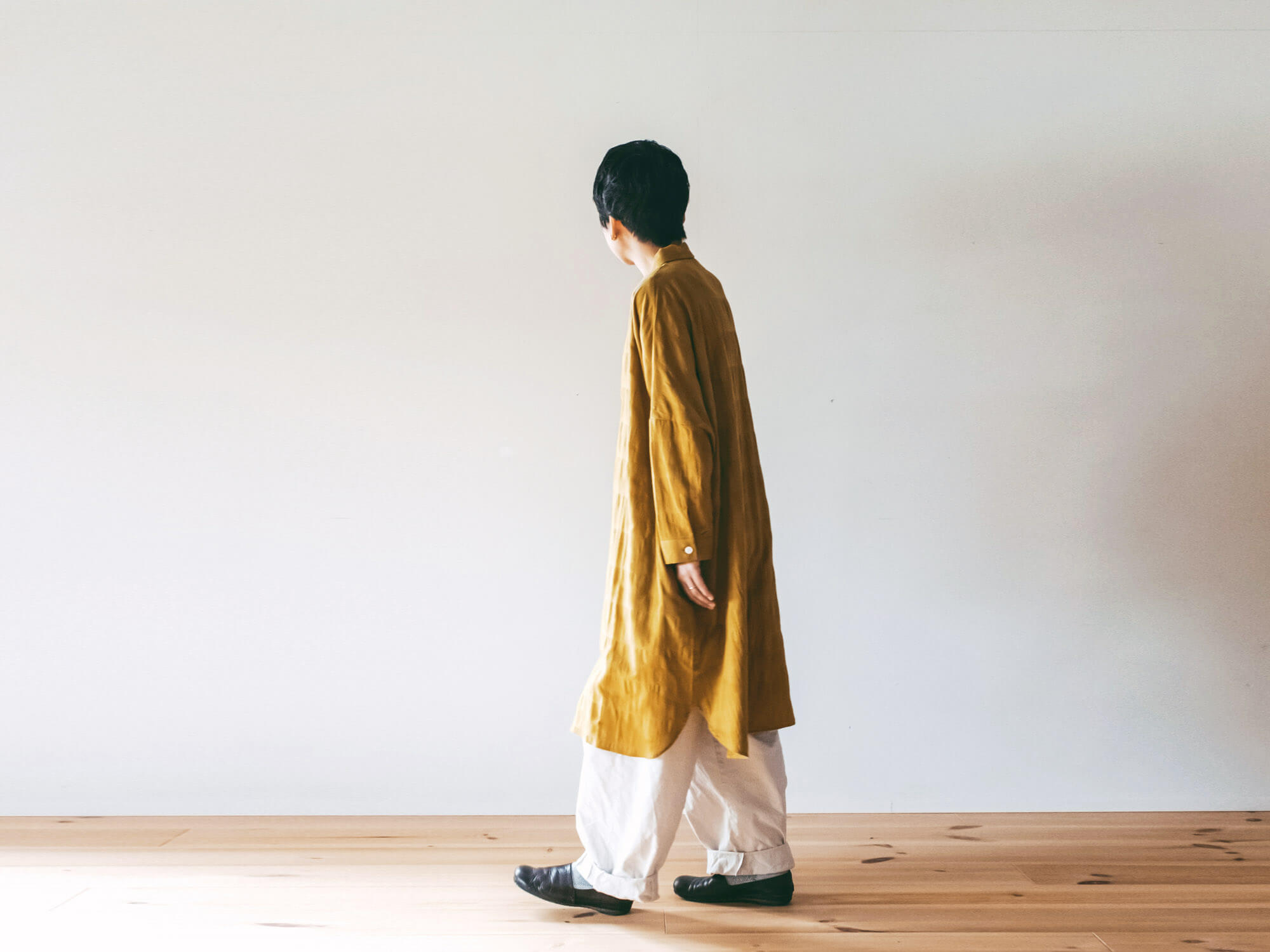 HUISでは、そんな遠州織物の魅力を最大限に活かし、無駄を削ぎ落としたシンプルなデザインの洋服を一点一点丁寧に仕立てています。流行にとらわれず、年齢や性別を問わず着られる上質な日常着は、長く大切に着続けたくなる一着です。