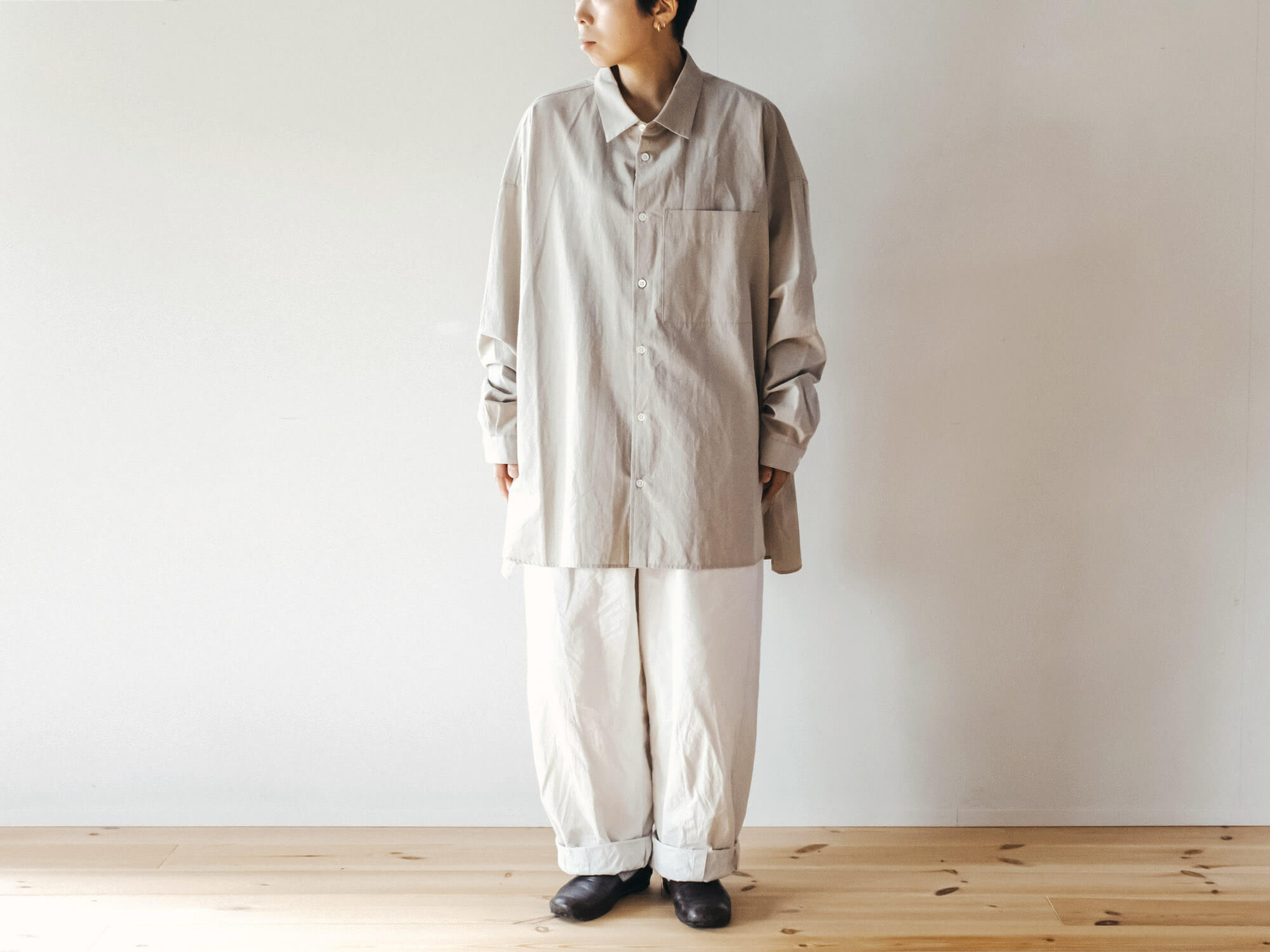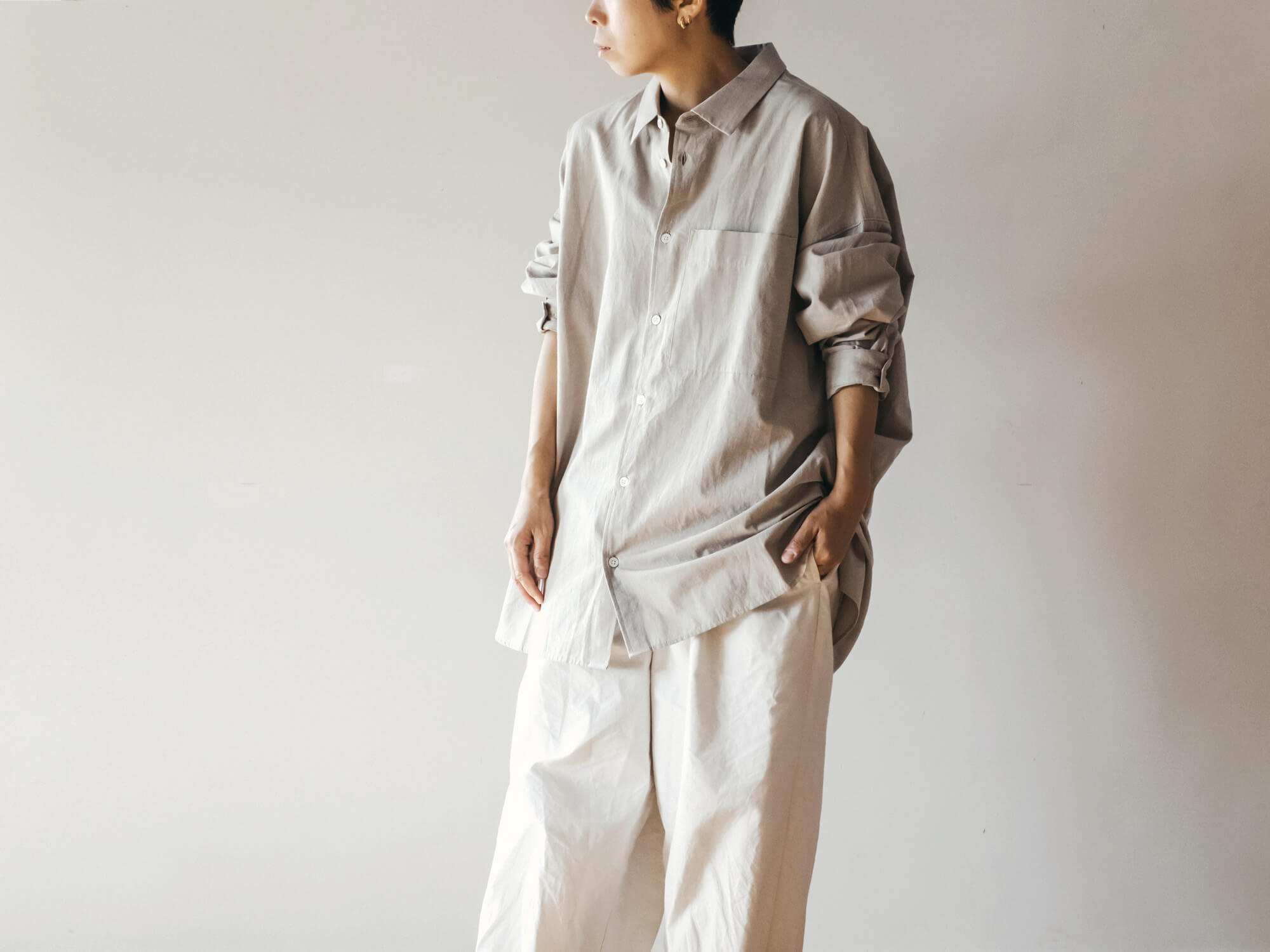 定番の015オーバーシャツに、ちょっと大きめが仲間入り。メンズでいうところのXL〜XXL相当の、HUIS史上もっともゆったりとしたサイズ感のシャツです。