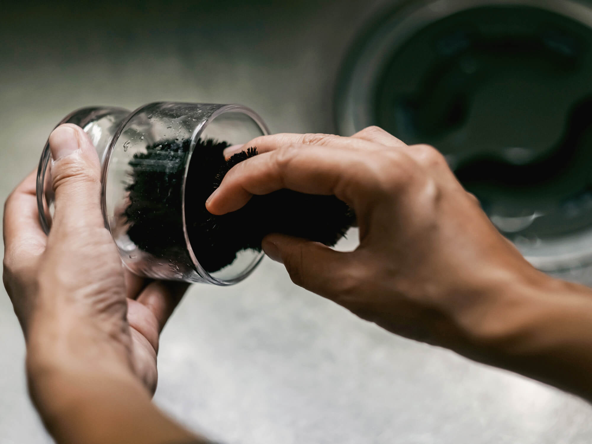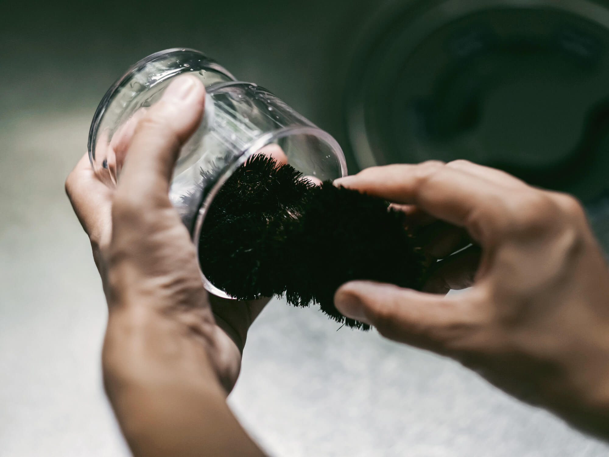 スリムで手にすっとなじむ形は、コップの底やフライパンの隅、木のお弁当箱の角まで、ぐいっと届いてくれる頼もしさ。しかもどの面にも金具が出ていないから、角度を気にせずぐるぐる自由に使えるのがいいところ。片減りもしにくく、長く使っていただけます。