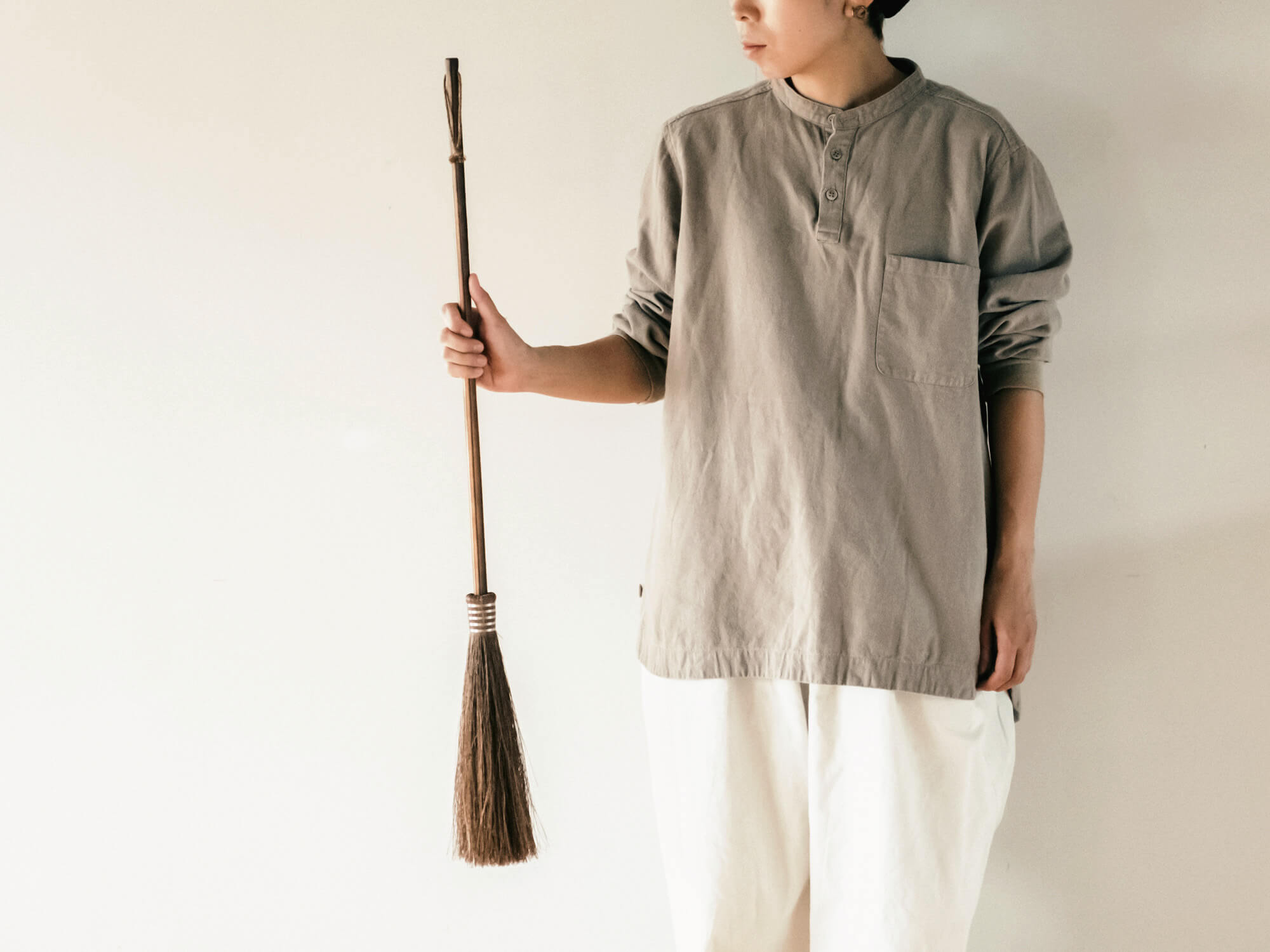 柄には焼き加工を施した檜を使用し、手になじむ優しい質感と、すっと立てかけても絵になる佇まいも魅力。使用後は吊るして保管すれば、風通しもよく、見た目にも美しく。