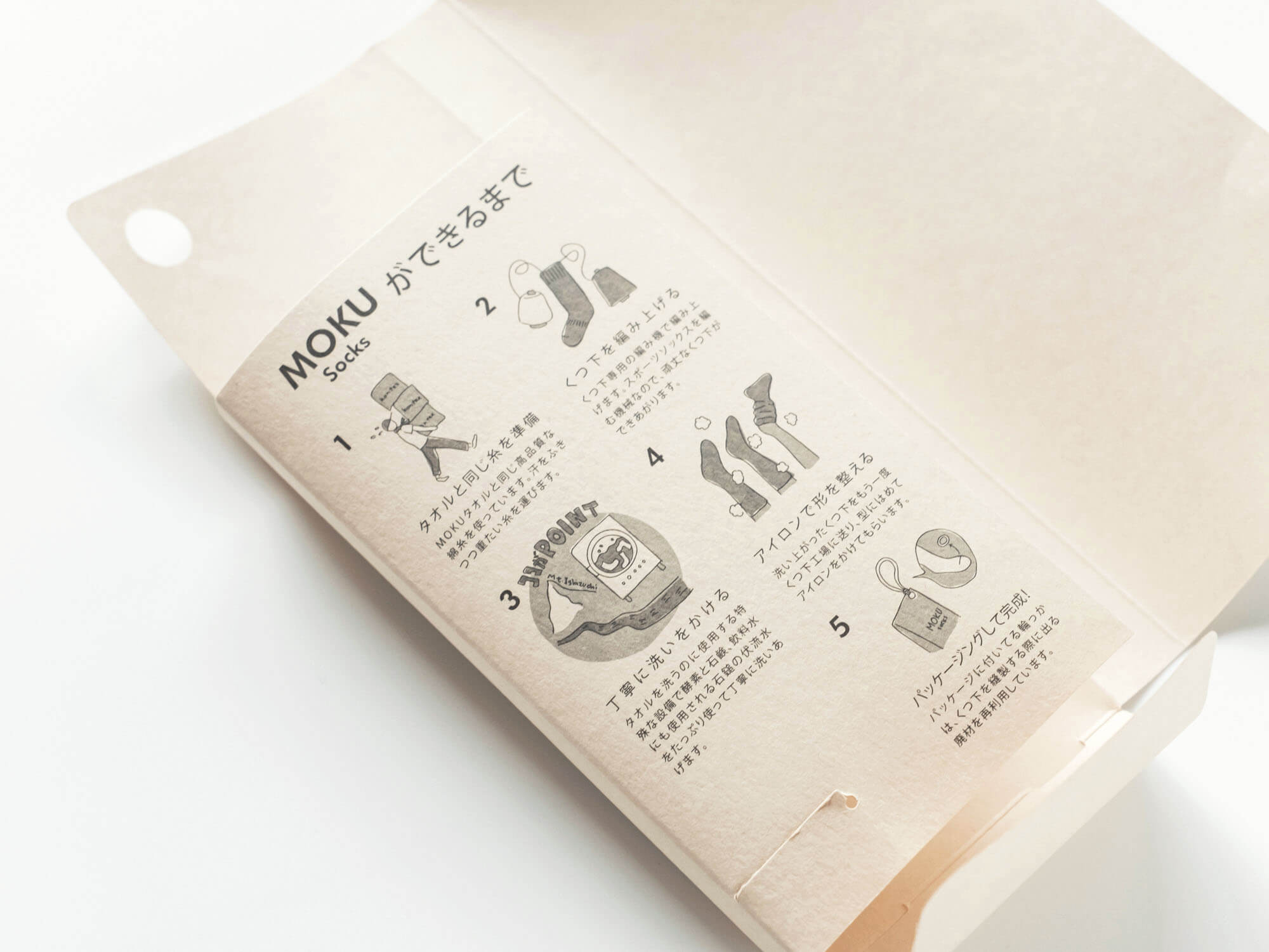 ギフトにもぴったりなパッケージ入りで、パッケージにはくつ下製造時に出る「わっか」の端材を再利用。ものづくりへのまっすぐな姿勢が、こんな細部にも感じられる一足です。