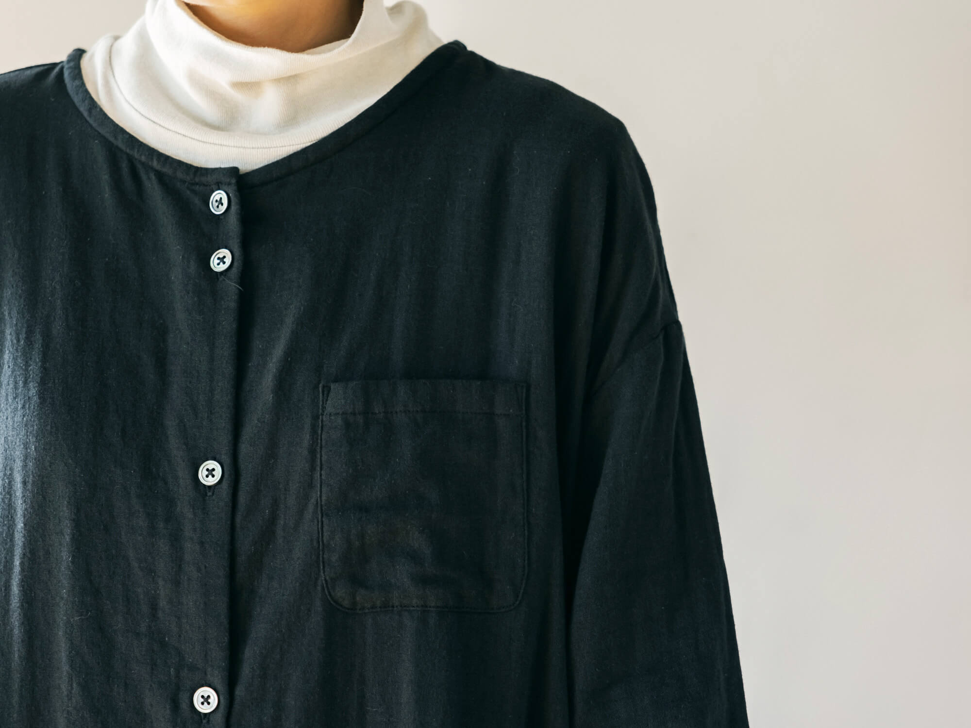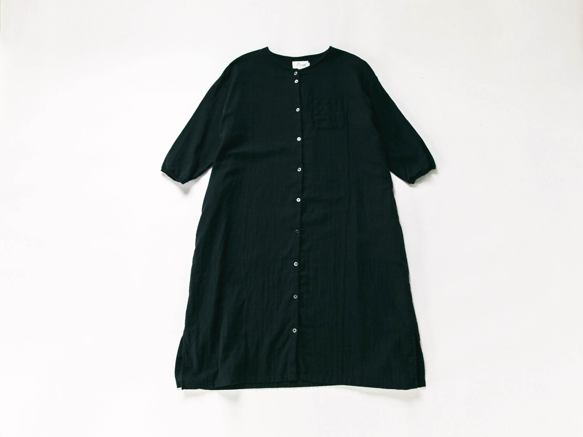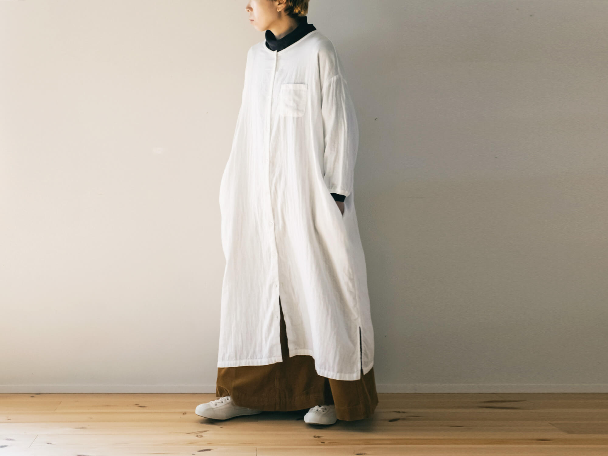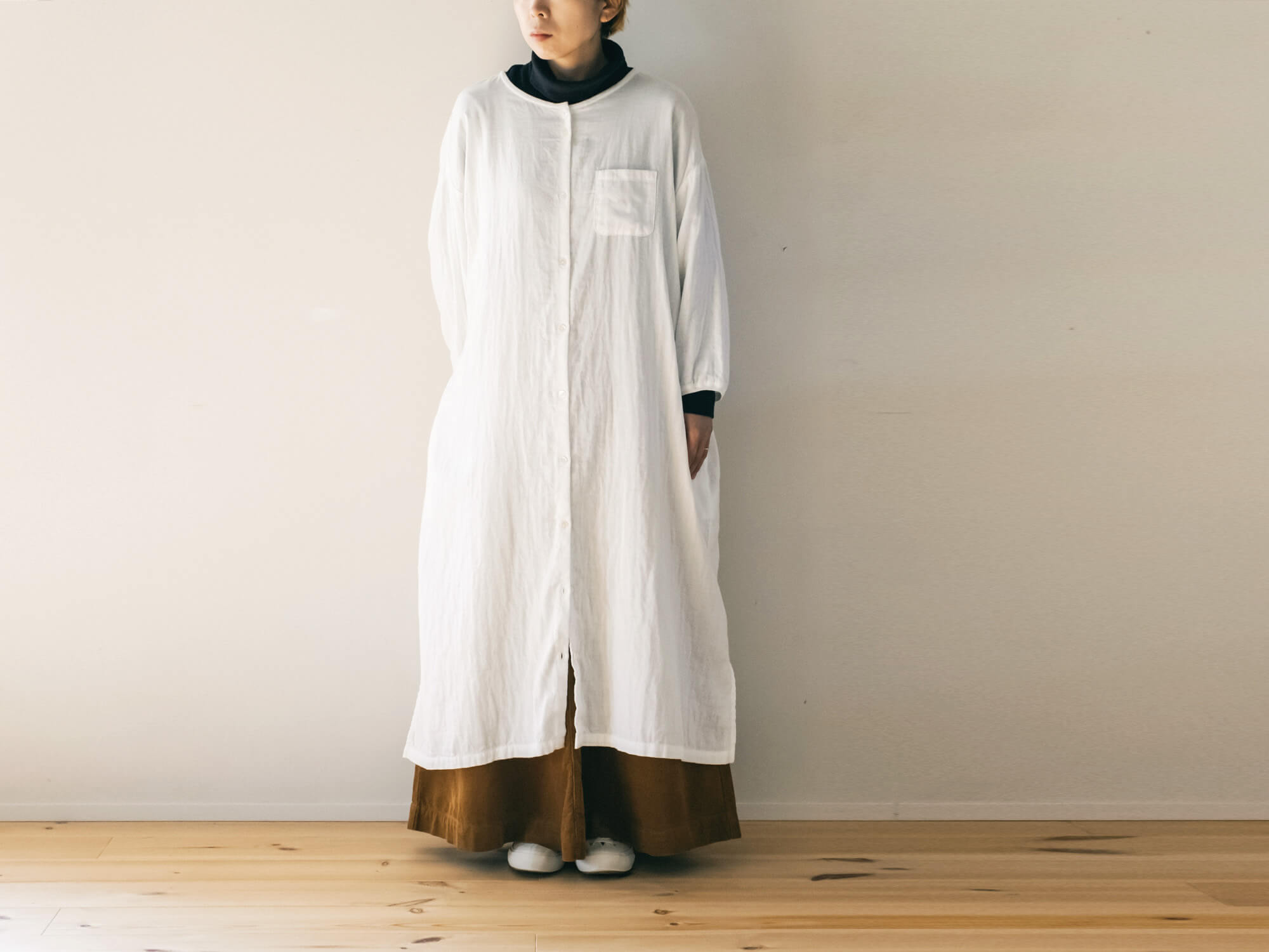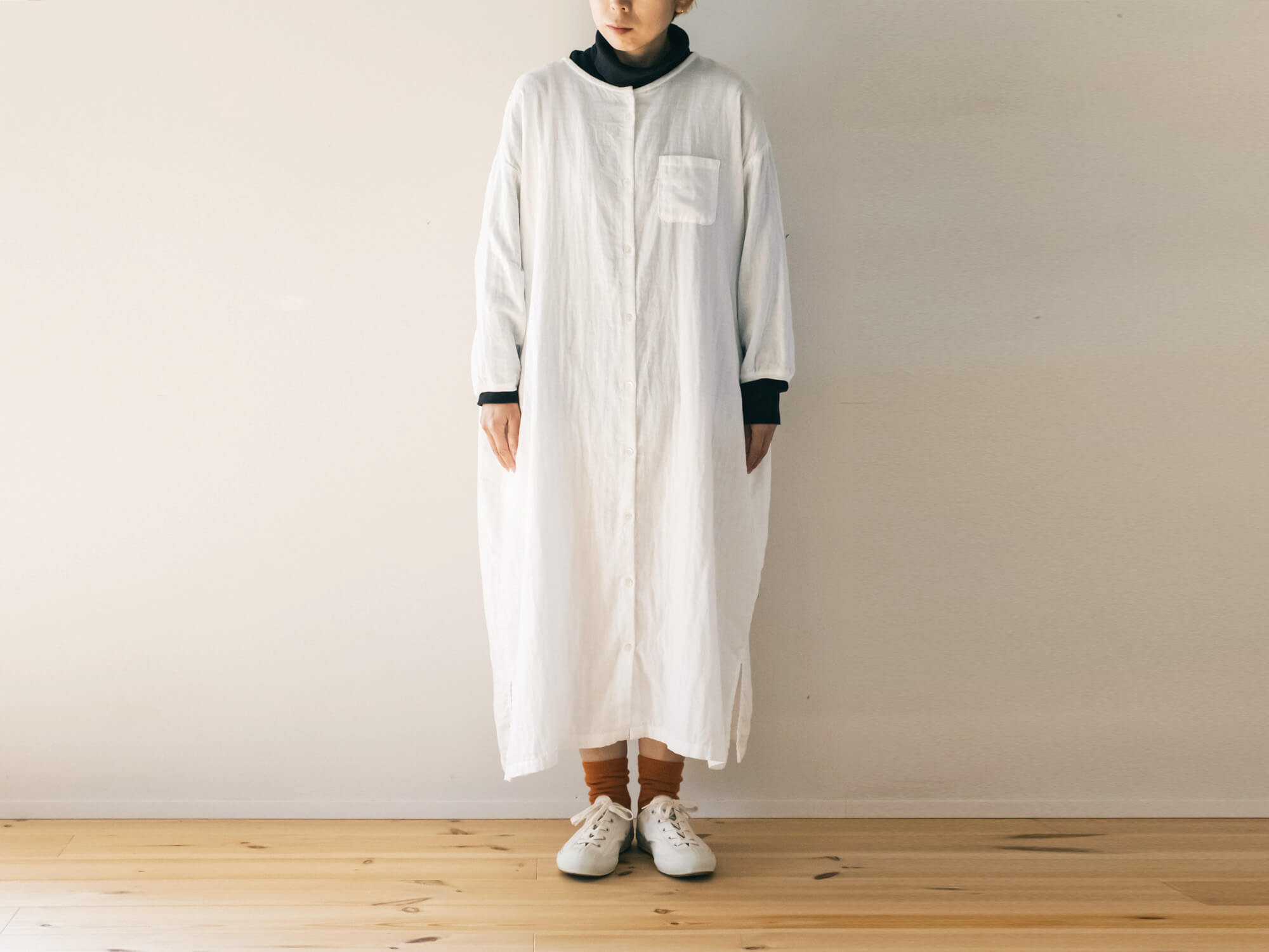 このノーカラーワンピースは、コットン100%のダブルガーゼ生地を使用。ふんわりと空気を含んだような軽やかさで、素肌にもやさしい心地よさです。着るたびに柔らかく、洗うたびに馴染んでいく、そんな風合いの変化を楽しめます。