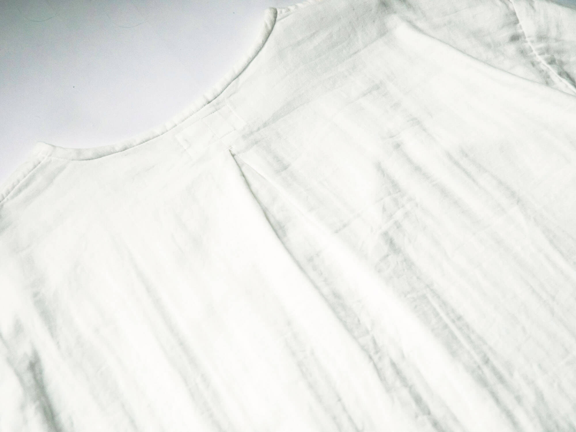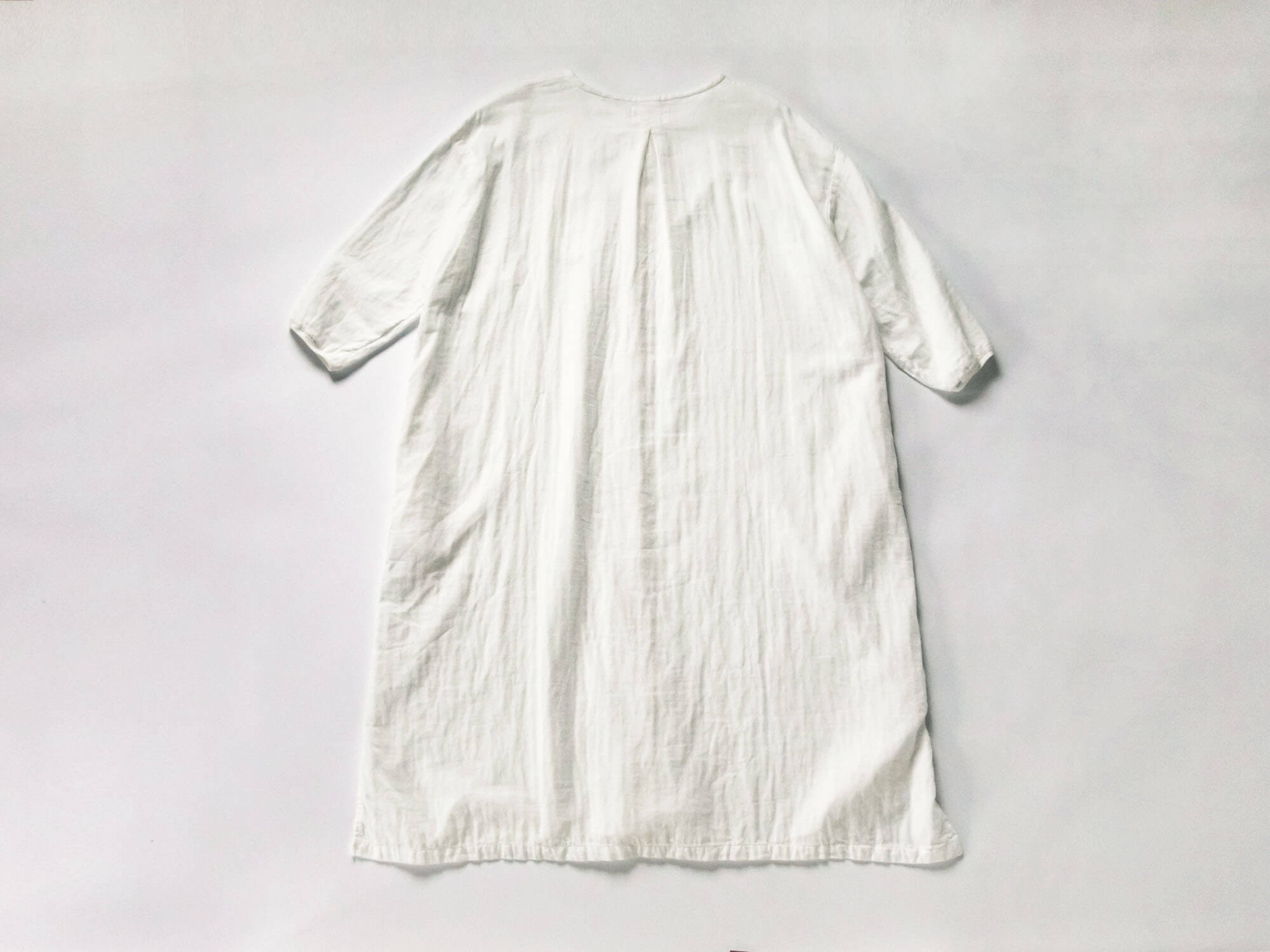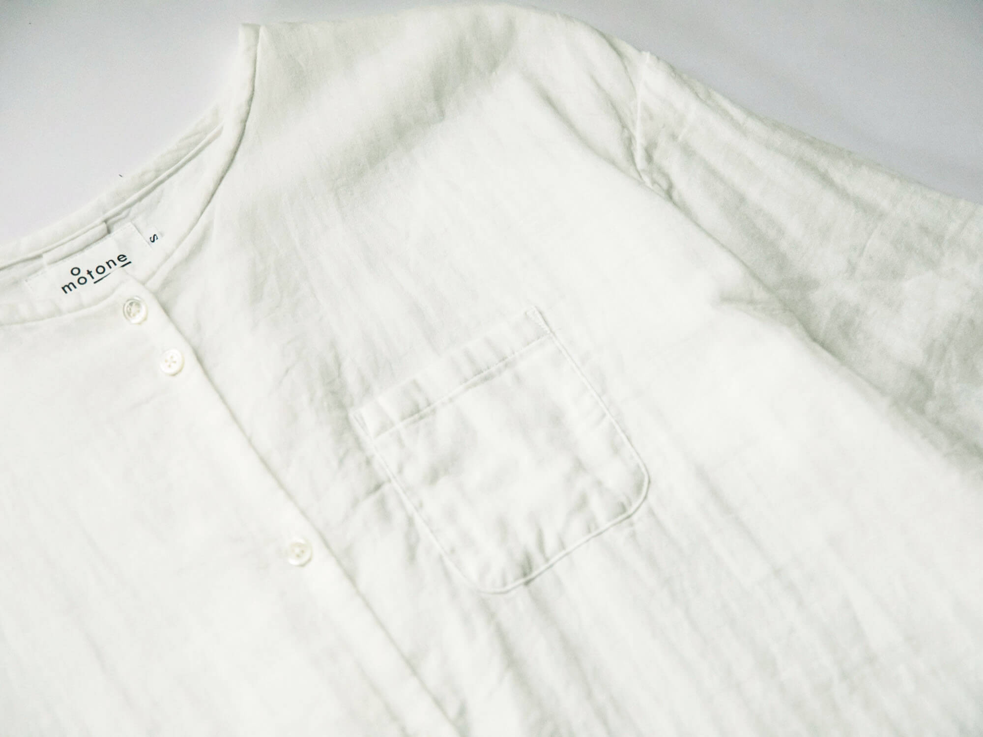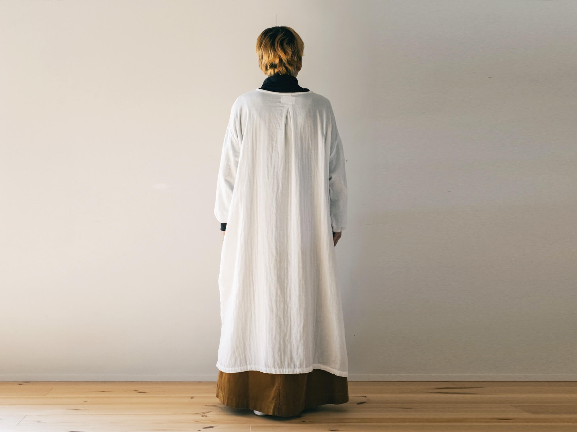 このノーカラーワンピースは、コットン100%のダブルガーゼ生地を使用。ふんわりと空気を含んだような軽やかさで、素肌にもやさしい心地よさです。着るたびに柔らかく、洗うたびに馴染んでいく、そんな風合いの変化を楽しめます。