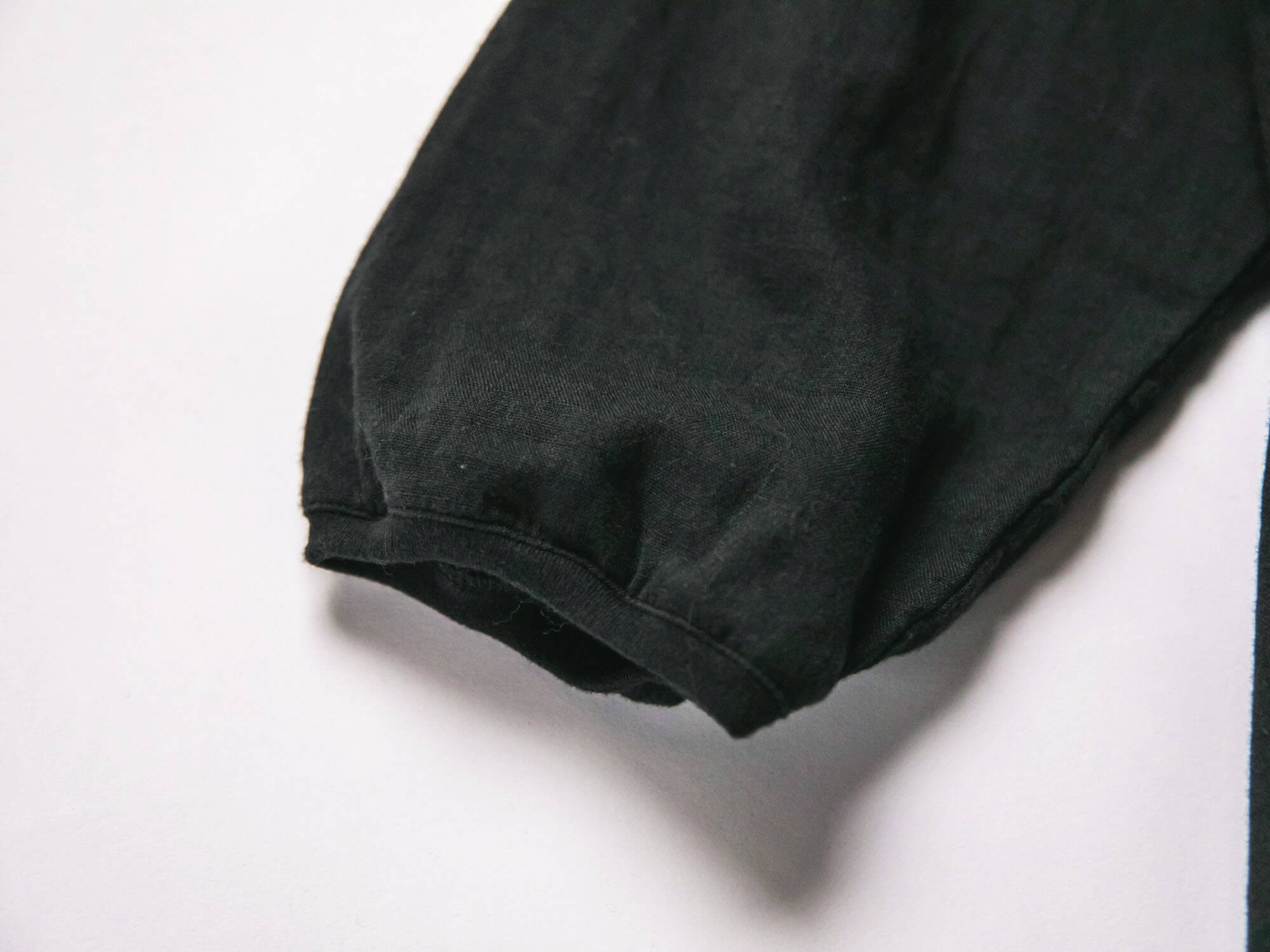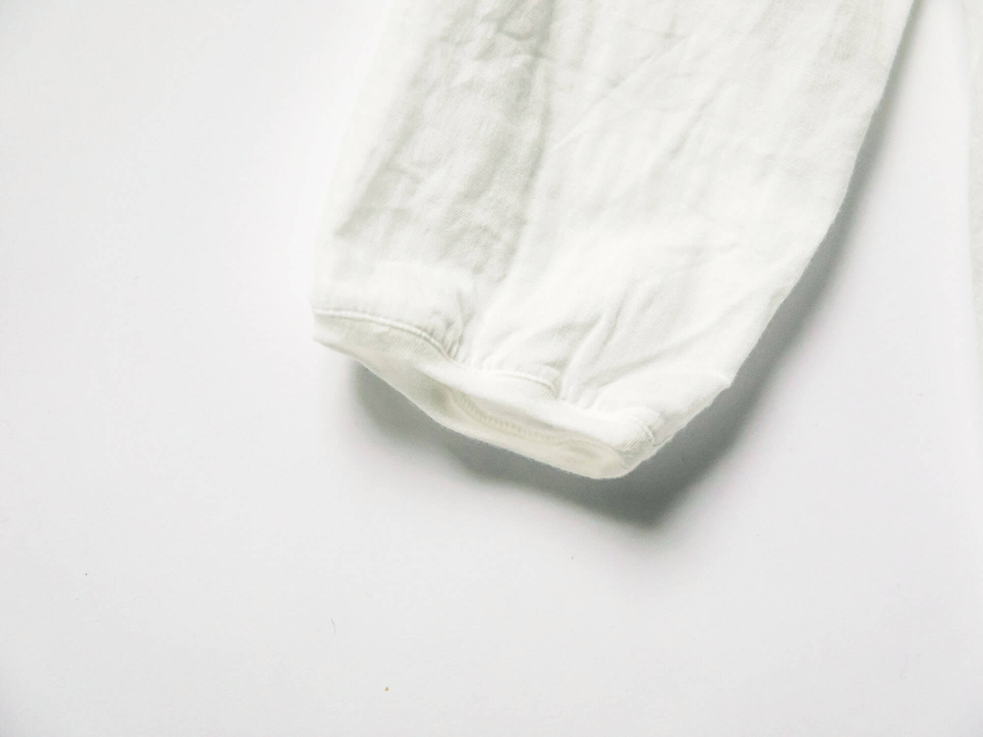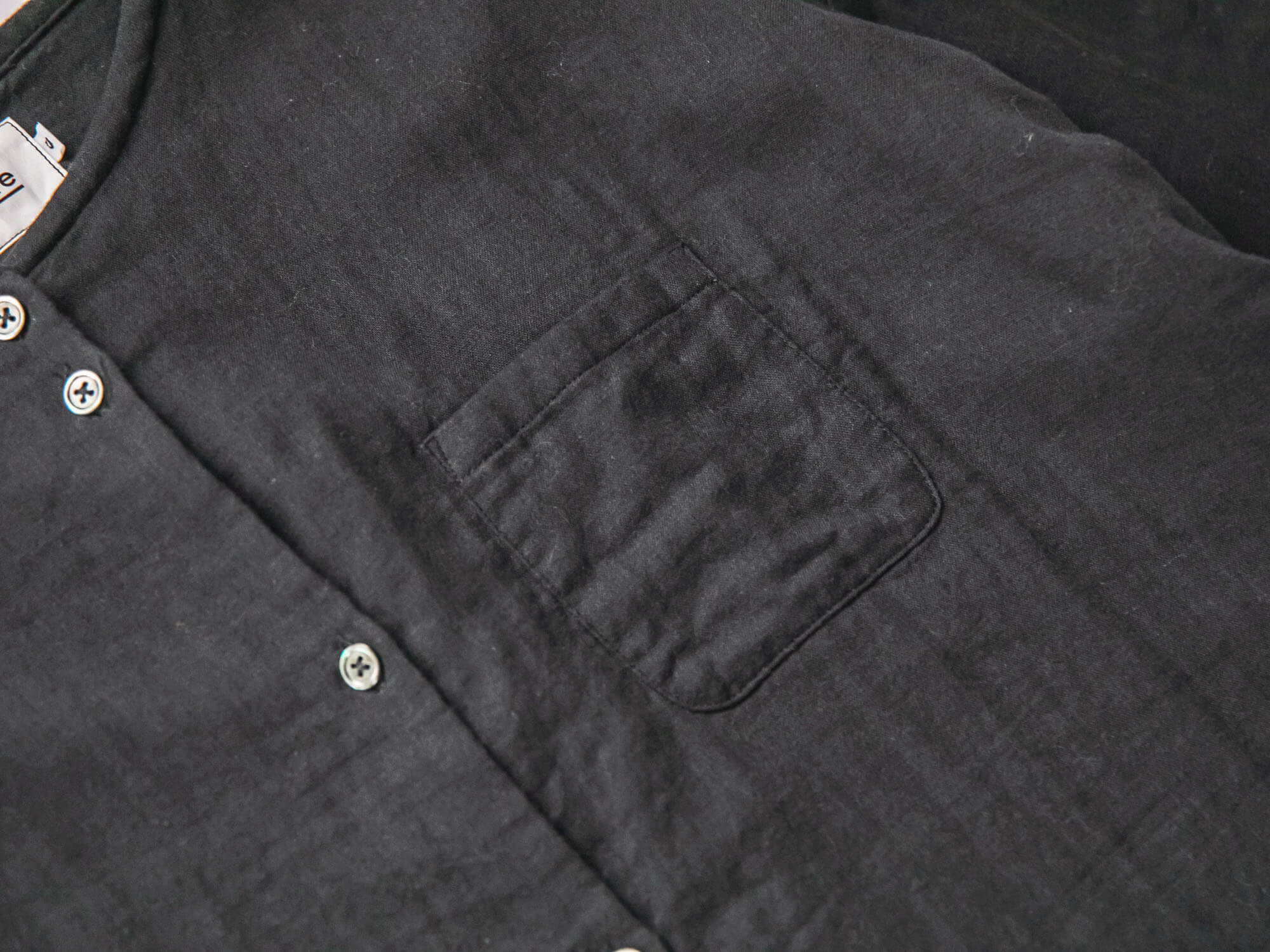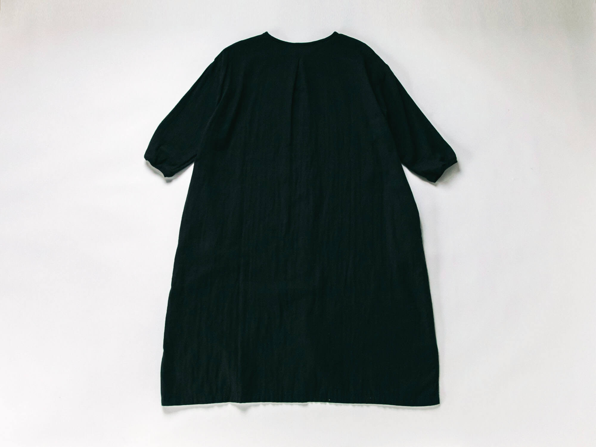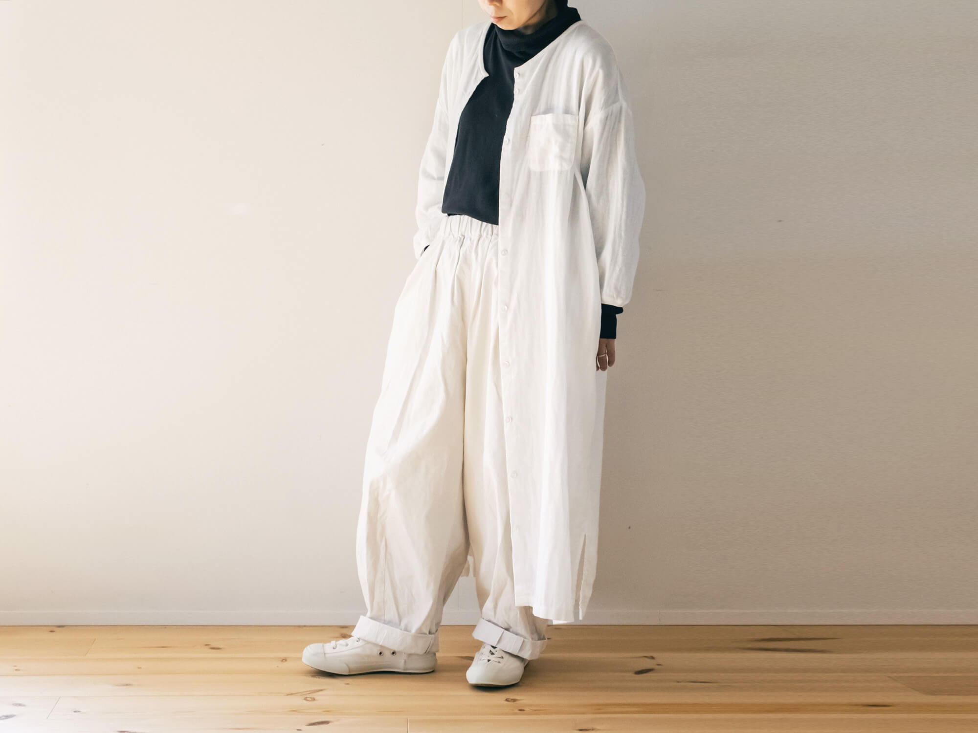 このノーカラーワンピースは、コットン100%のダブルガーゼ生地を使用。ふんわりと空気を含んだような軽やかさで、素肌にもやさしい心地よさです。着るたびに柔らかく、洗うたびに馴染んでいく、そんな風合いの変化を楽しめます。