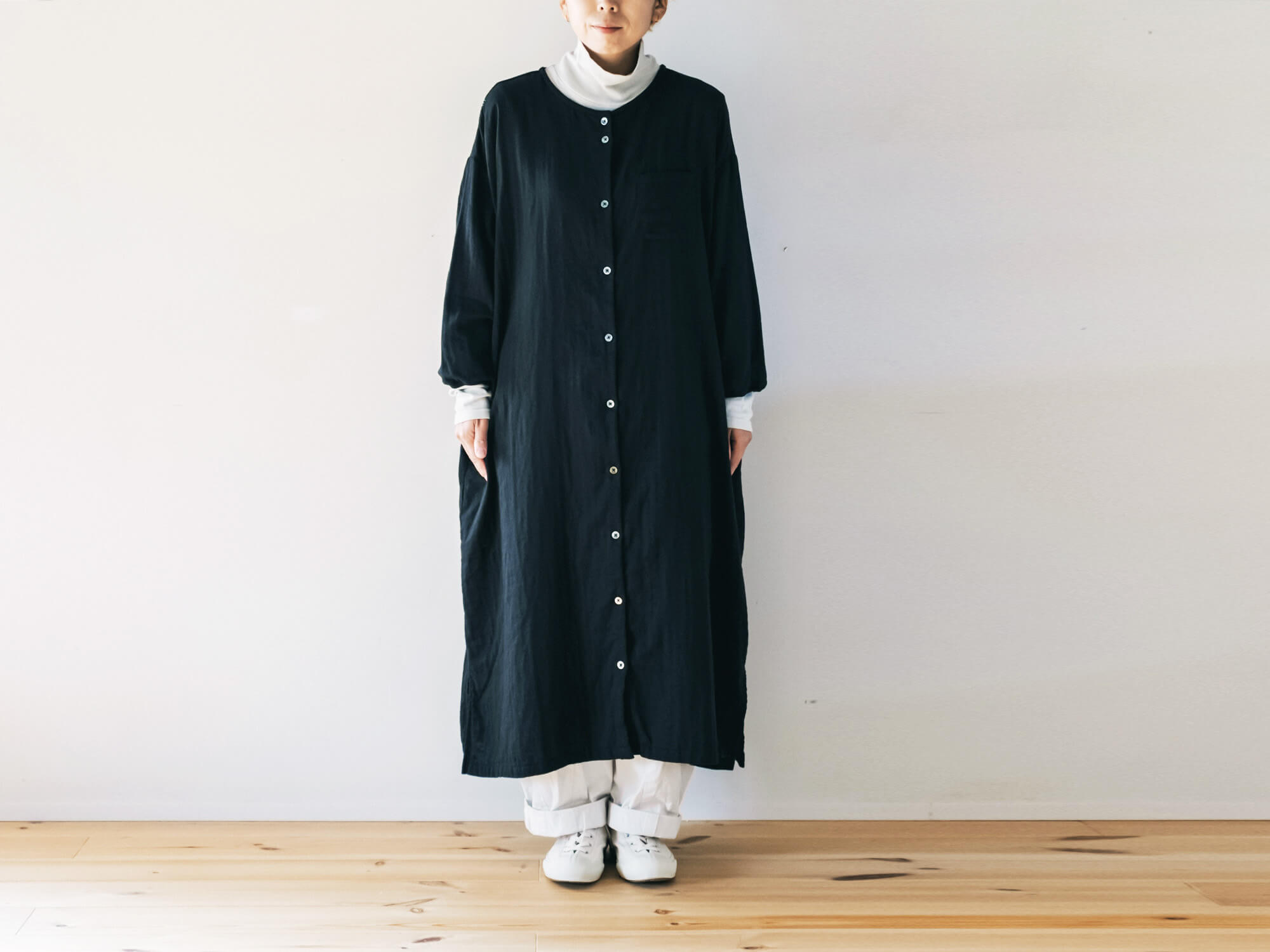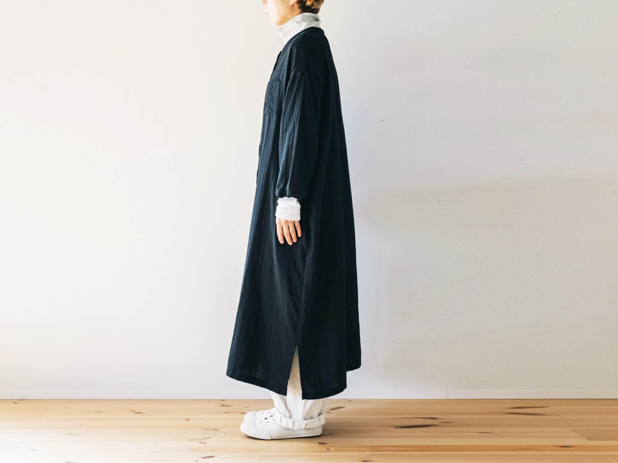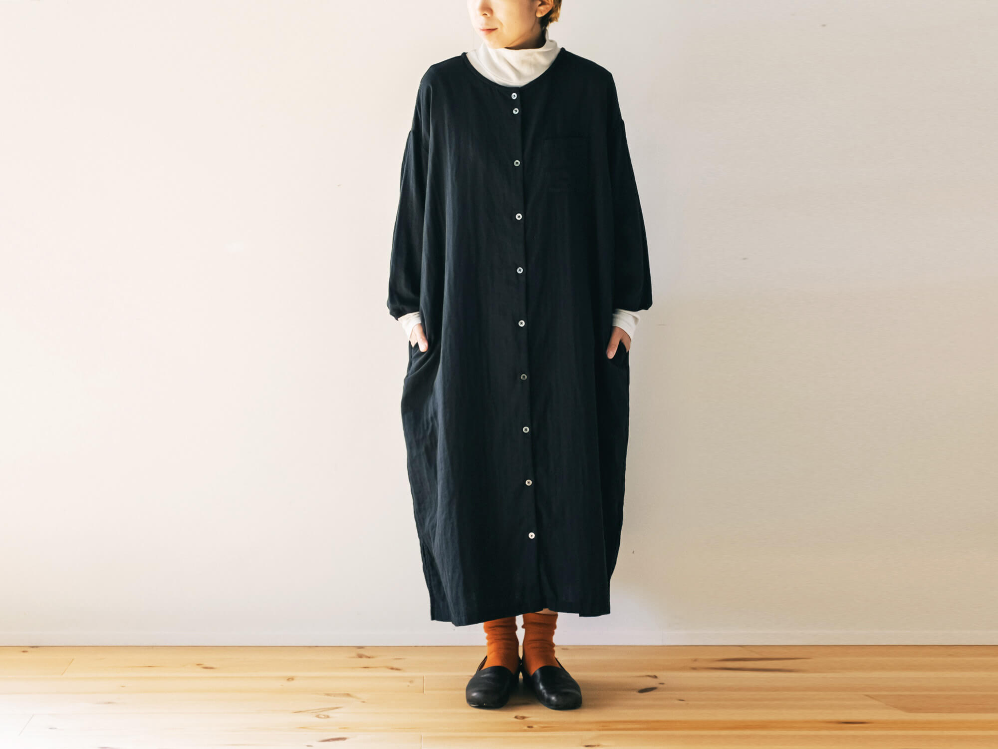 前開き仕様なので、ボタンを留めてワンピースとして。また、さらりと羽織れば、軽いコートのような感覚でも使えます。重ね着しやすい9分袖で、季節の移ろいにも寄り添う一着です。