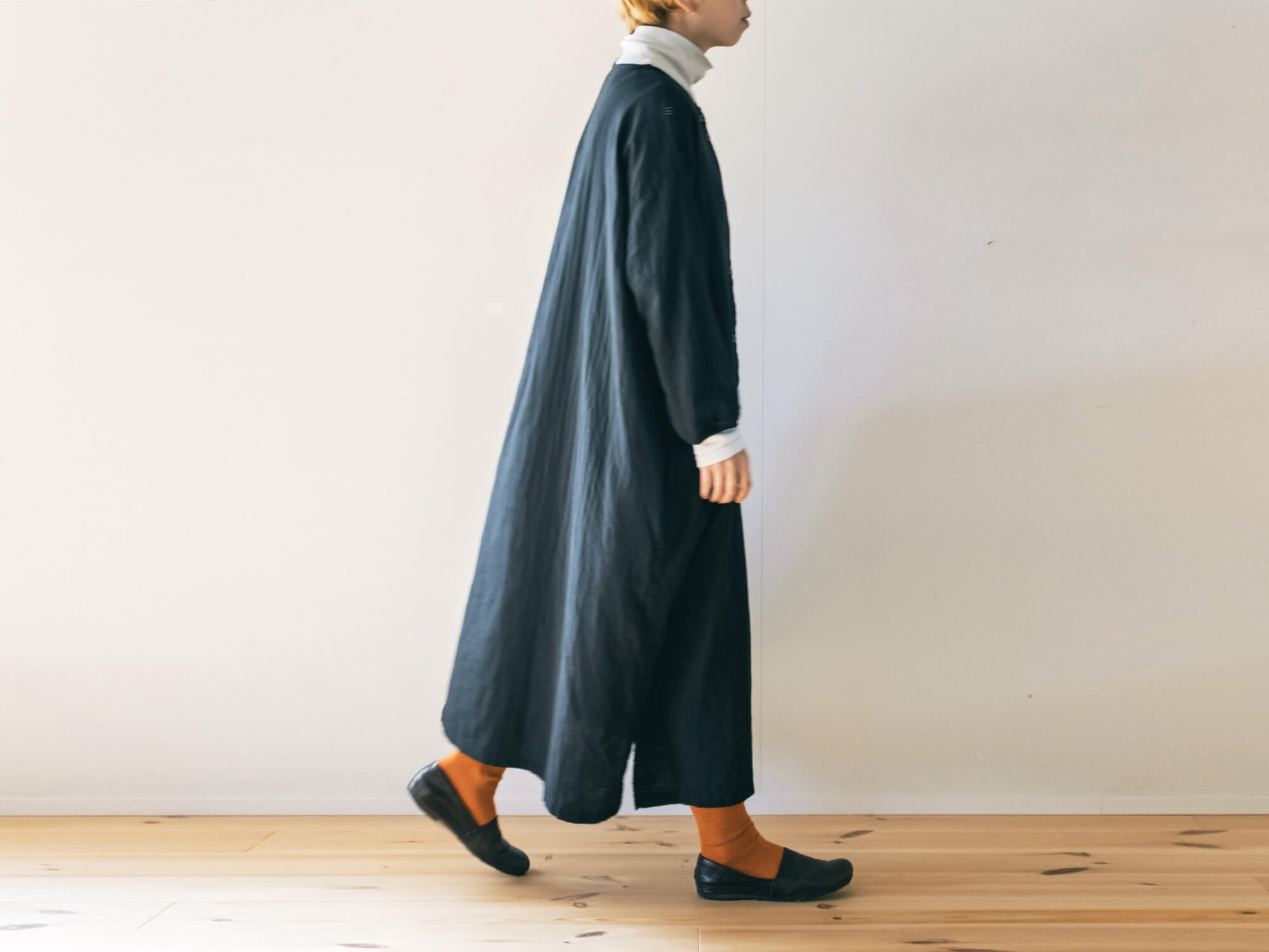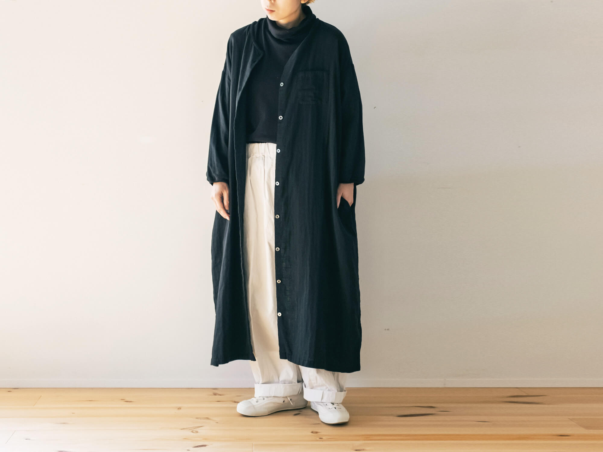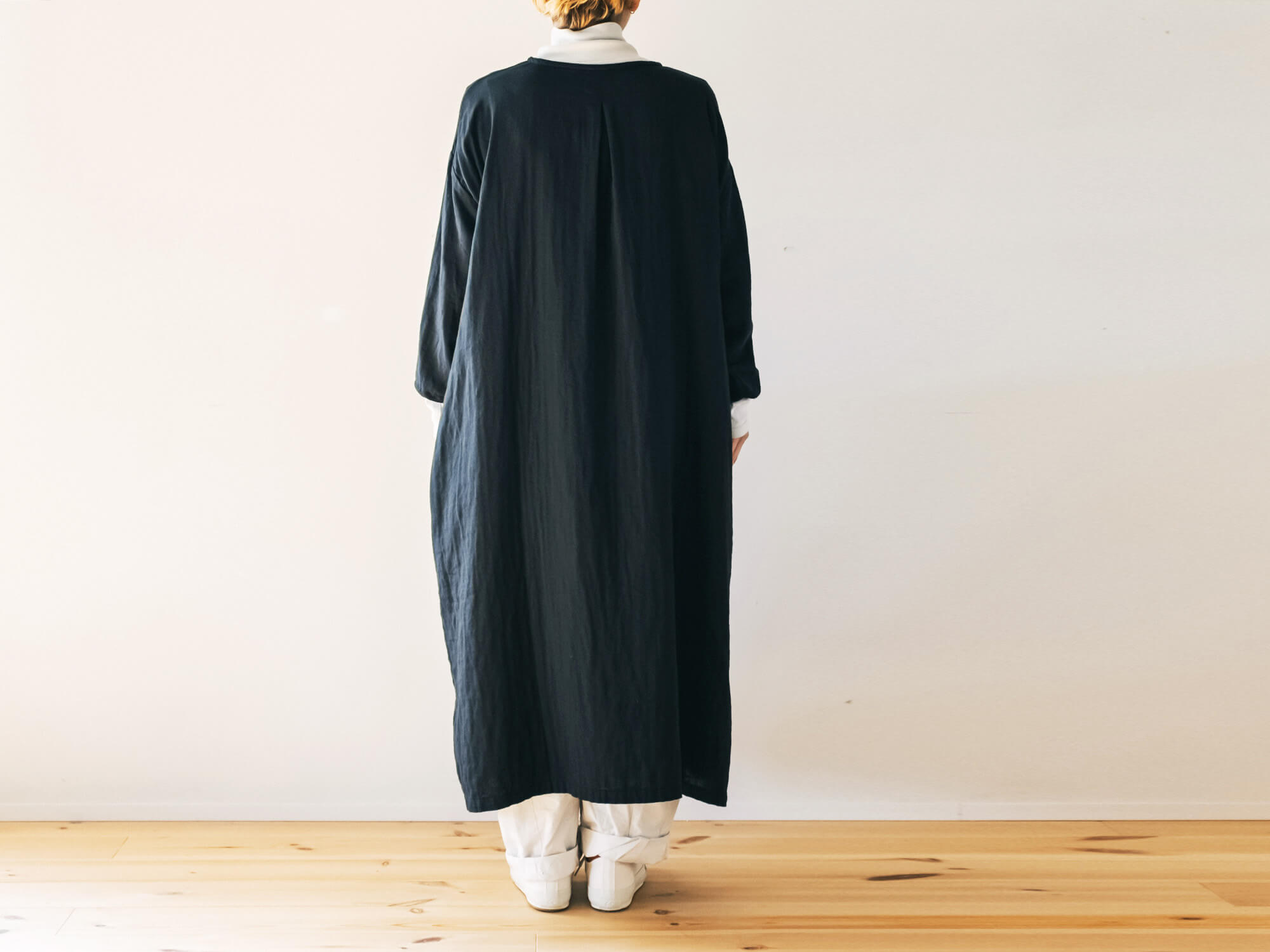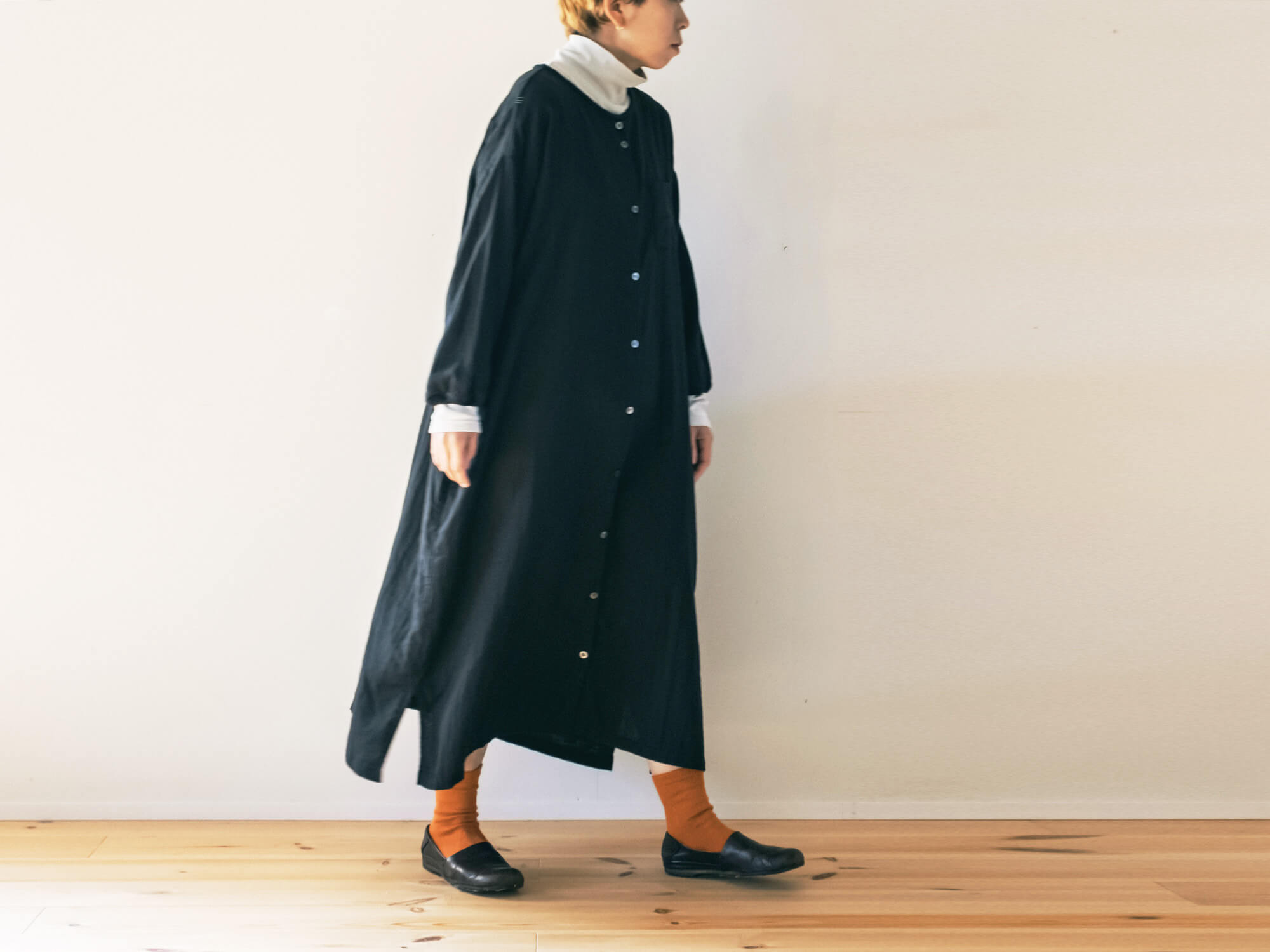 前開き仕様なので、ボタンを留めてワンピースとして。また、さらりと羽織れば、軽いコートのような感覚でも使えます。重ね着しやすい9分袖で、季節の移ろいにも寄り添う一着です。