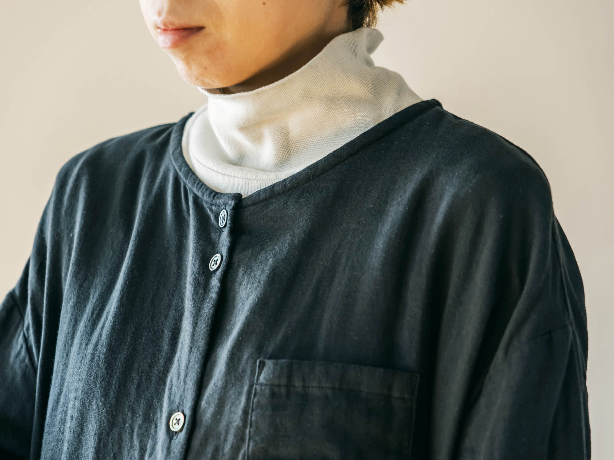 首元をすっきり見せるノーカラーに、ゆとりを持たせたシルエット。袖口のリブは、締め付けすぎず、手首にそっと沿うように仕立てられています。
