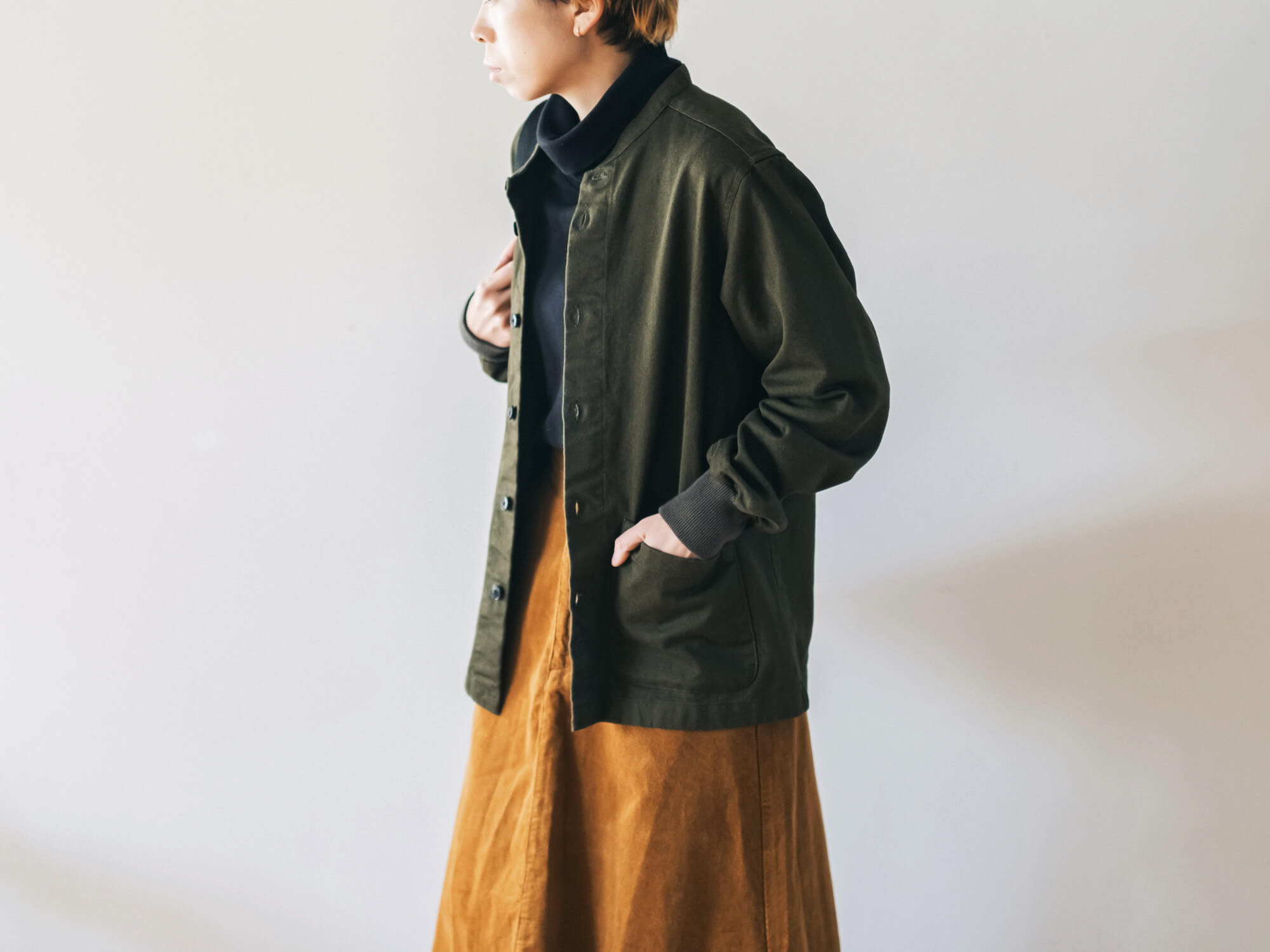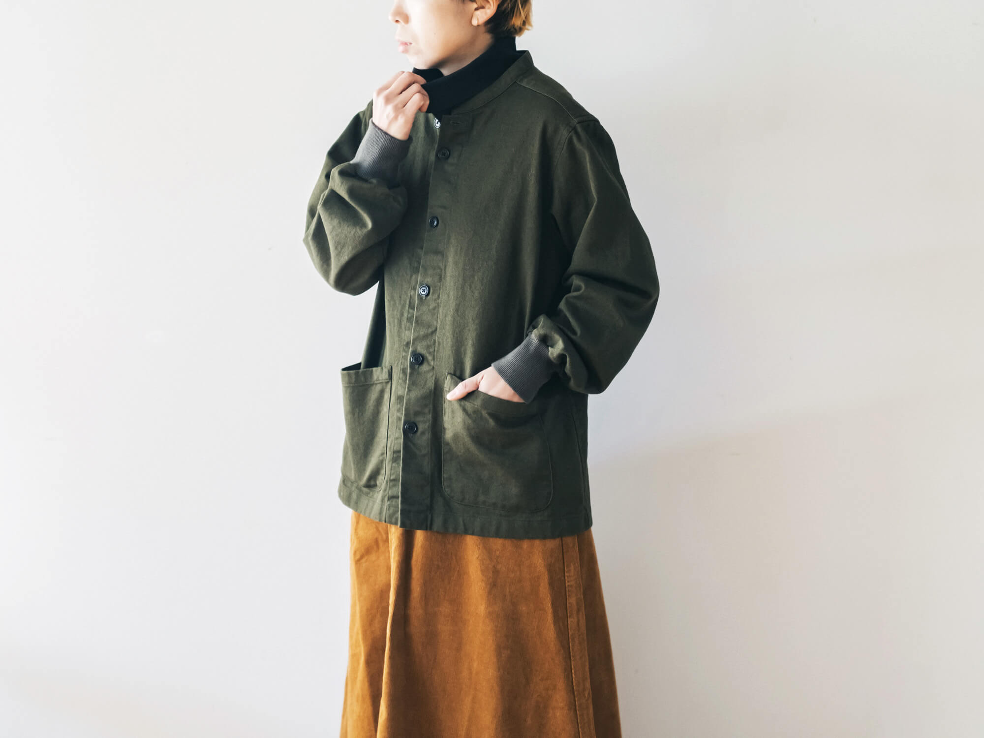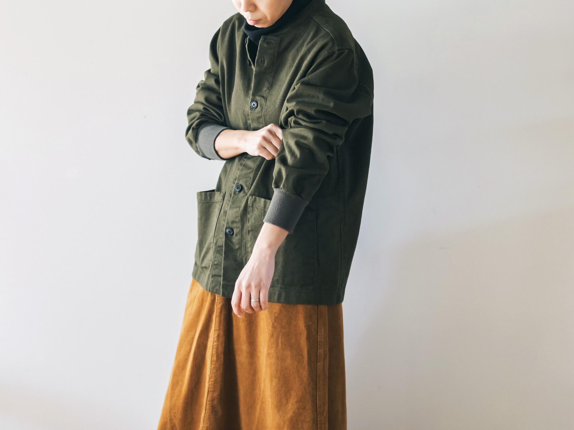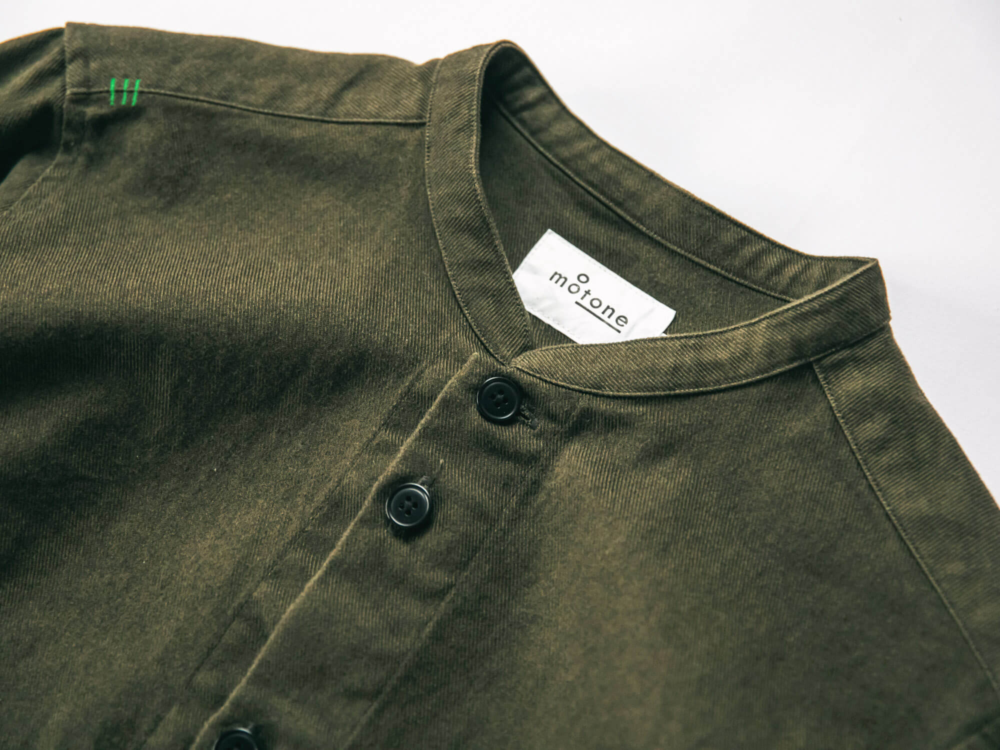 motoneのカバーシャツは、ベーシックでありながら、どこか優しさを感じる佇まい。丸みのあるスタンドカラーや、袖口のリブ、ゆったりとした身幅が絶妙なバランスです。