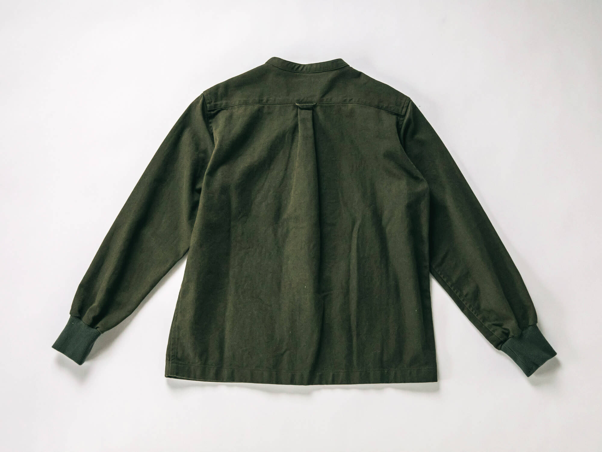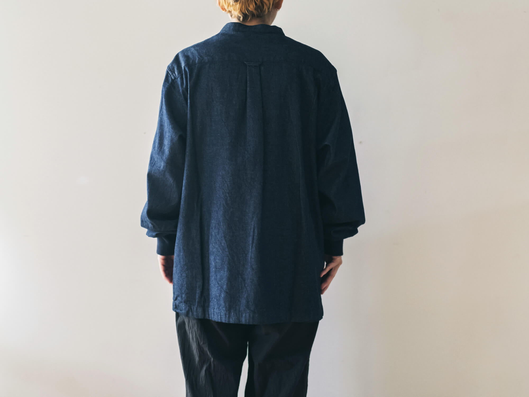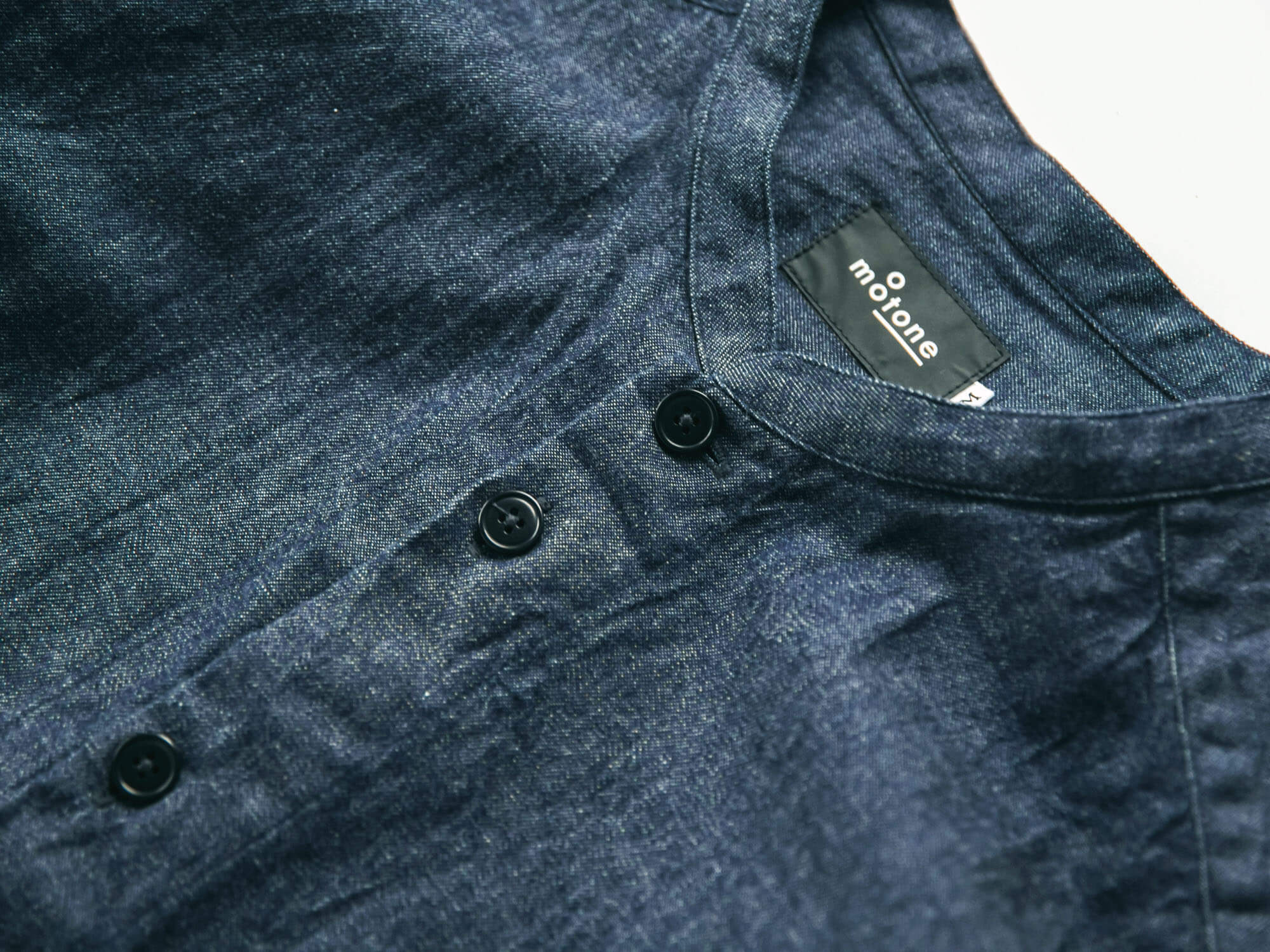 motoneのカバーシャツは、ベーシックでありながら、どこか優しさを感じる佇まい。丸みのあるスタンドカラーや、袖口のリブ、ゆったりとした身幅が絶妙なバランスです。