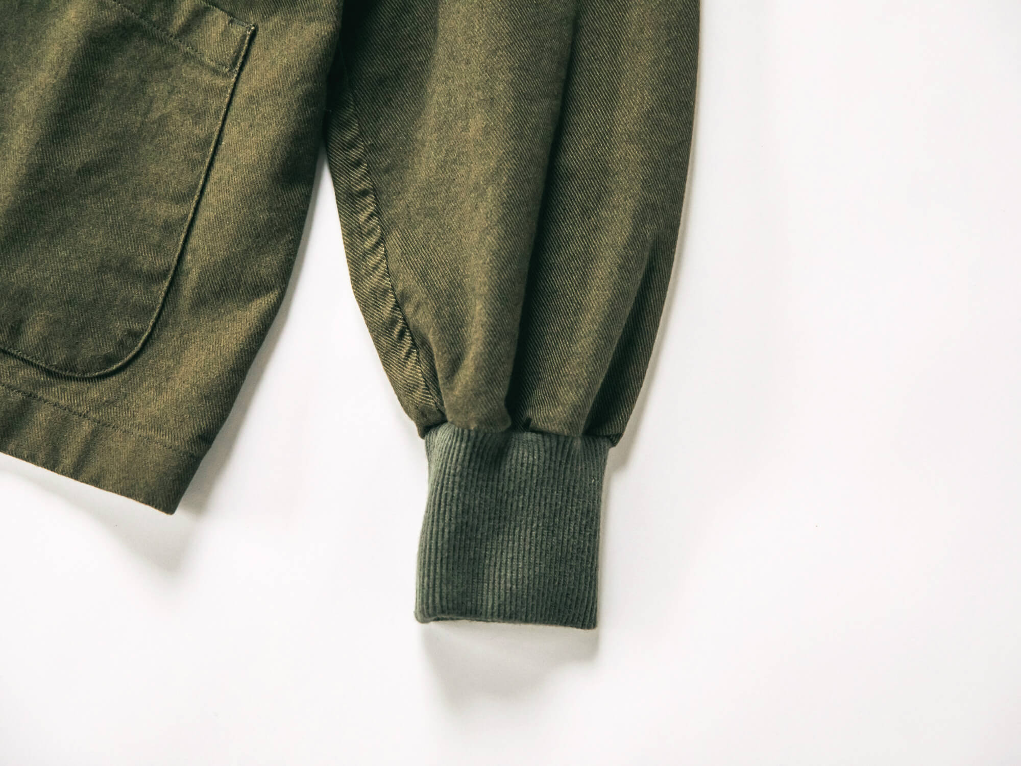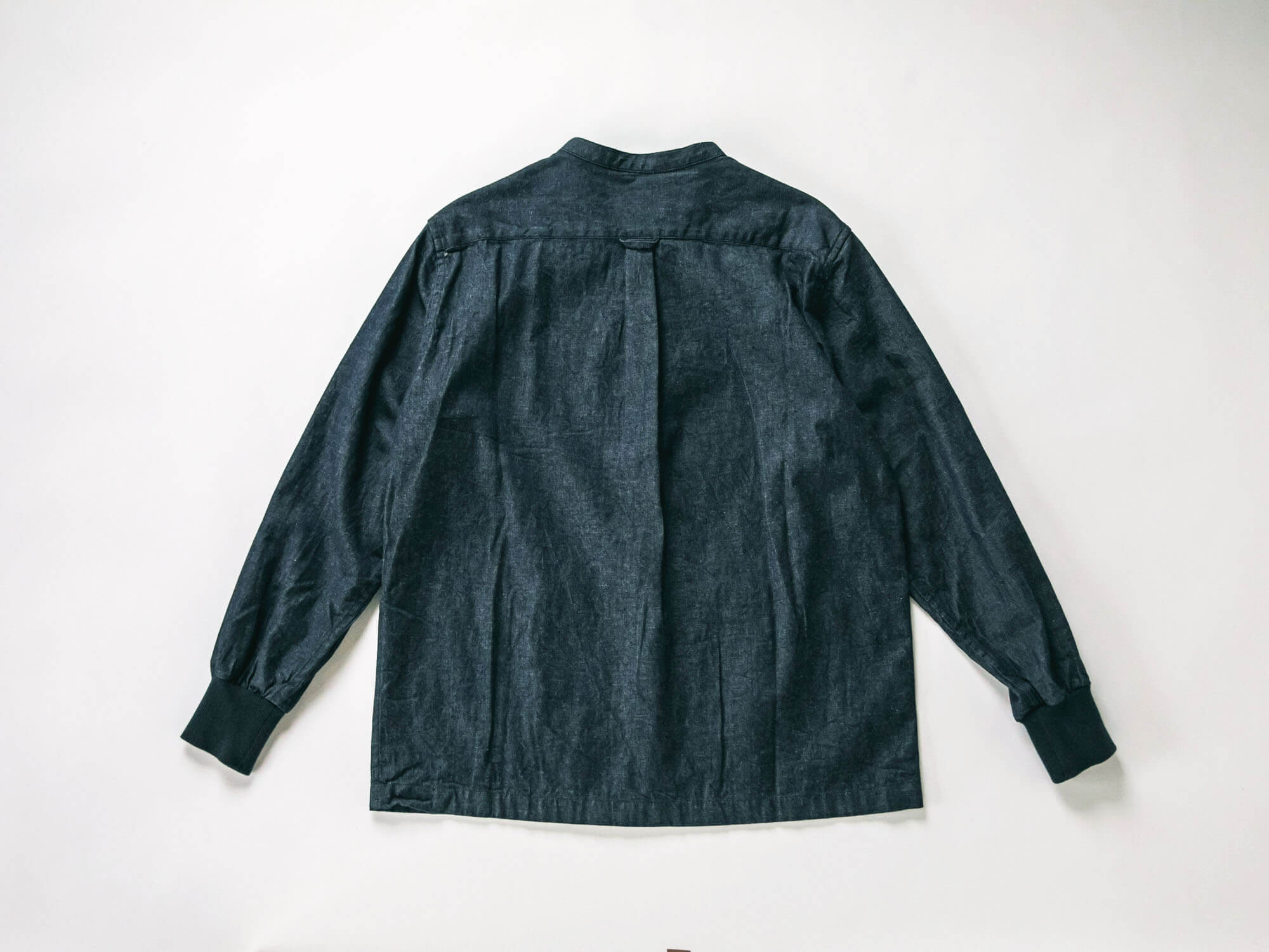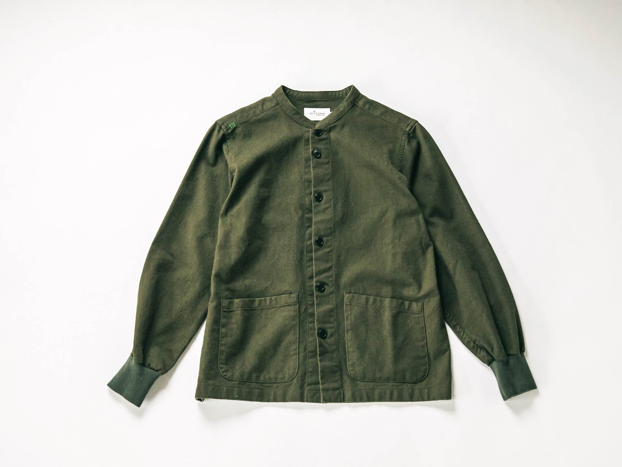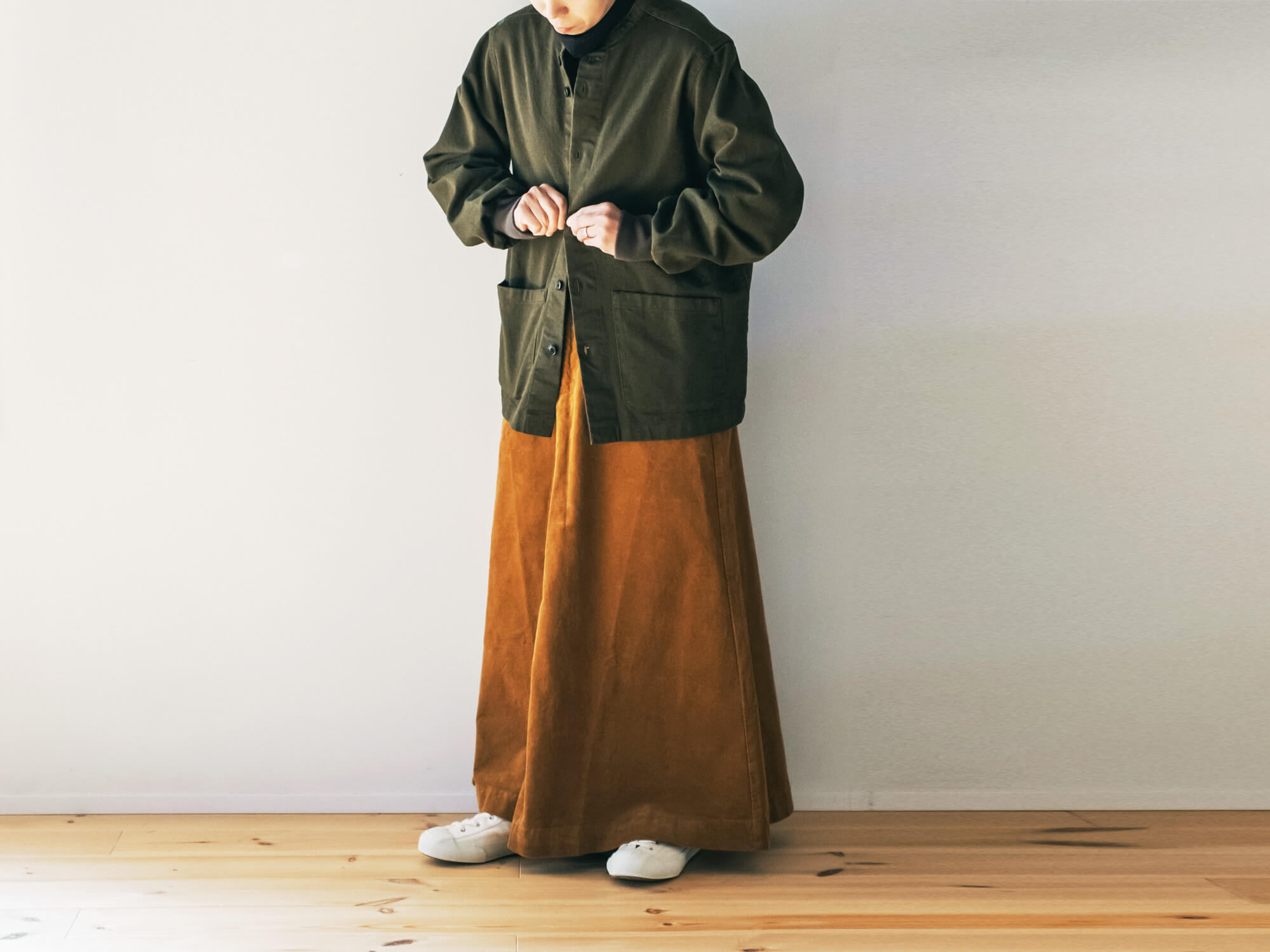 motoneのカバーシャツは、ベーシックでありながら、どこか優しさを感じる佇まい。丸みのあるスタンドカラーや、袖口のリブ、ゆったりとした身幅が絶妙なバランスです。