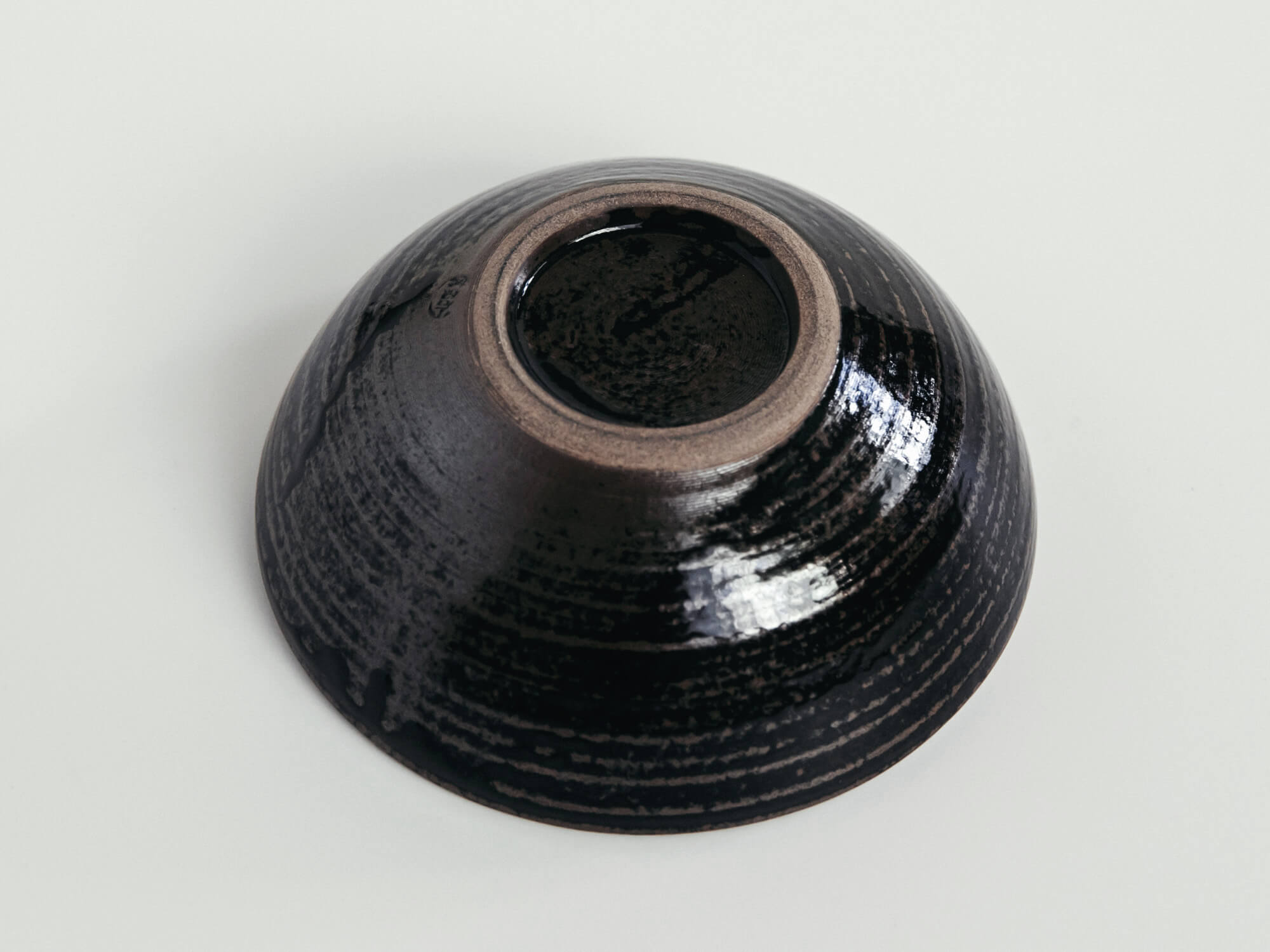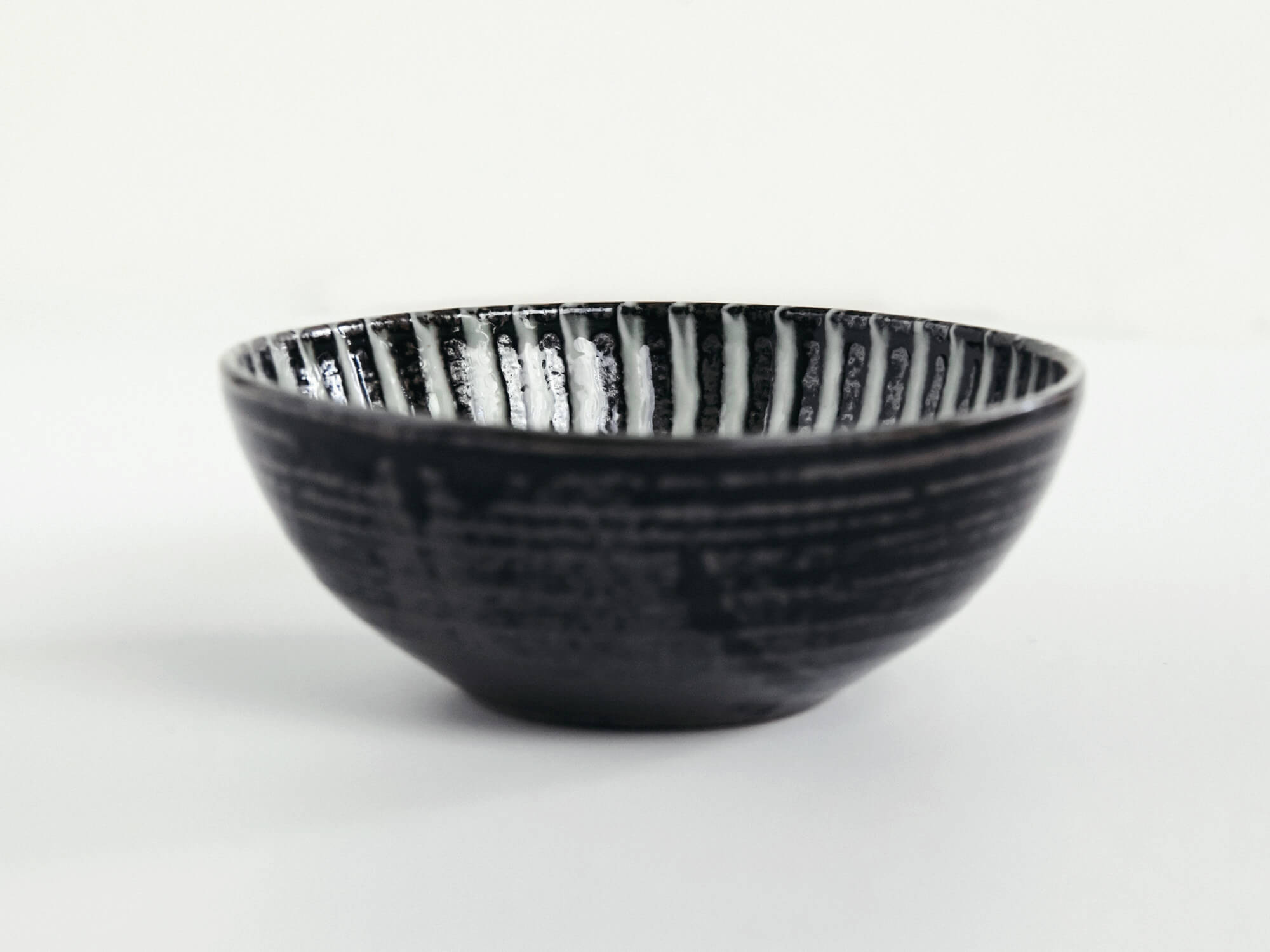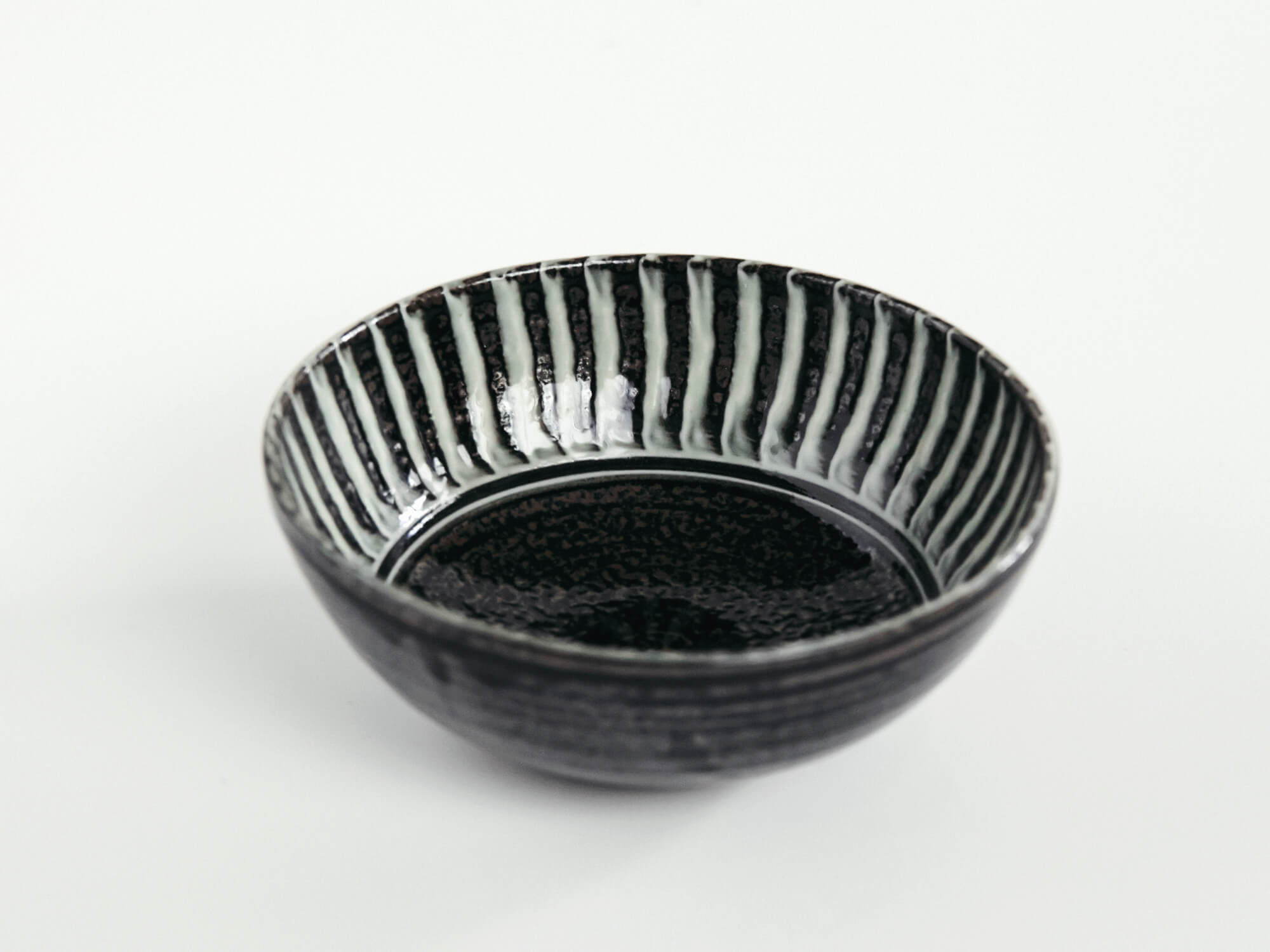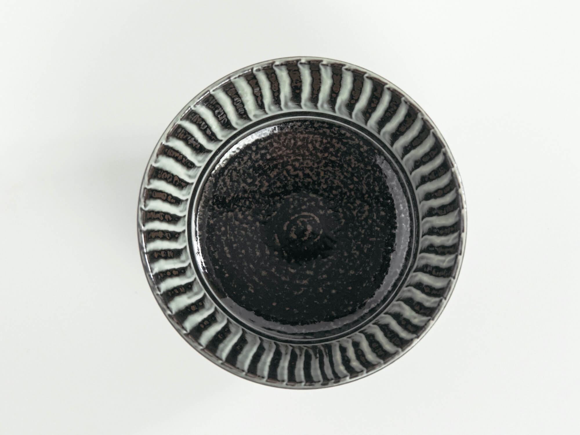 釉薬を刷毛で塗り重ねた「刷毛目」と、艶のある黒釉のコントラストが美しい一枚。外側の縞模様には動きがあり、内側はしっとりと落ち着いた黒でまとめられ、盛りつけた料理を引き立ててくれます。和洋問わず使いやすい一枚です。