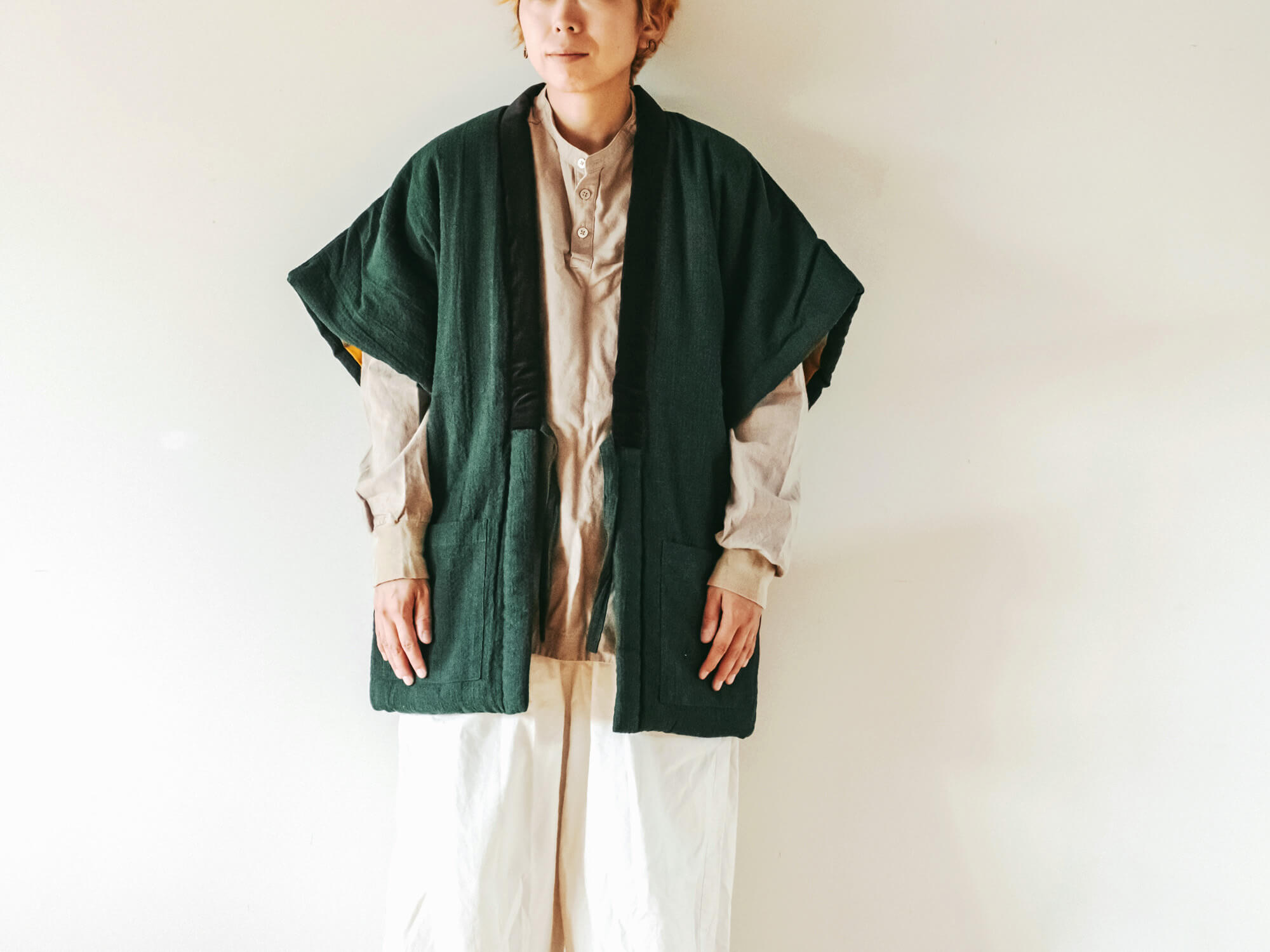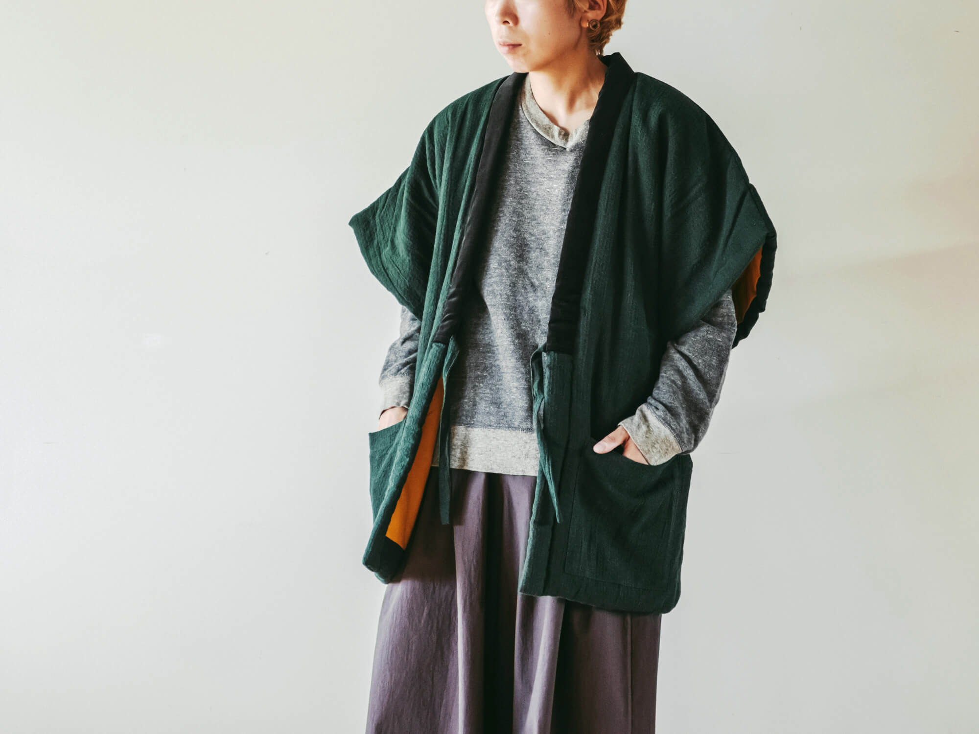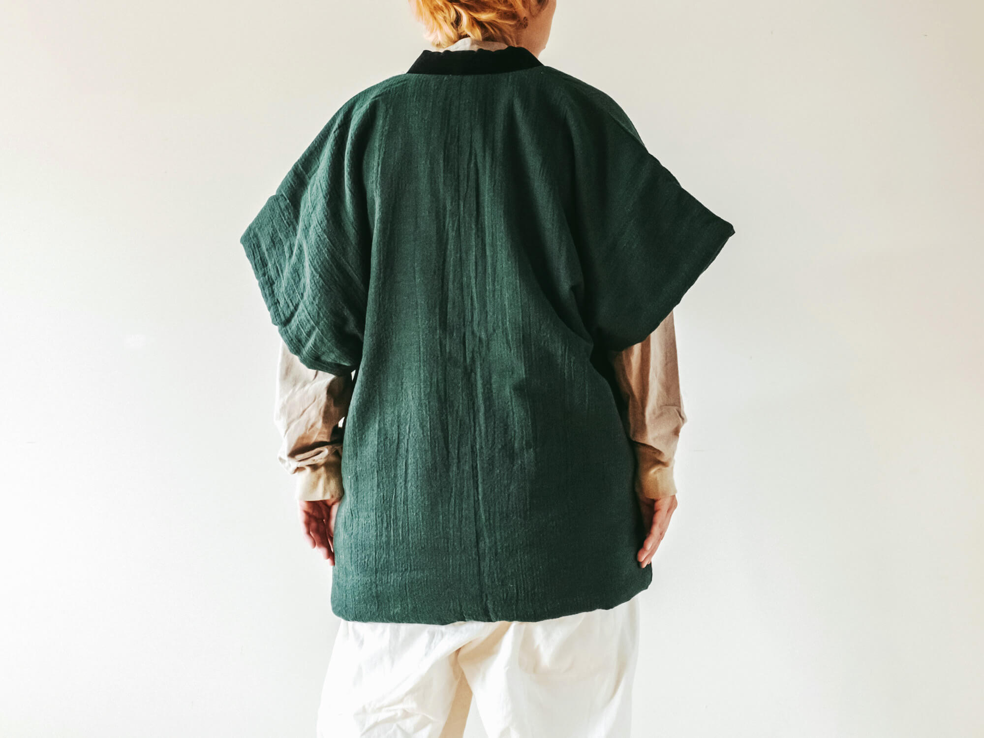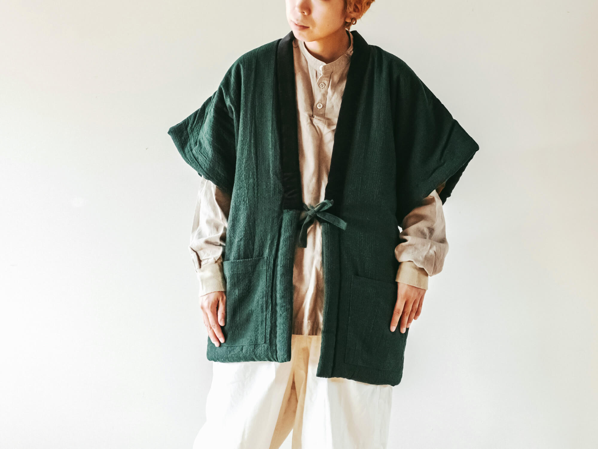 脈々はんてんに使用されている生地は、ムラ感のある糸が使用してあることで、はっきりとしたグリーンというよりは、少し曖昧な何とも言えない緑色が、四季によって変わる山のイメージや、まだまだこれからという段階の伝所鳩のイメージにもしっくりと当てはまったように思います。