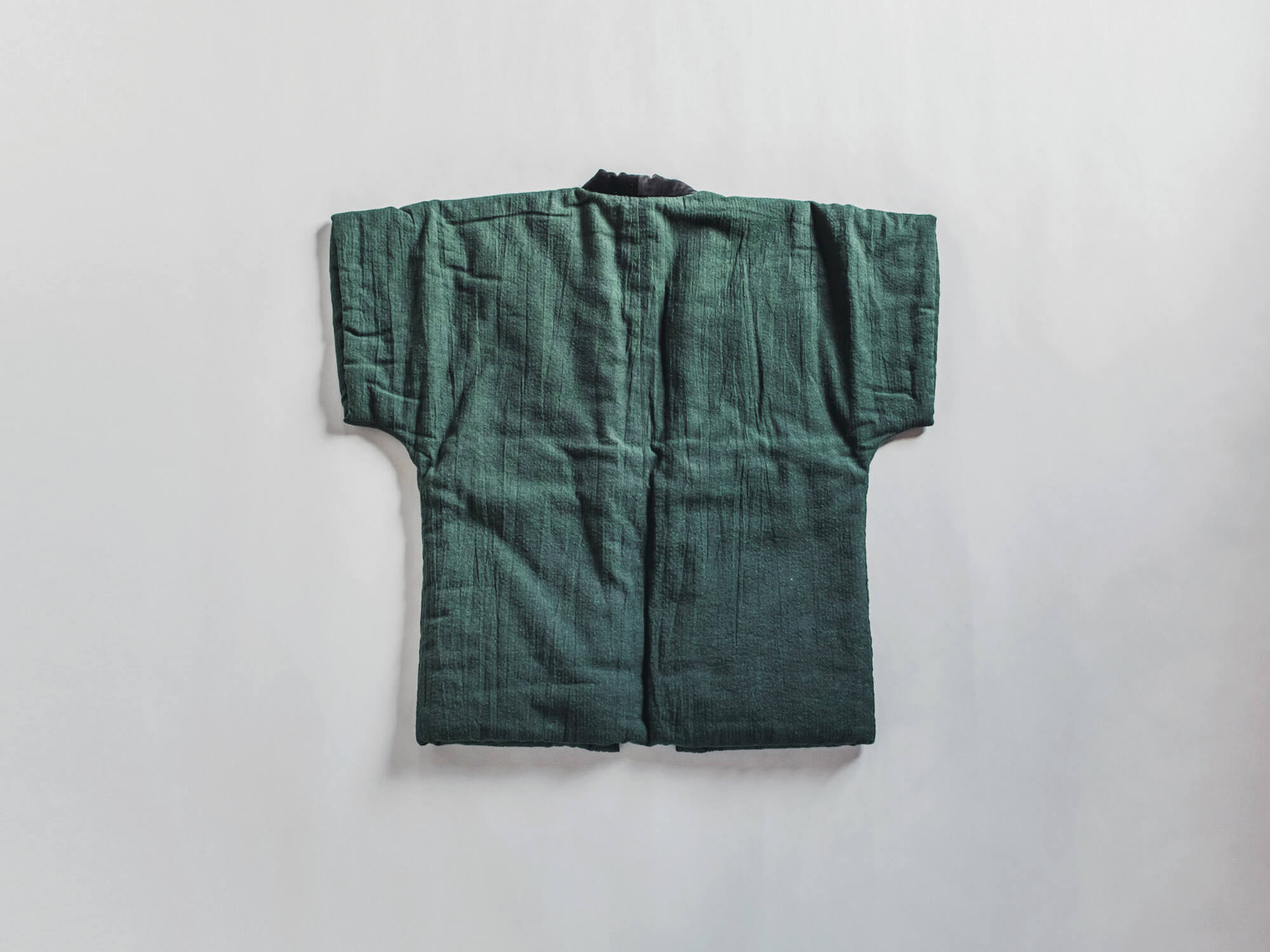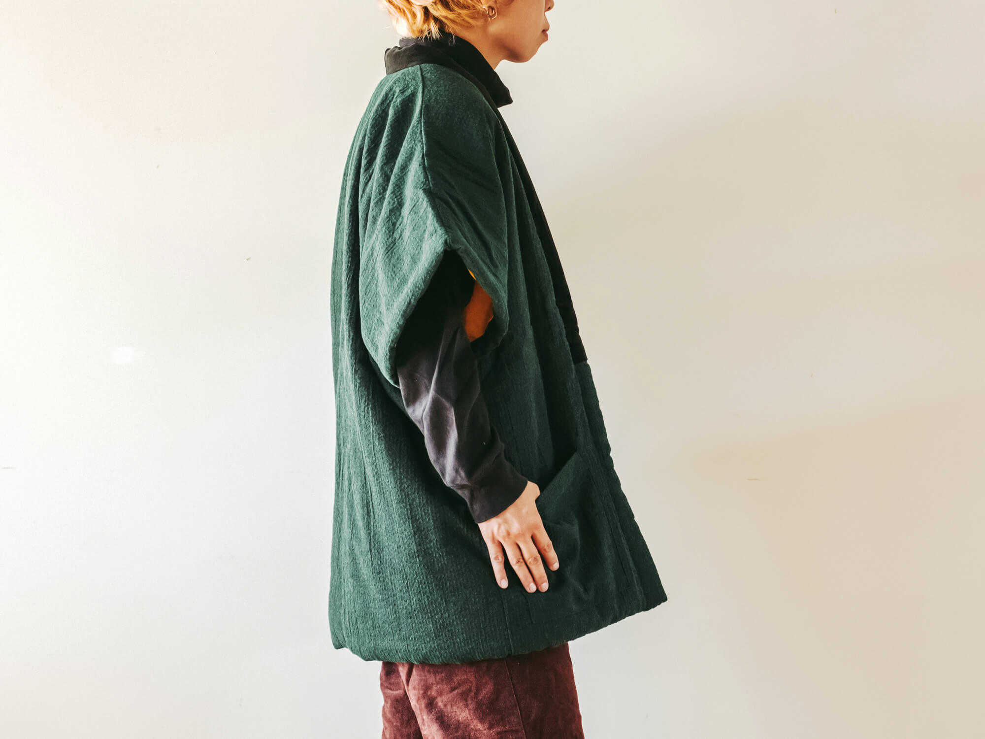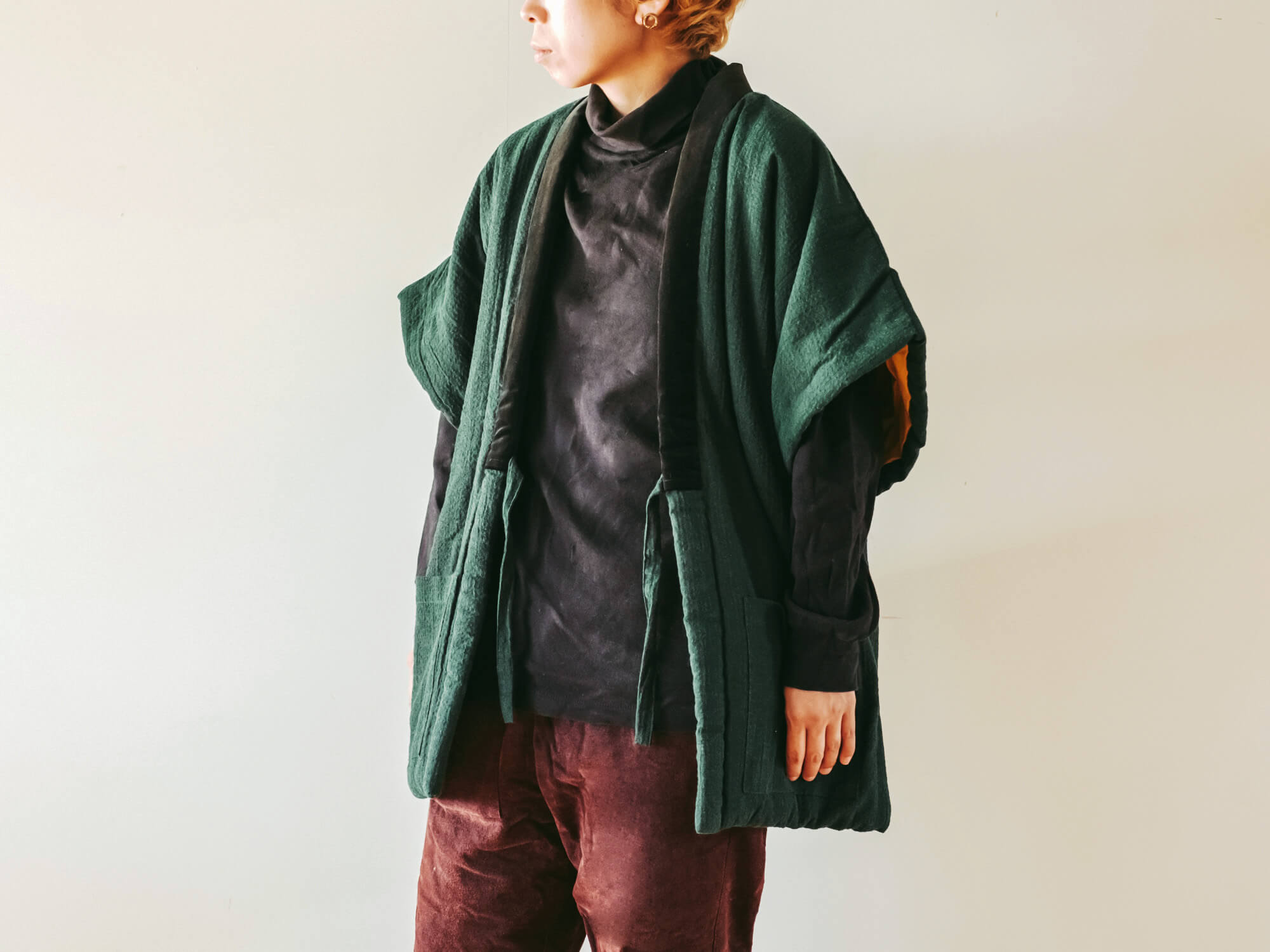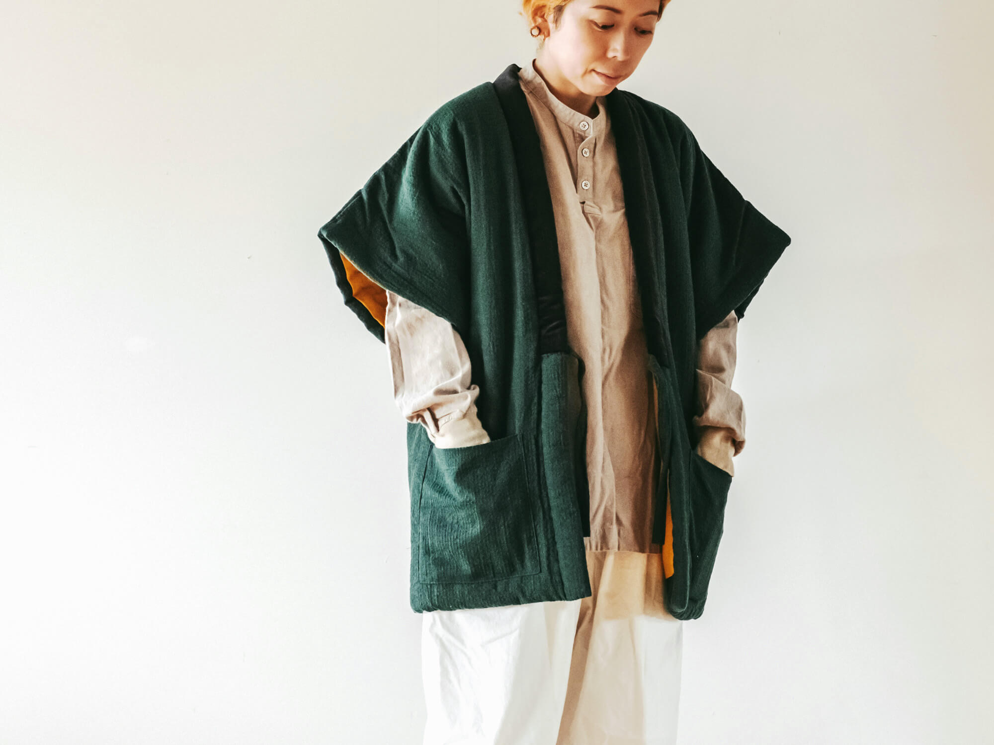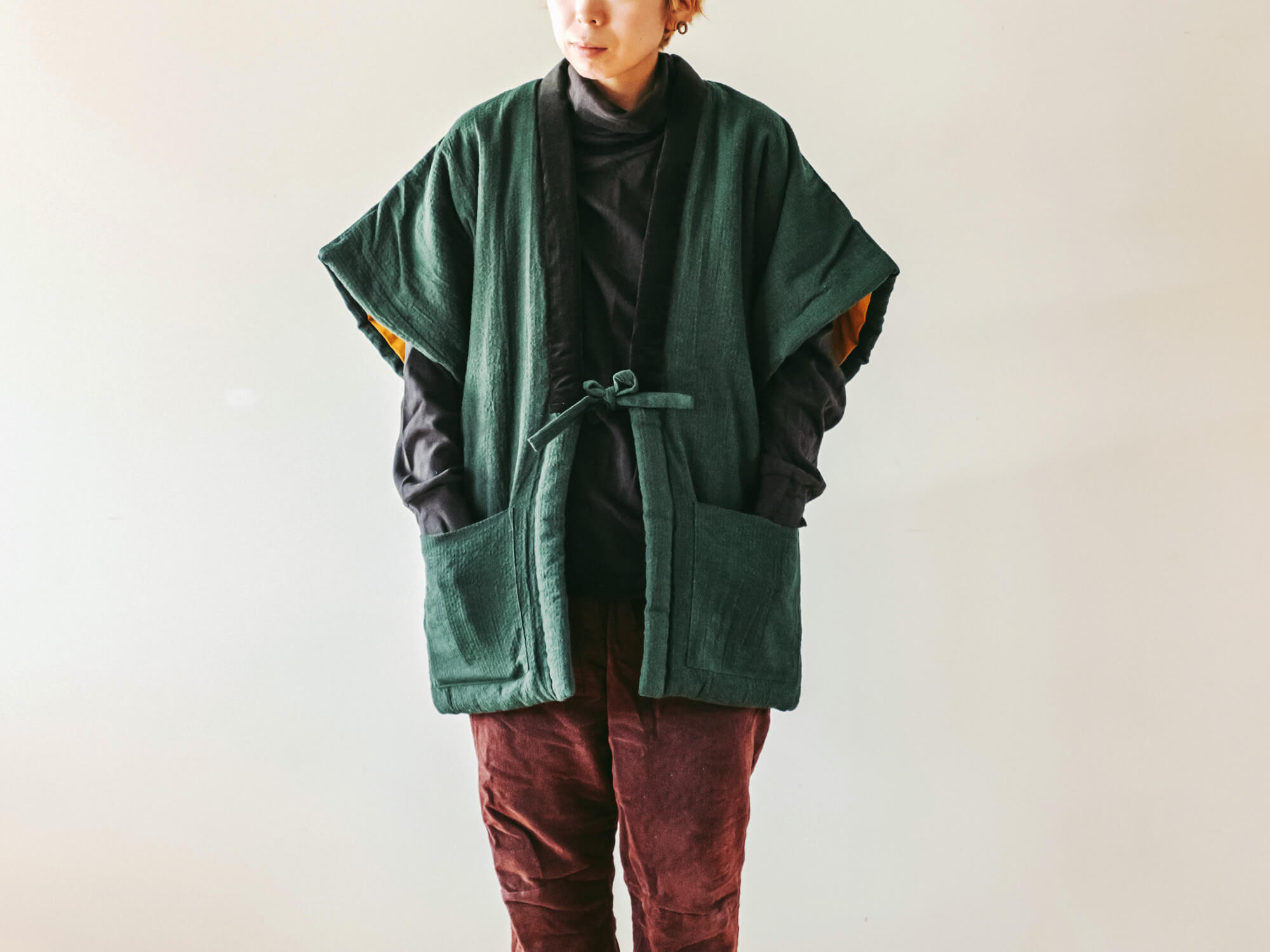 脈々はんてんに使用されている生地は、ムラ感のある糸が使用してあることで、はっきりとしたグリーンというよりは、少し曖昧な何とも言えない緑色が、四季によって変わる山のイメージや、まだまだこれからという段階の伝所鳩のイメージにもしっくりと当てはまったように思います。