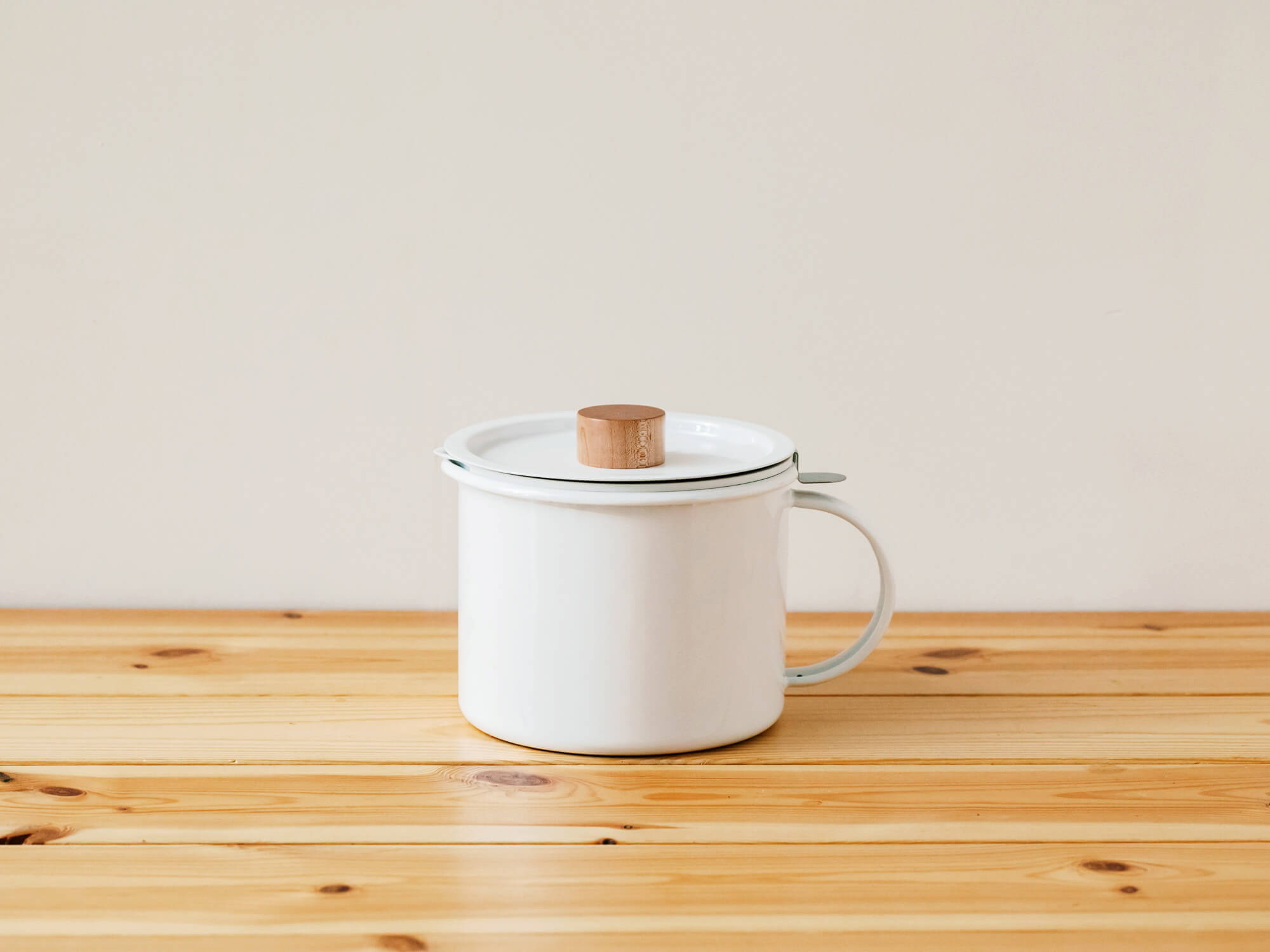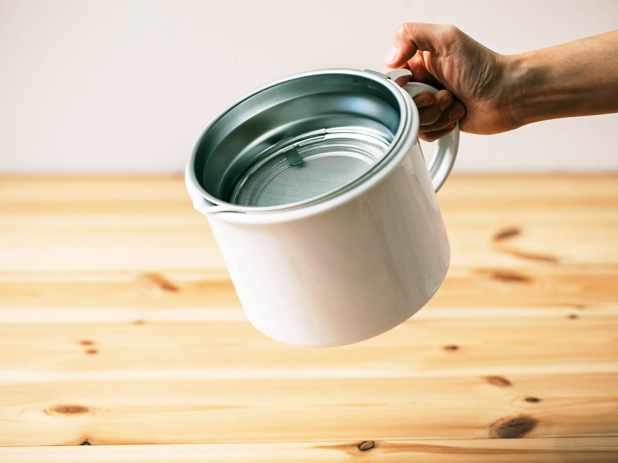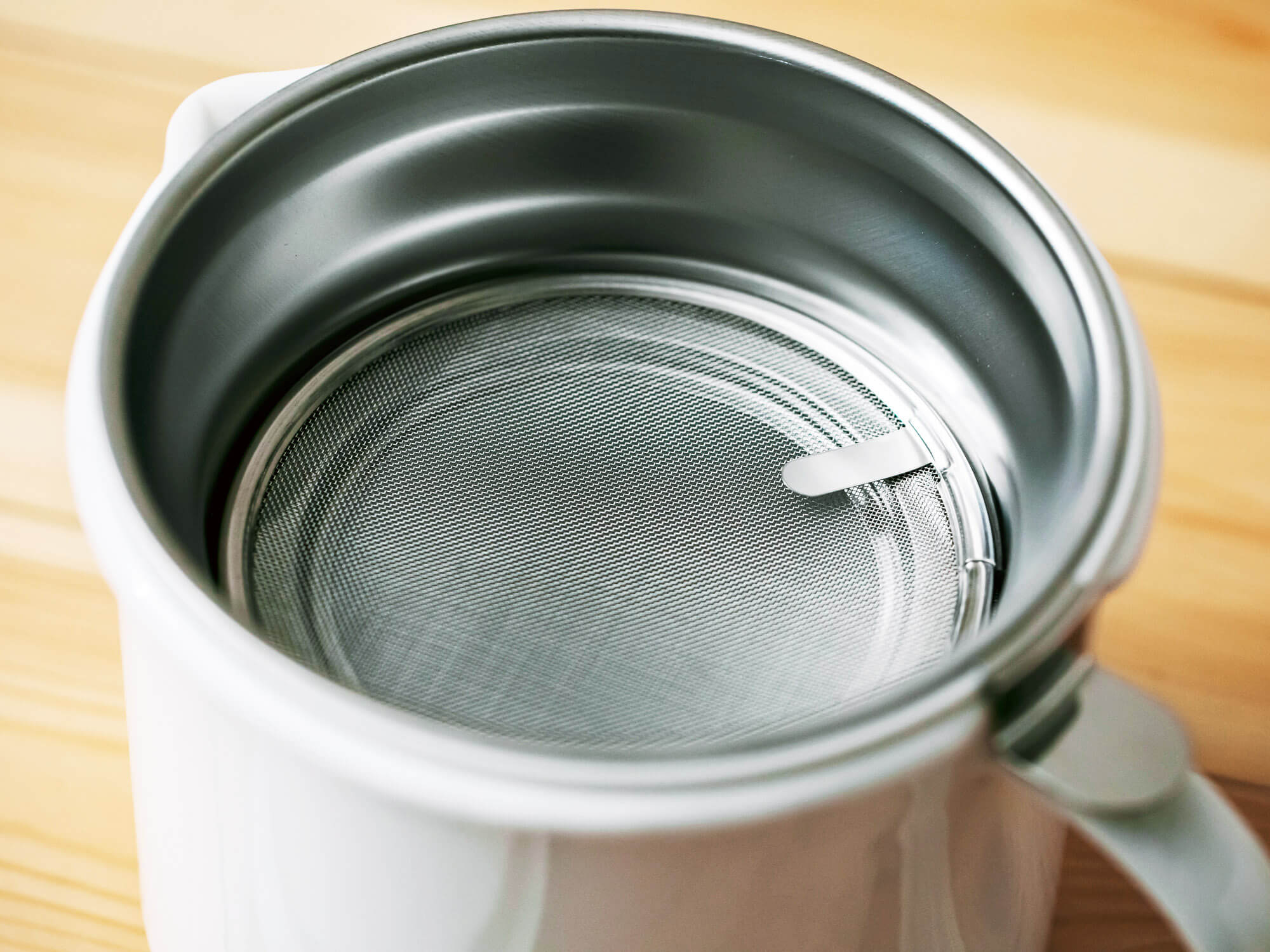 白くて、清潔感のある琺瑯(ほうろう)ボディに、手になじむ木のつまみ。そして、中には活性炭入りのフィルターとステンレス製のこし網。しっかりと油の汚れや臭いを取り除き、キッチンに置いておいても見た目がすっきり。使いやすさと美しさを兼ね備えた道具です。