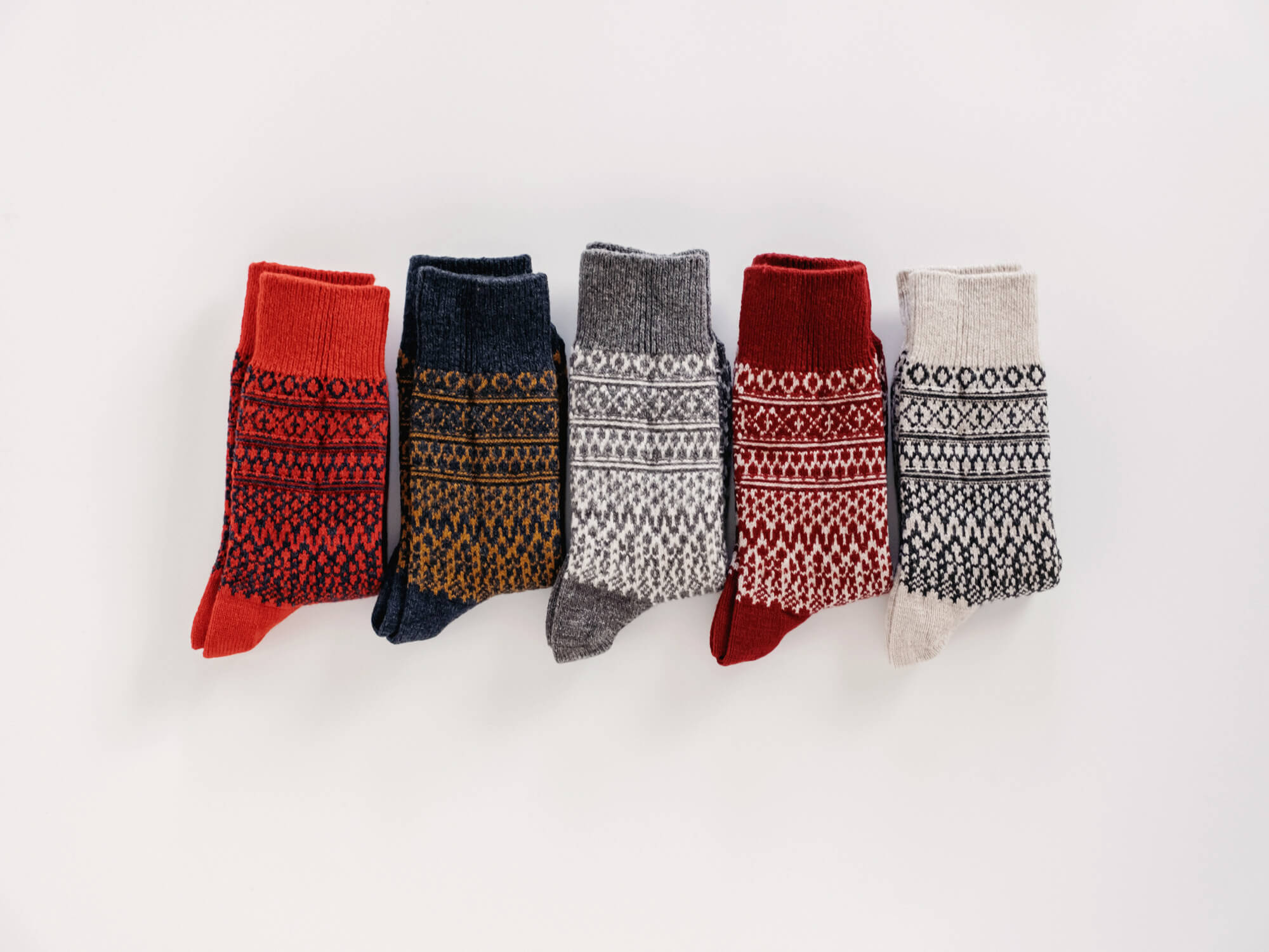 豊富なカラーバリエーションと個性的な柄の組み合わせは、冬のギフトにもぴったり。柄物が苦手という方にもぜひ試していただきたい、やさしくも力強い一足です。