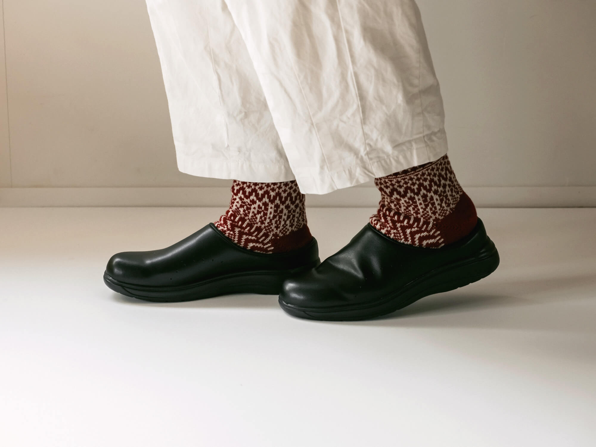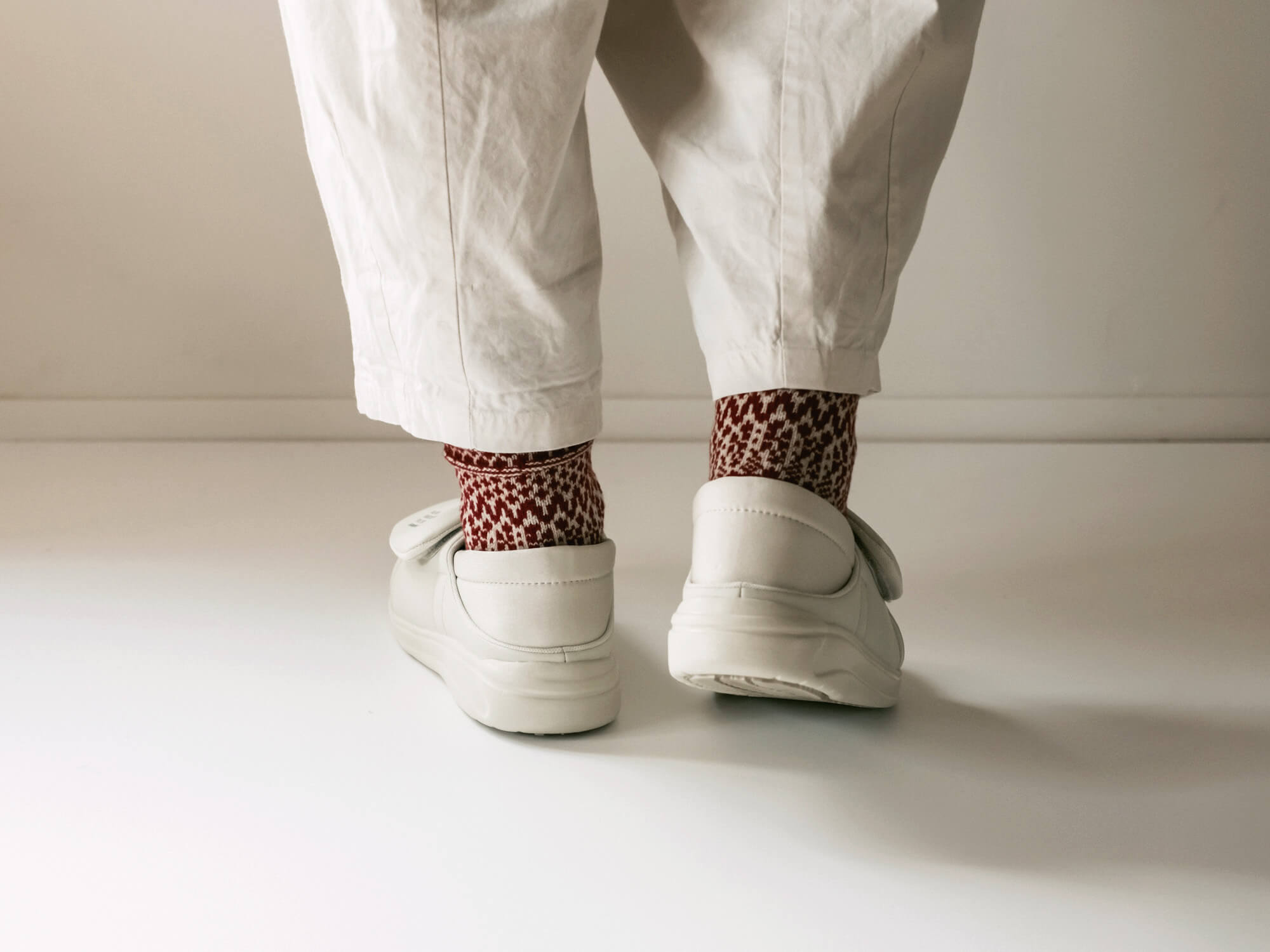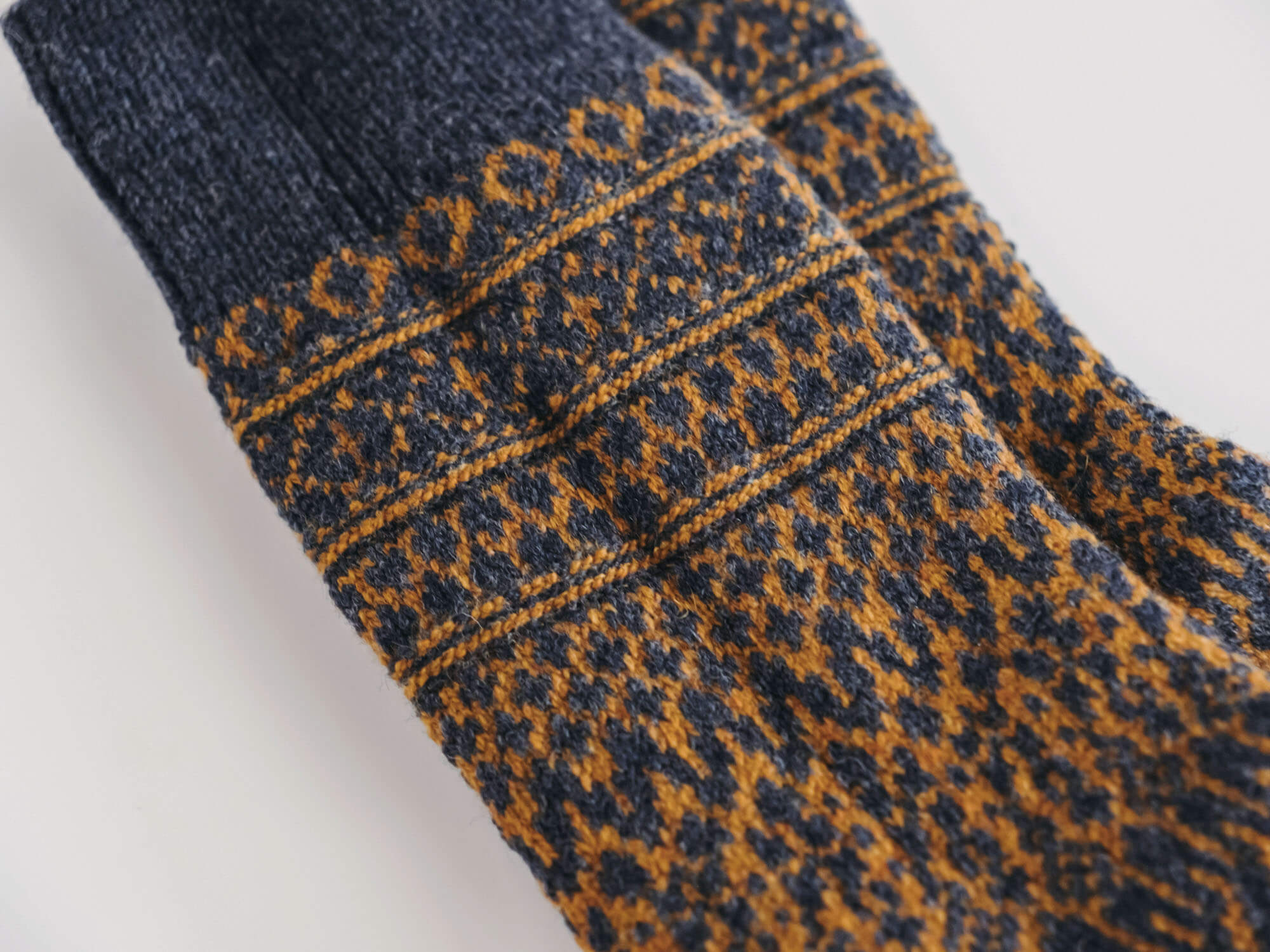 デザインのアクセントとなるのは、どこか懐かしくも新鮮な幾何学模様。靴下を主役にしたくなるような華やかさがありながら、日常の装いにもすっと馴染みます。スニーカーにも革靴にも合わせやすく、男女問わず楽しめるバランスの良さも魅力。