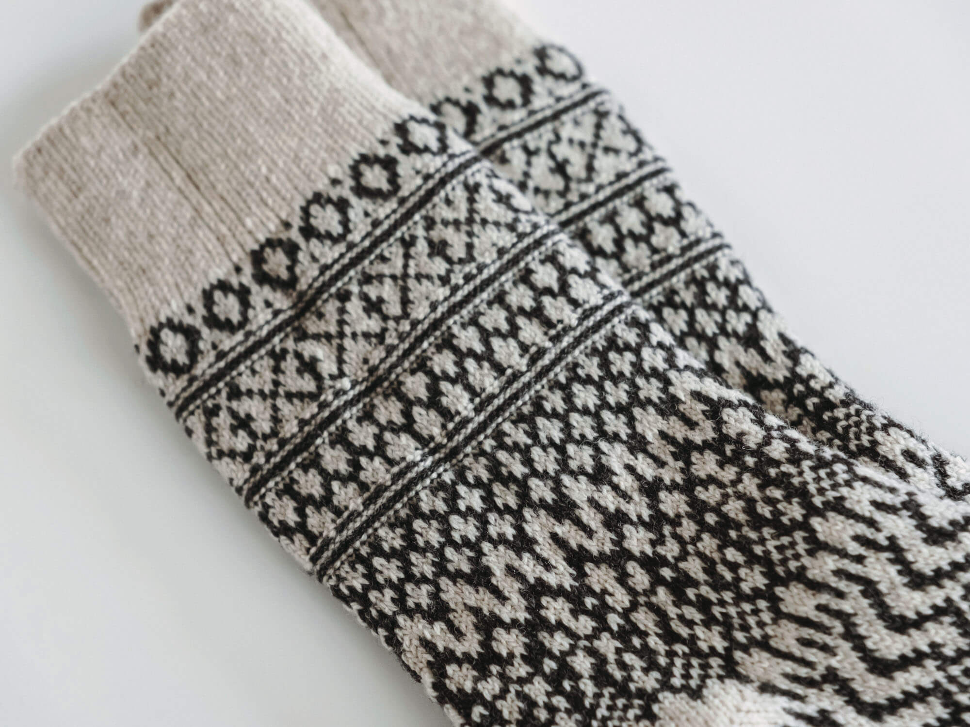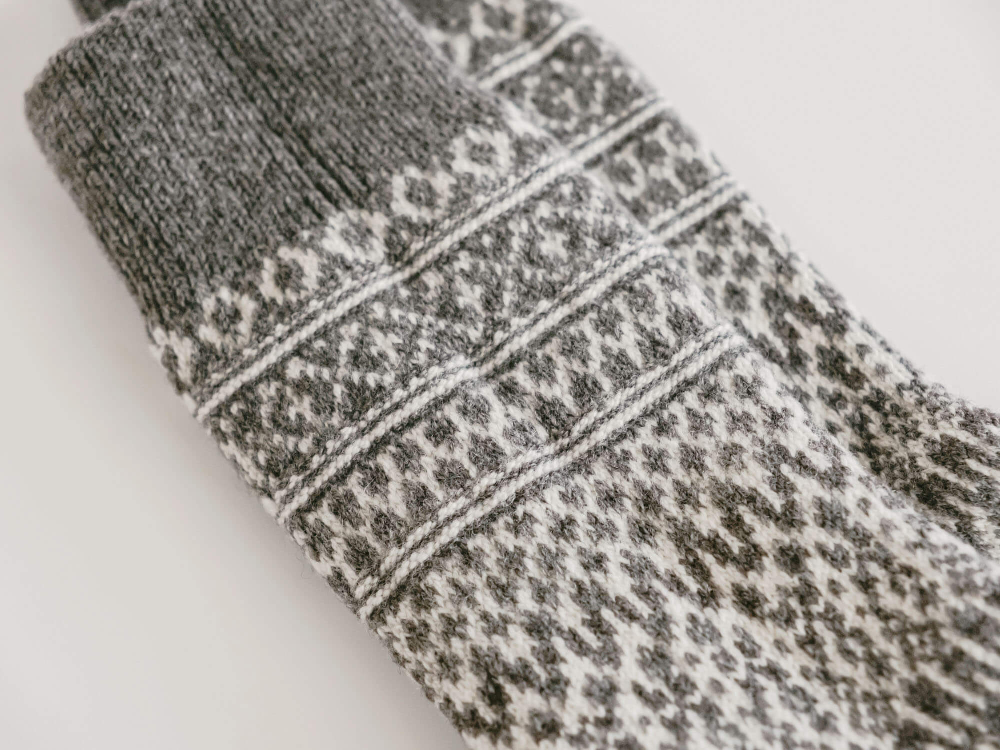 縮みにくい防縮ウールを使い、しっかりと厚みをもたせて編み上げられたジャガードソックス。履いた瞬間に感じるのは、どっしりとした安定感と、空気をたっぷり含んだウールならではのあたたかさ。足全体を包み込むようにやさしくフィットして、寒い季節でも頼れる存在です。