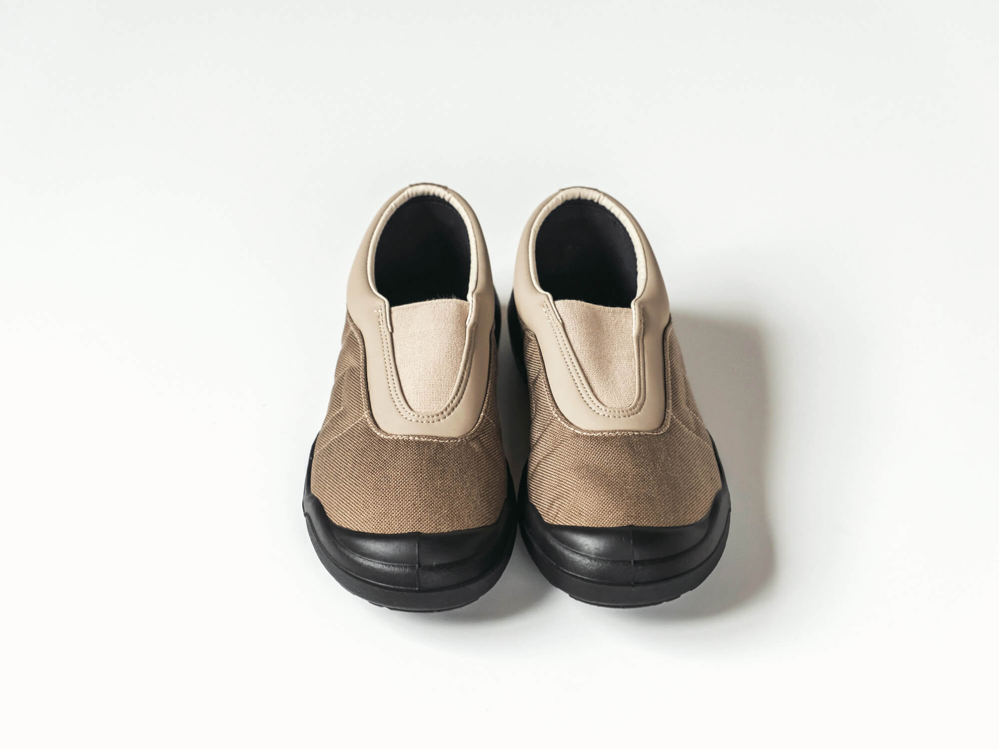 運動靴として生まれたバイオLTタイプをもとに、現代的にアップデートされた「GOATRAINER(ゴートレーナー)」。甲部分に伸縮性のあるゴムが配され、足入れがスムーズなスリッポン仕様。履き口もやわらかく、脱ぎ履きのしやすさが嬉しい一足です。