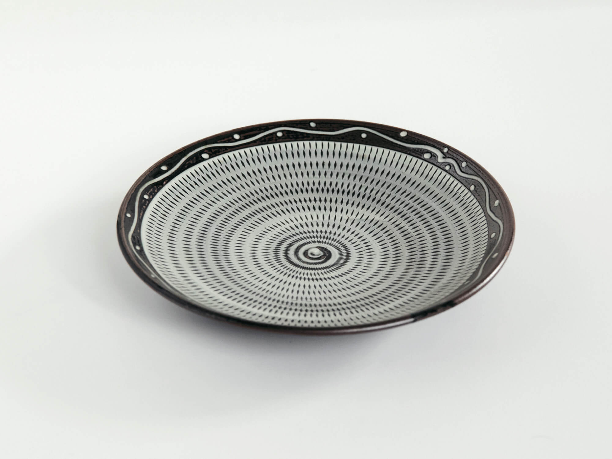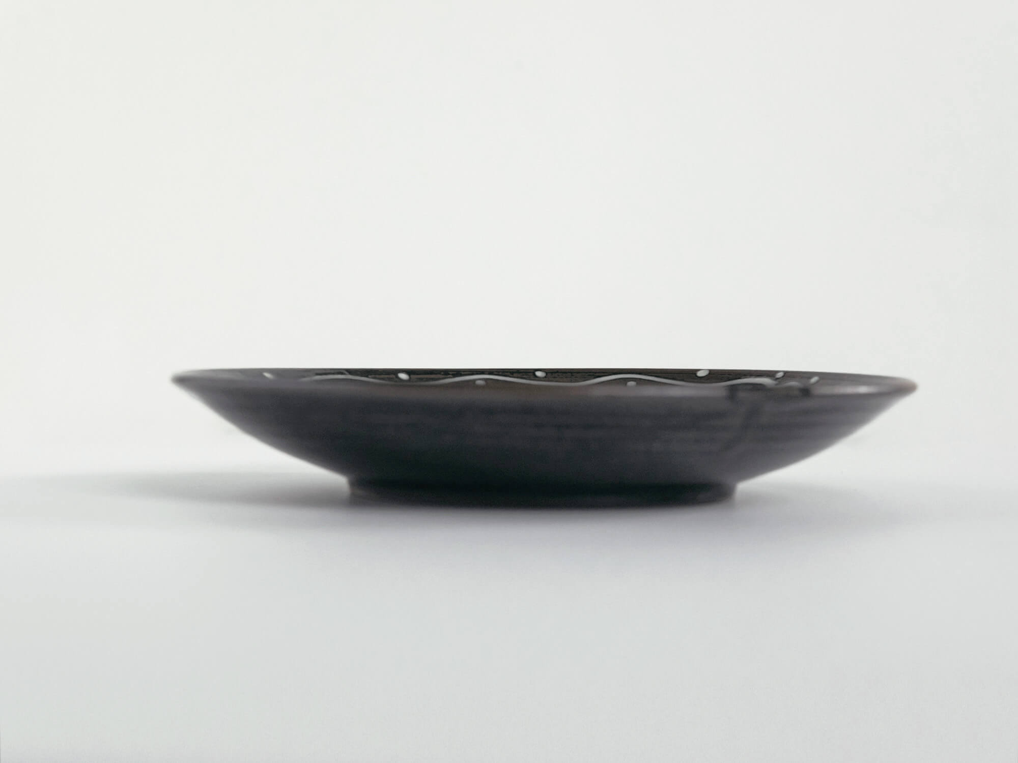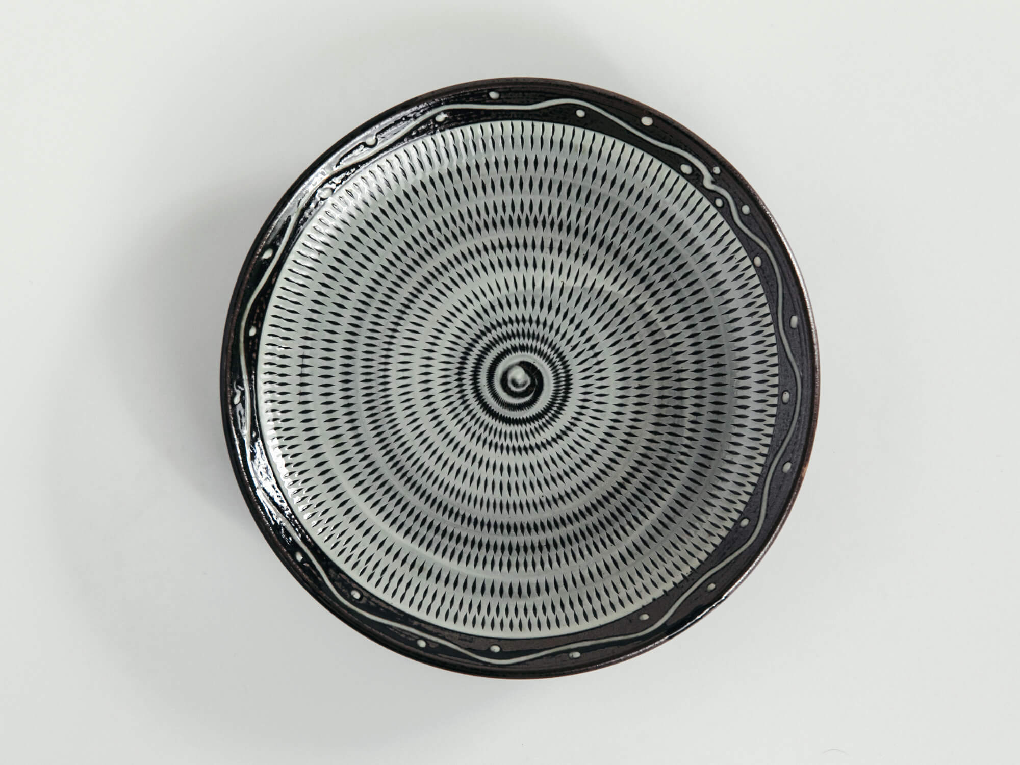 縁にそって飛鉋(とびかんな)で模様を入れ、黒釉をかけたモダンな印象の一枚。飛鉋のリズムある連続模様が、料理をやさしく囲み、食卓に動きを与えてくれます。