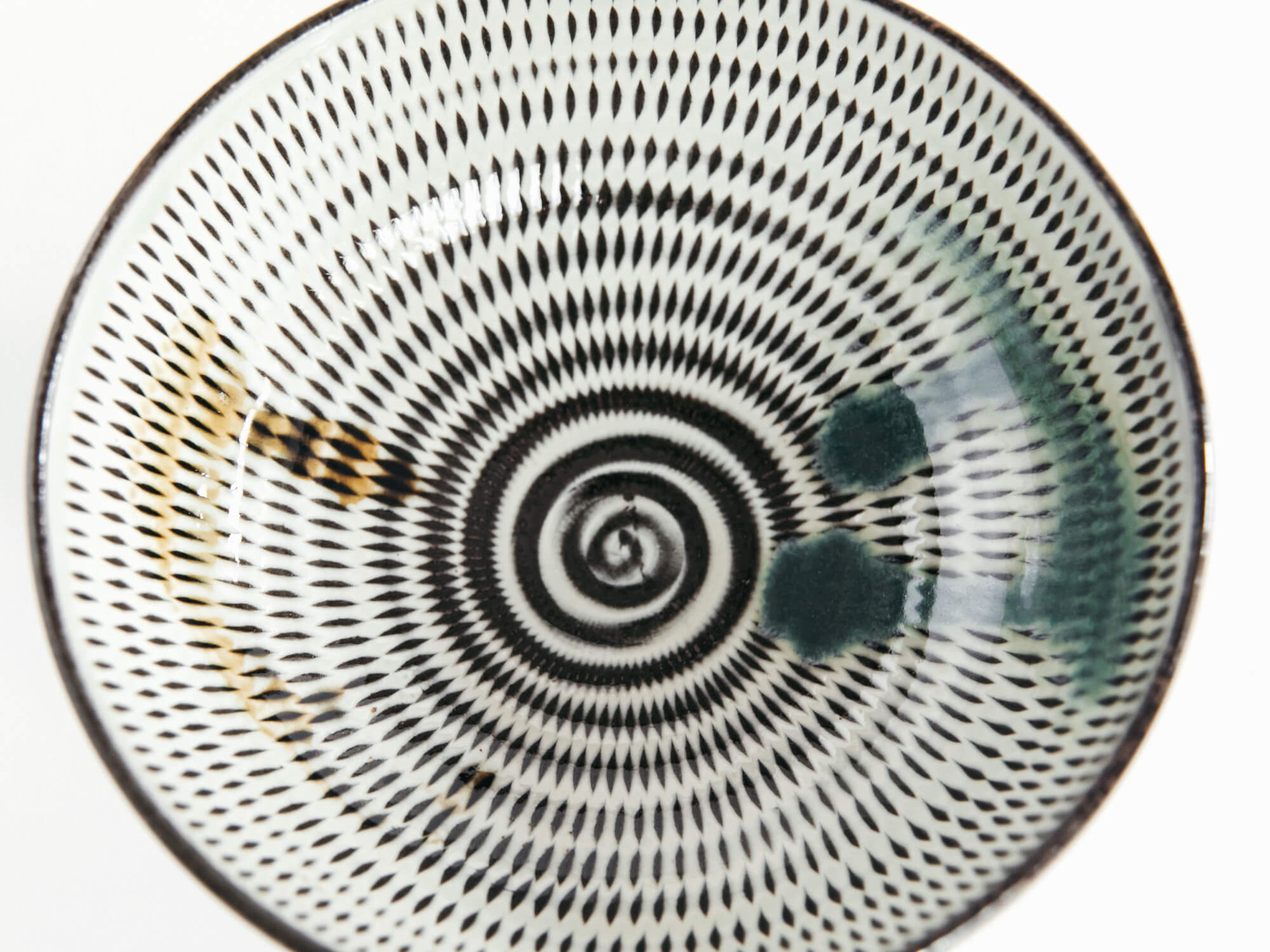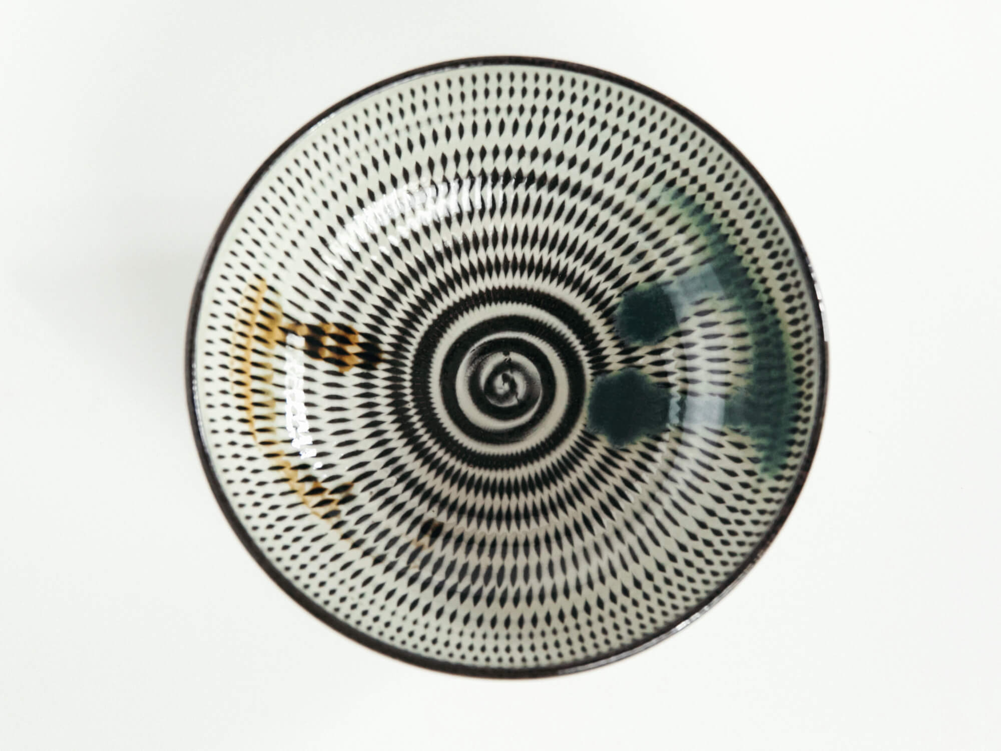 飛鉋の模様に、釉薬をひと匙ふわりと打ちかけたような表情が特長の一枚。偶然のようでいて計算された釉薬の流れが、器に奥行きと動きを与えます。一つひとつ異なる表情を持ち、同じものがない一点ものの魅力があります。