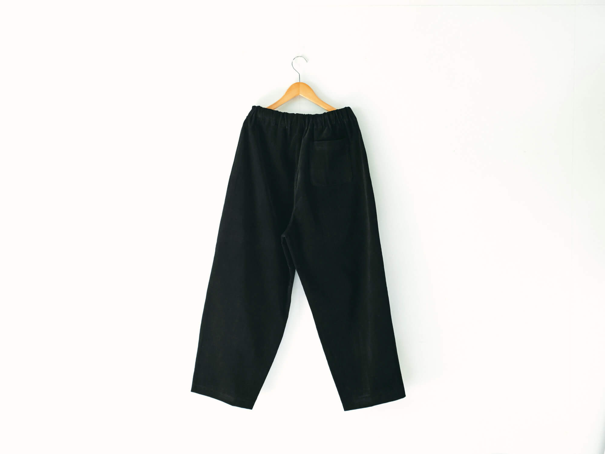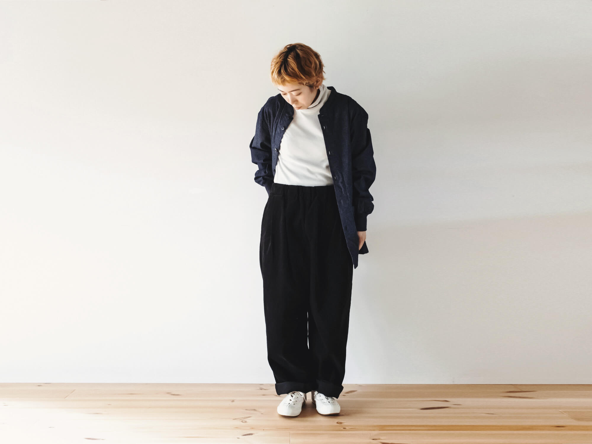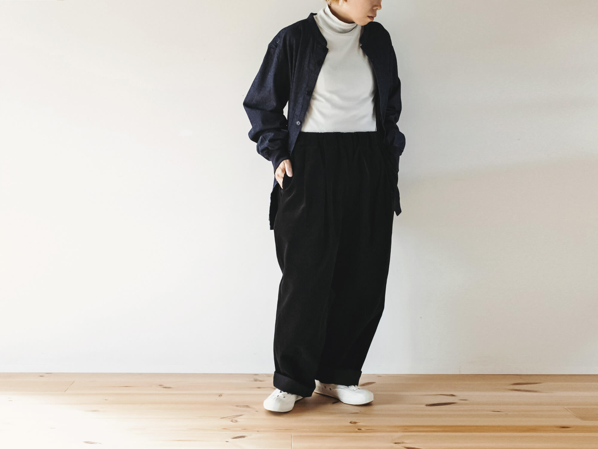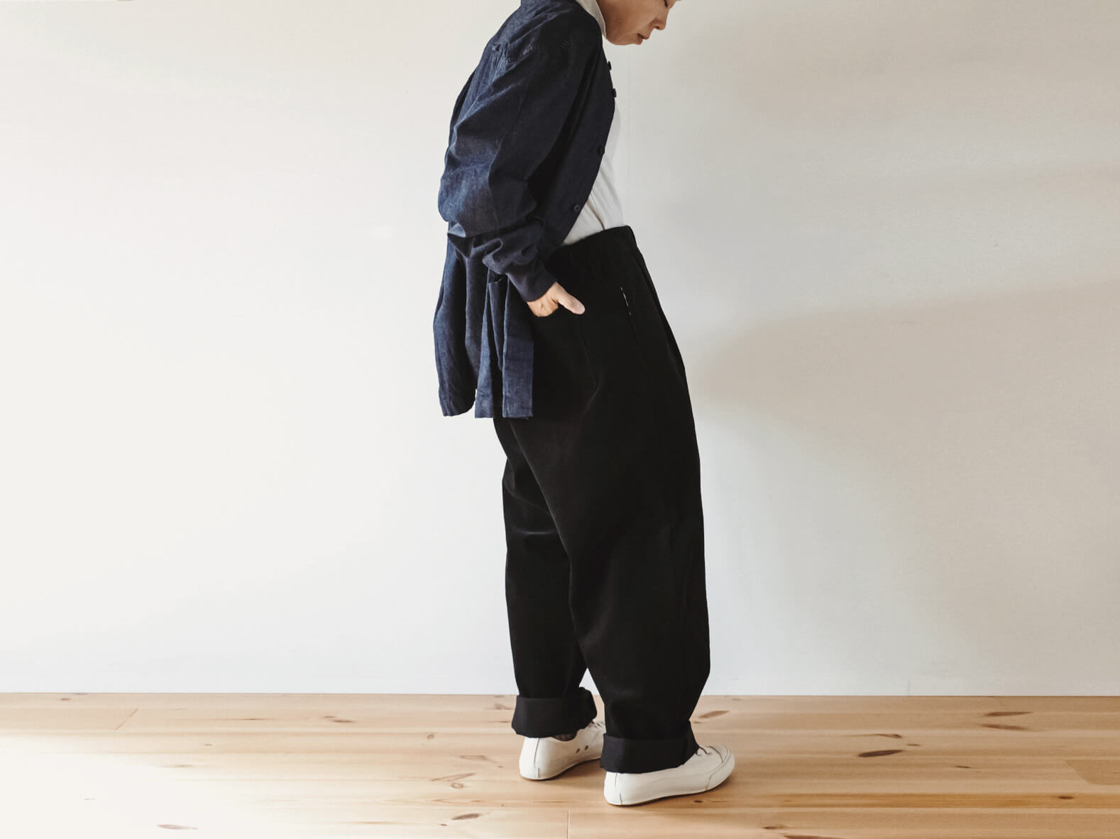 形はゆったりとしたワイドシルエット。体型を選ばず、誰でもすっと馴染む形で、裾をロールアップしてラフに履くのもまたいい感じ。ウエストはひもで調整できるので、サイズ感の融通がきくのも嬉しいポイントです。