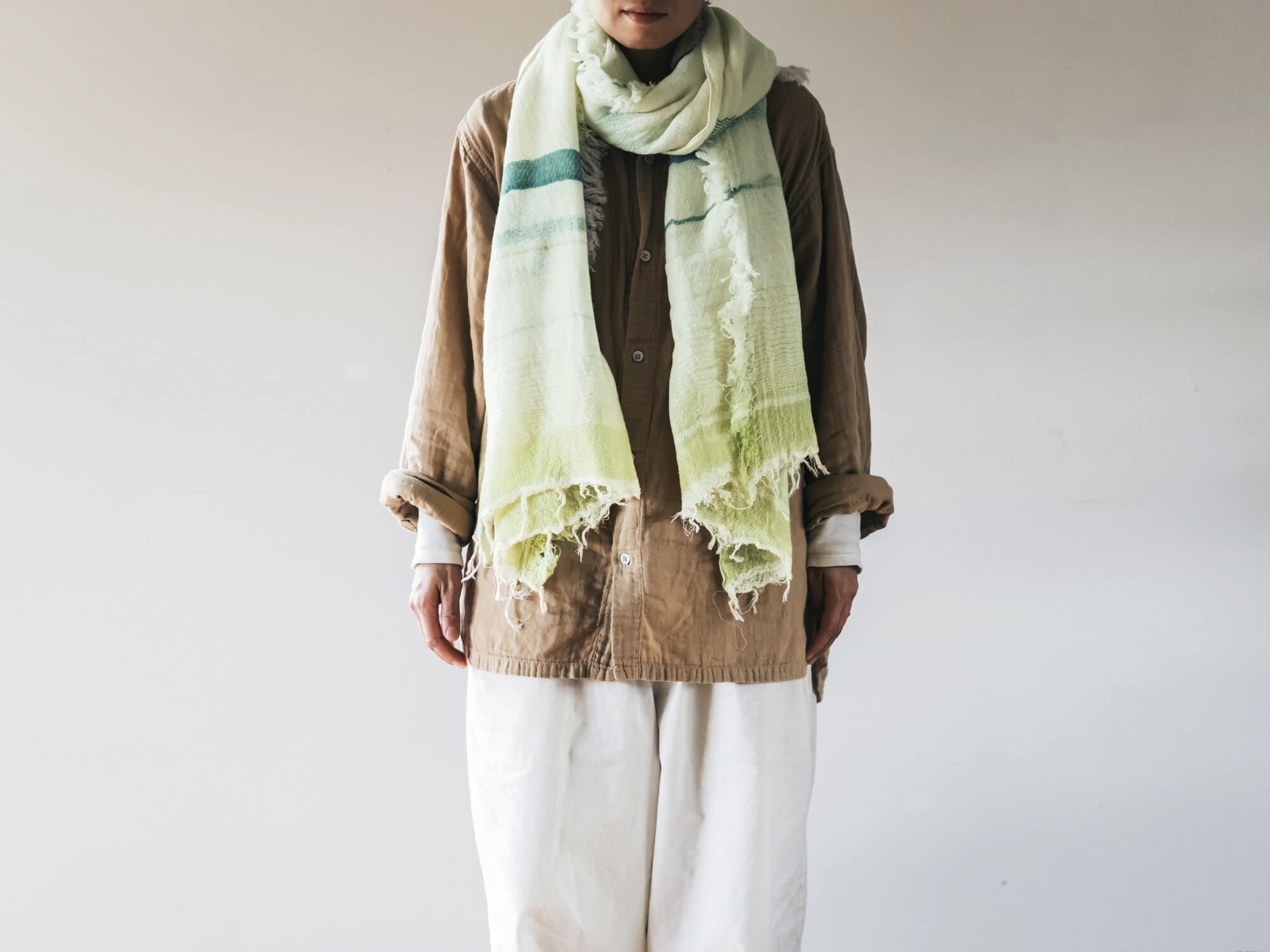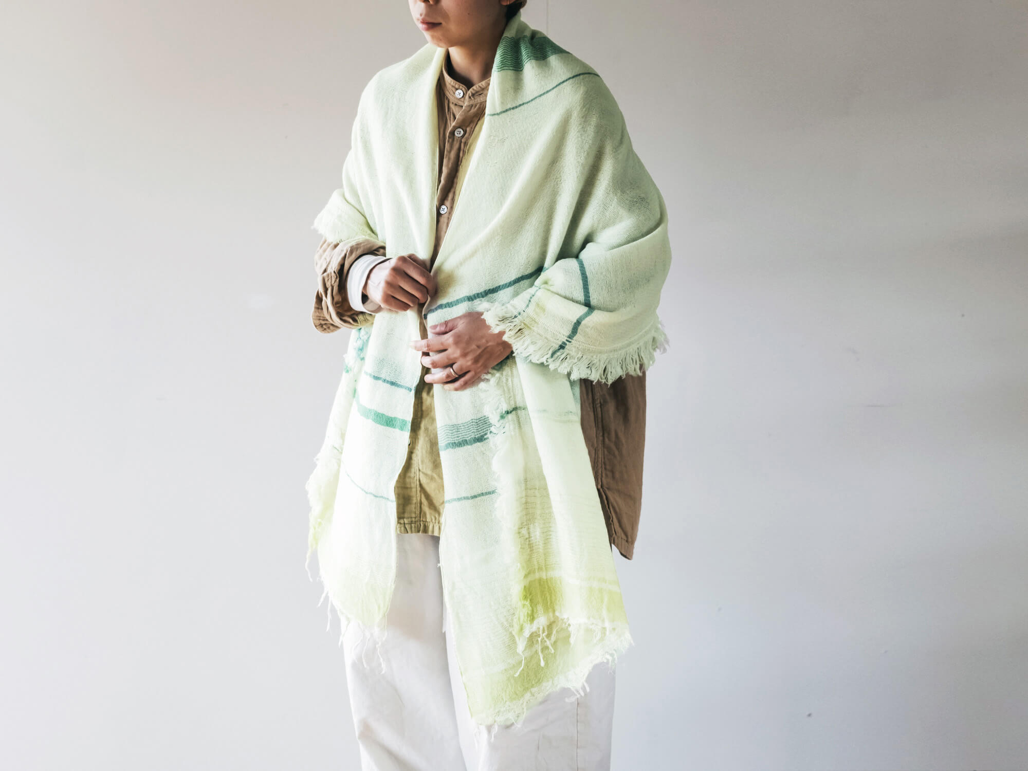 身につけていることを忘れるほどの軽さでありながら、しっかりと暖かい。見た目だけでなく、機能的なのがこのショールのすごいところ。