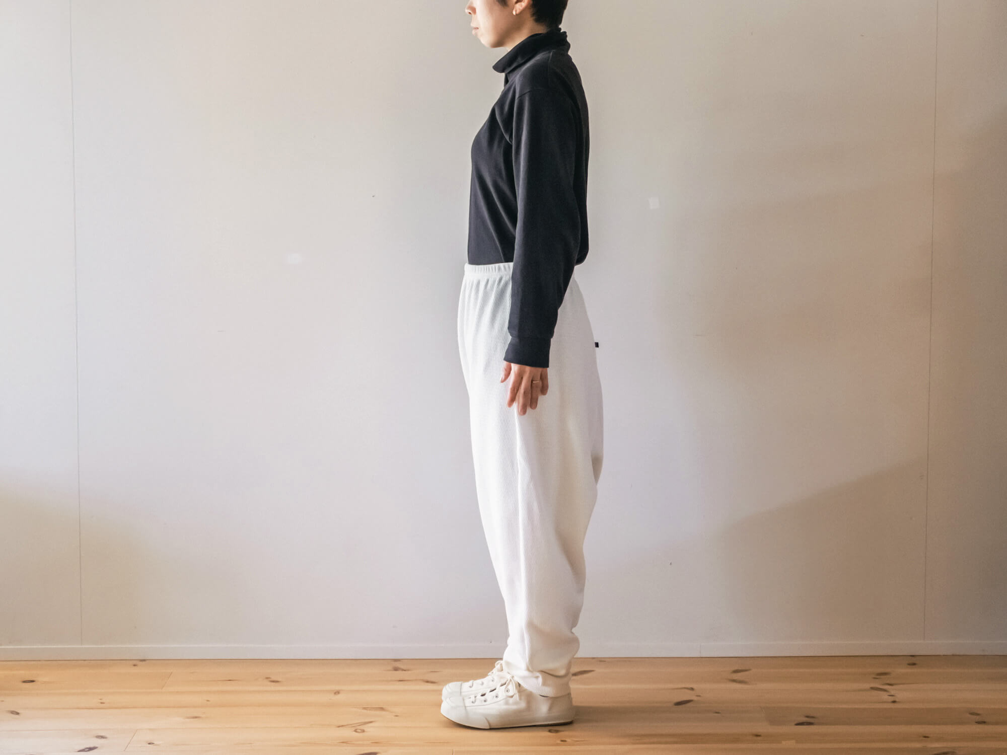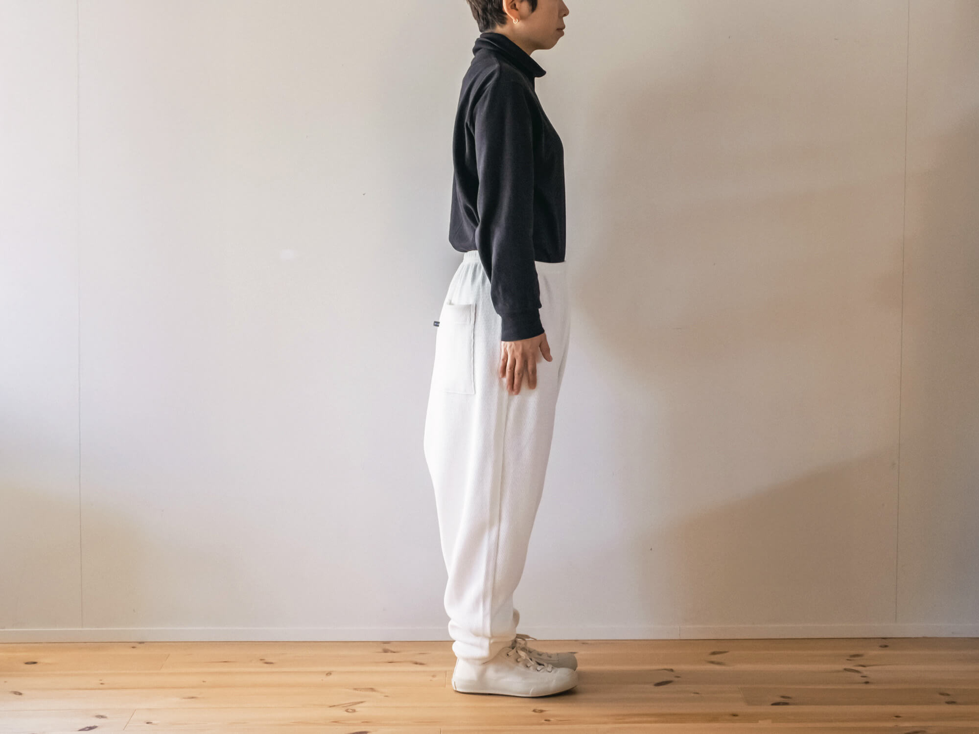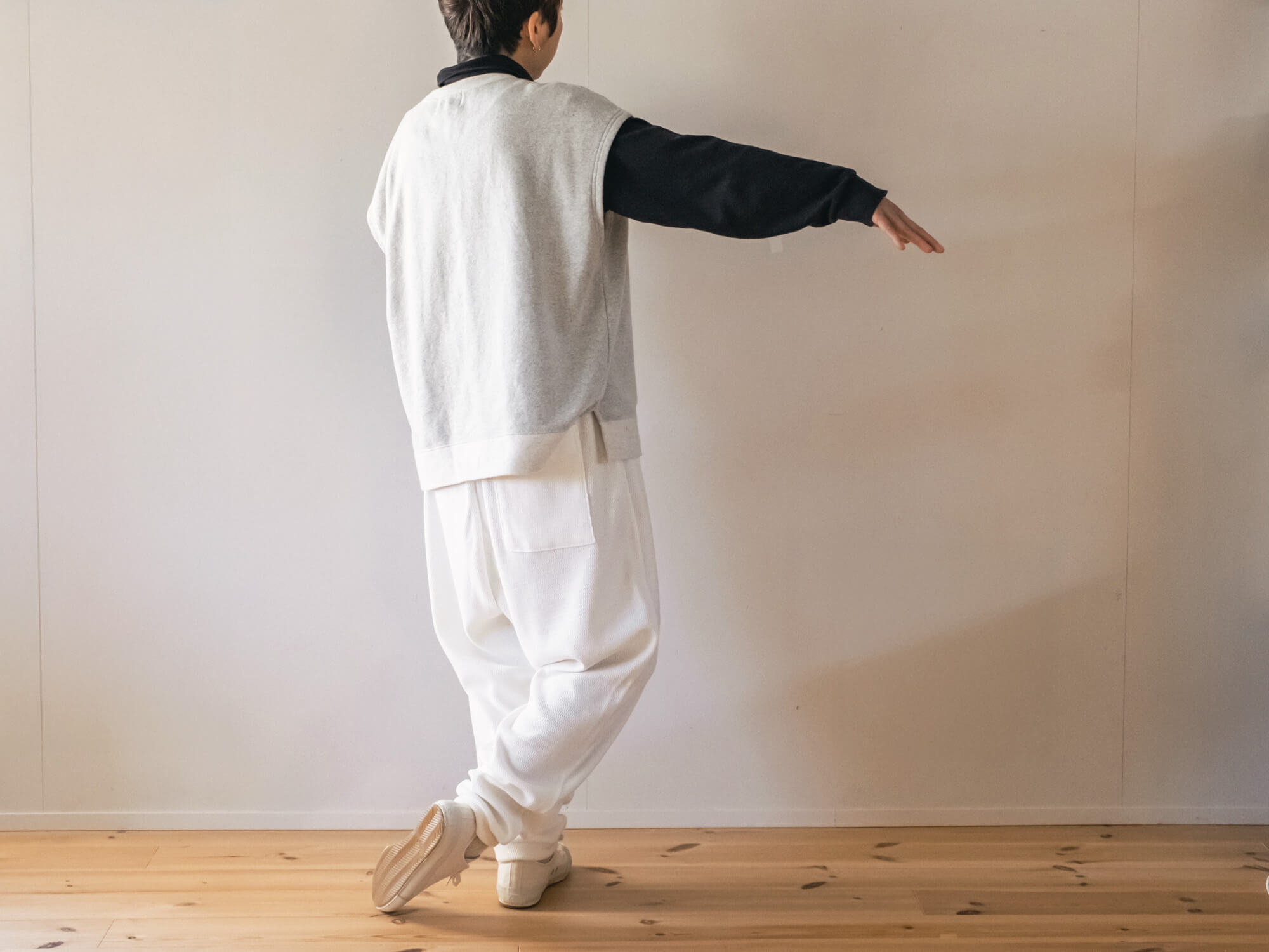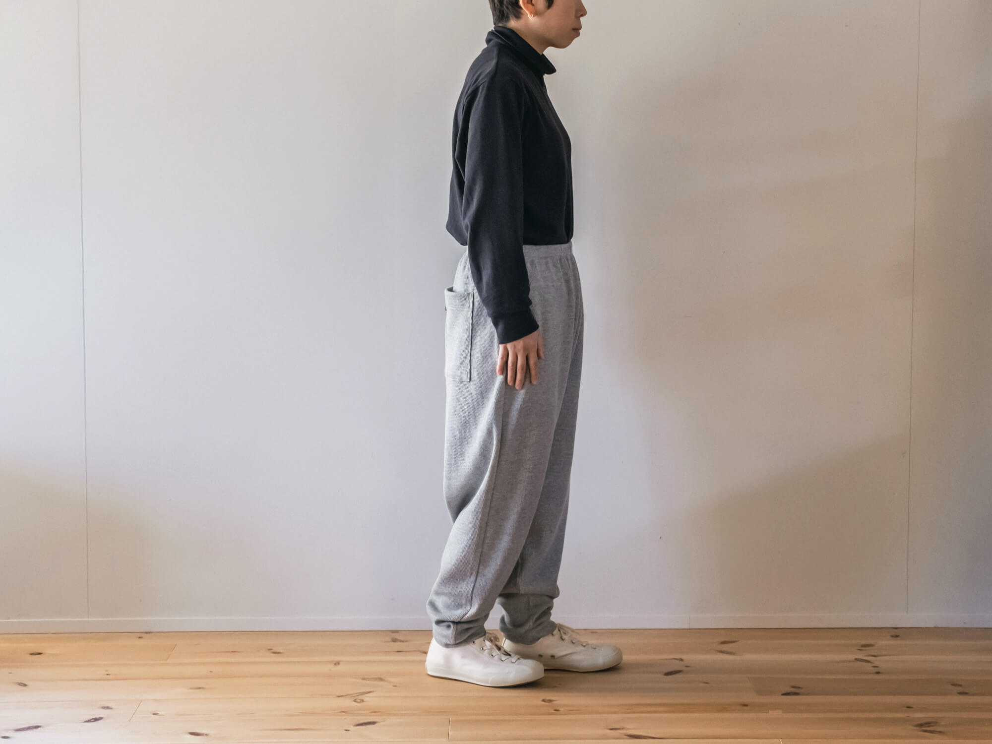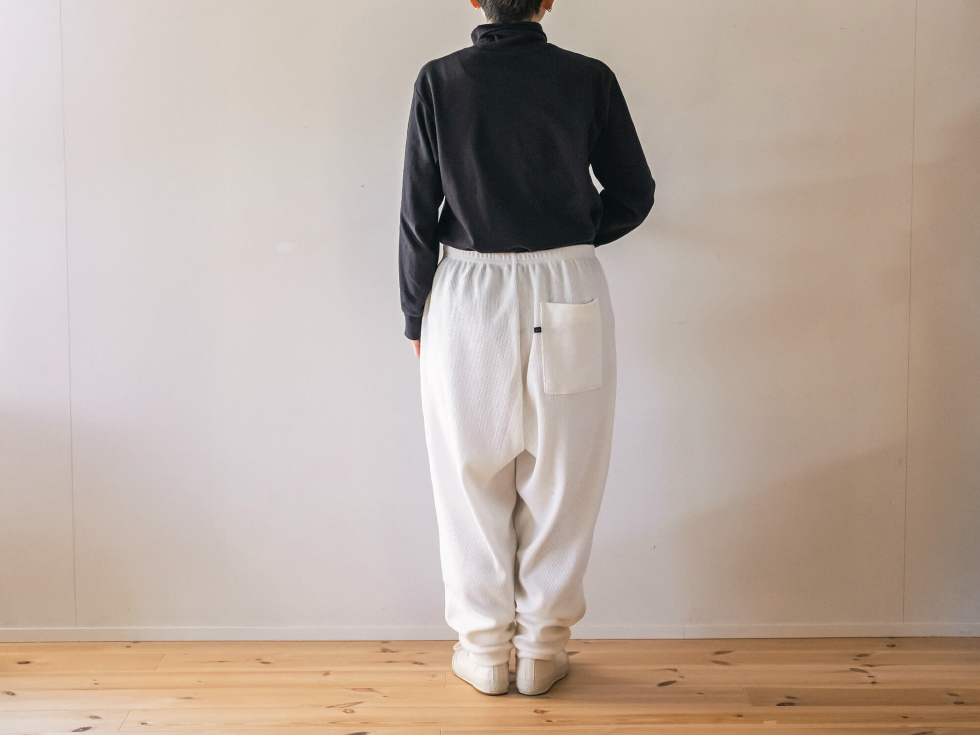 腰回りはゆるっと、裾に向かって細くなる独特のシルエット。リラックス感はあるのに、だらしなく見えず、ちょっと外にも出かけたくなるバランス。後ろにひとつだけ付いたポケットも、yohakuらしい遊び心です。