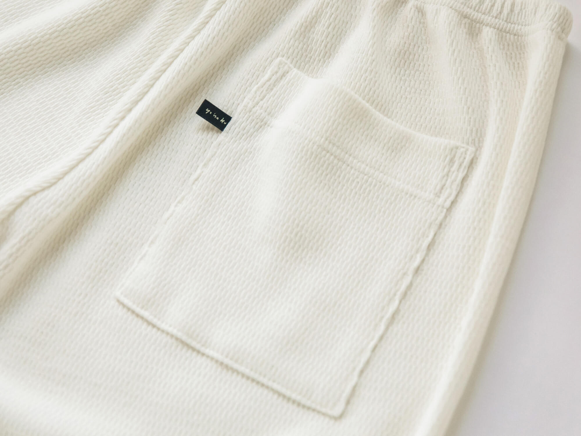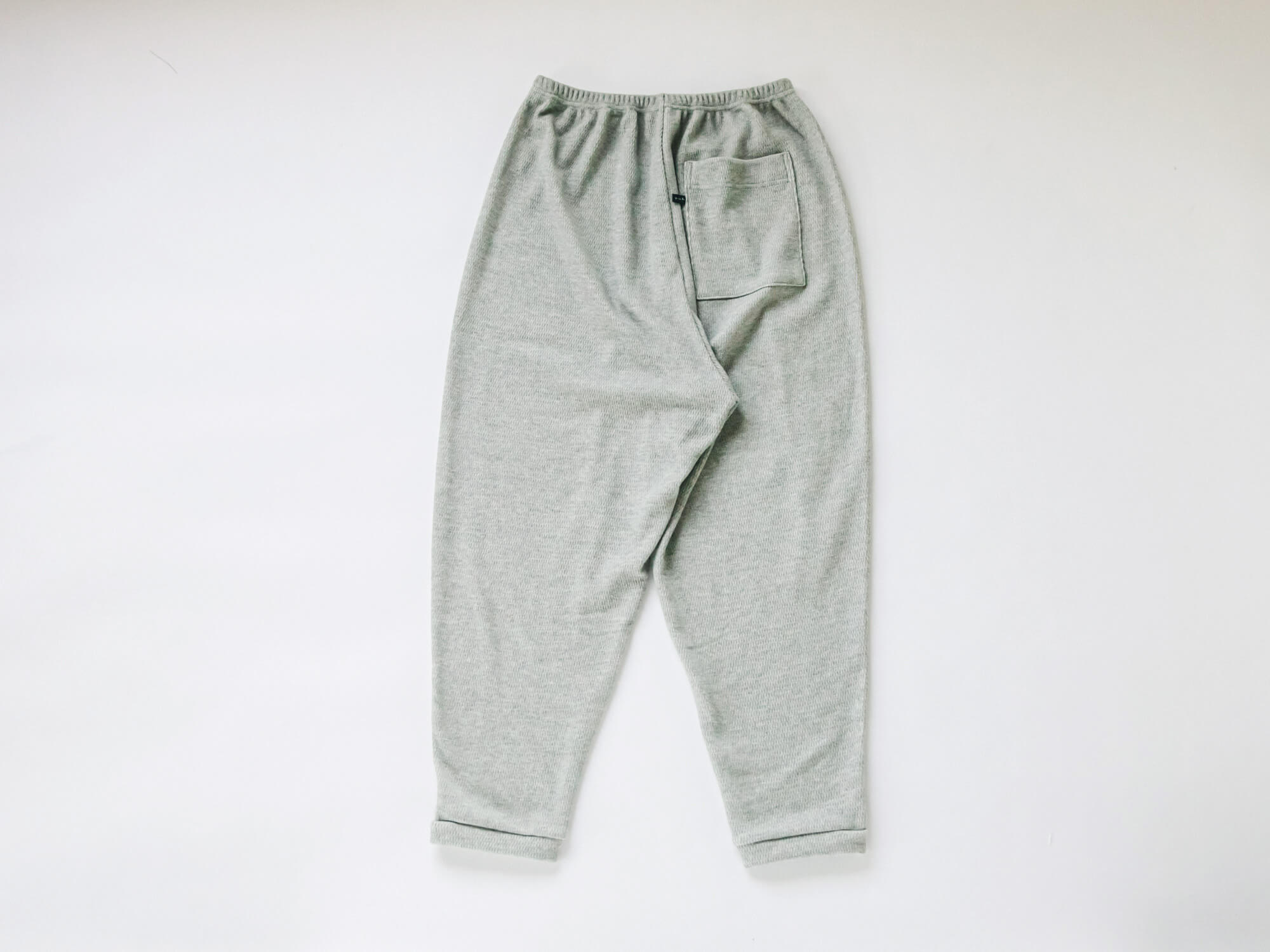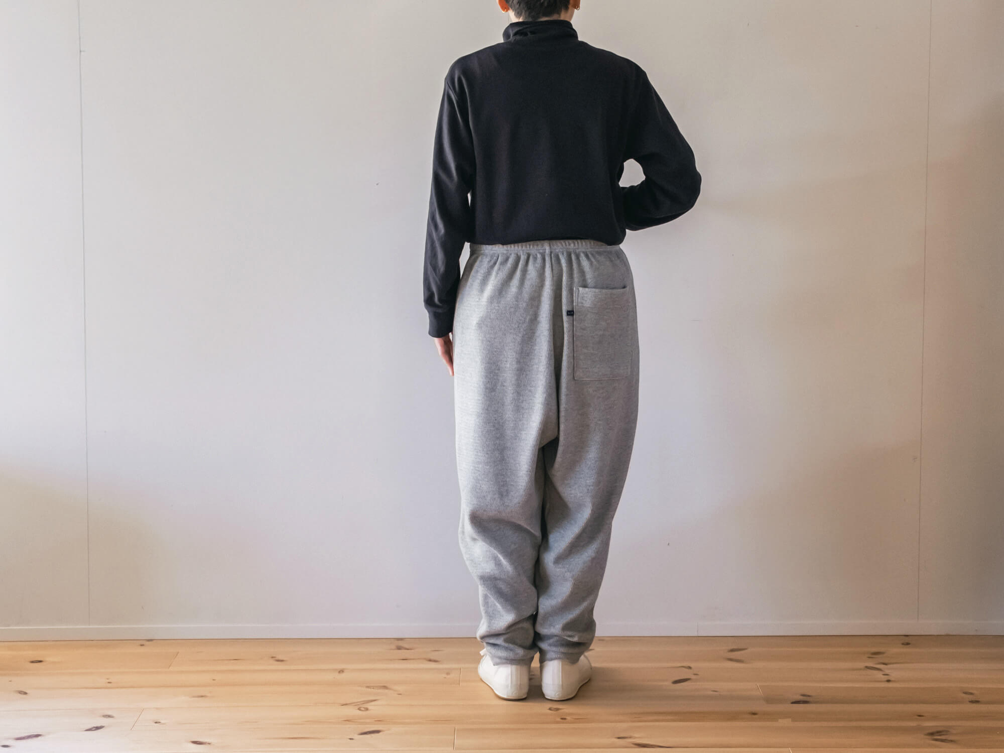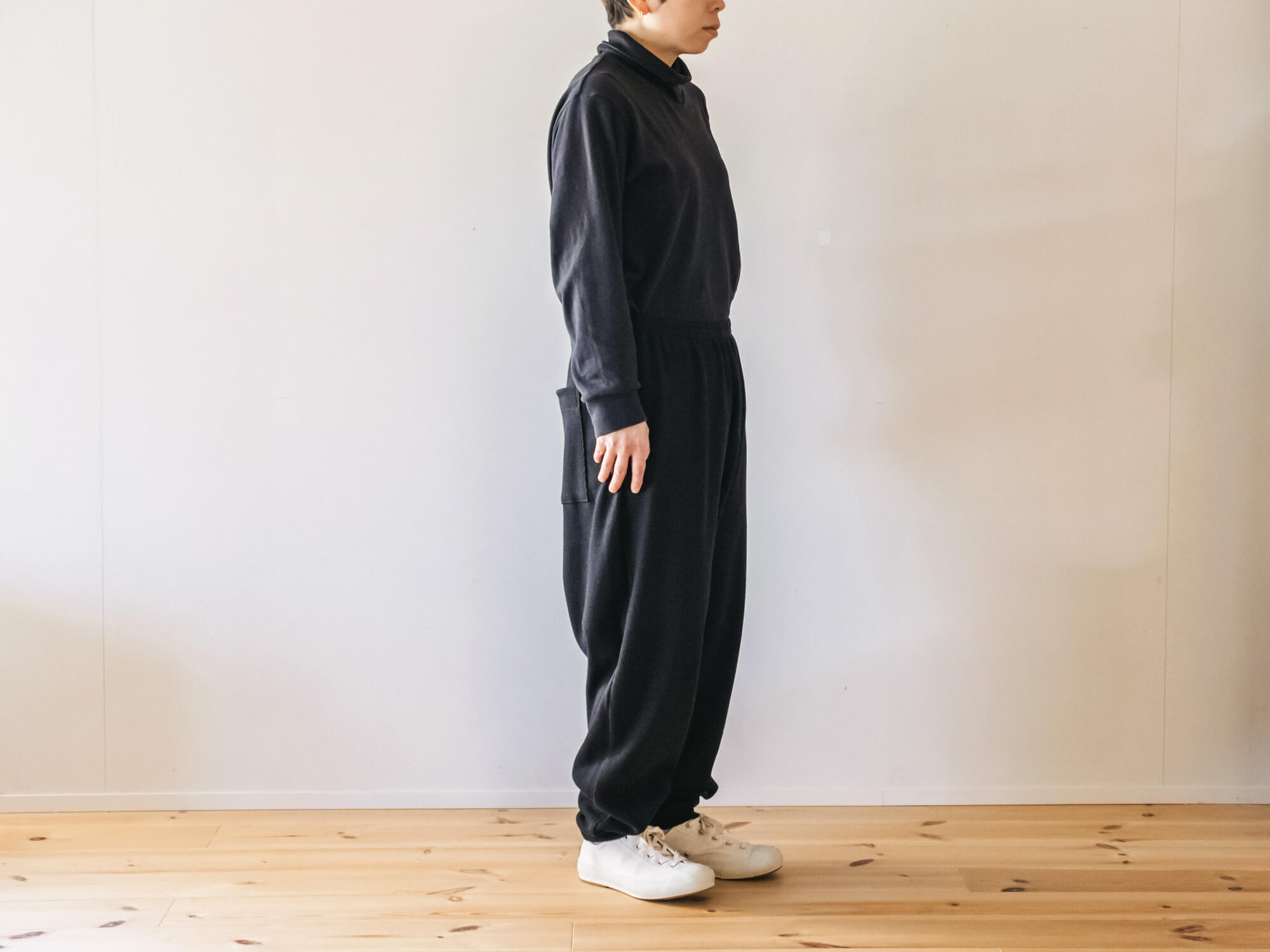 腰回りはゆるっと、裾に向かって細くなる独特のシルエット。リラックス感はあるのに、だらしなく見えず、ちょっと外にも出かけたくなるバランス。後ろにひとつだけ付いたポケットも、yohakuらしい遊び心です。