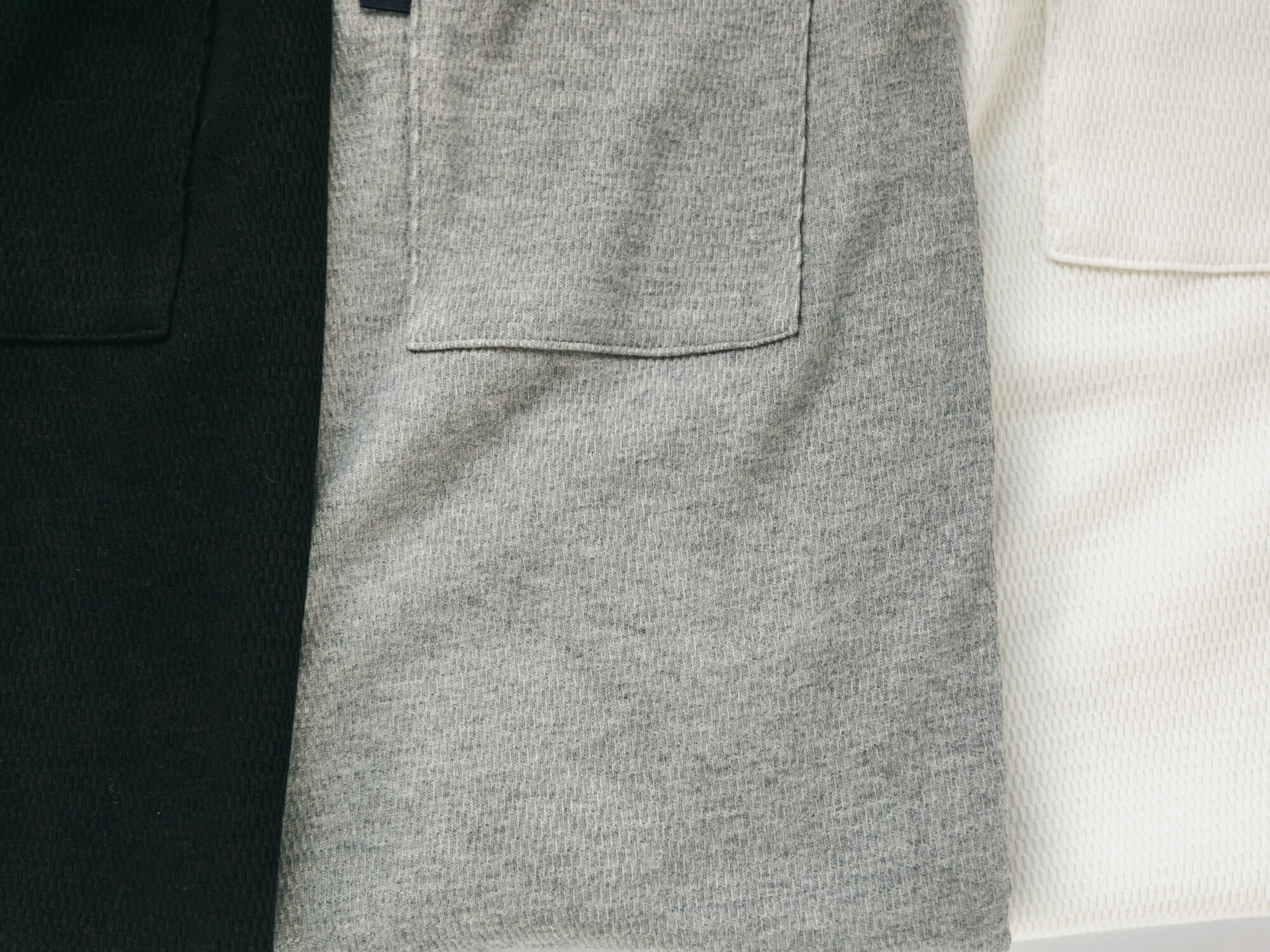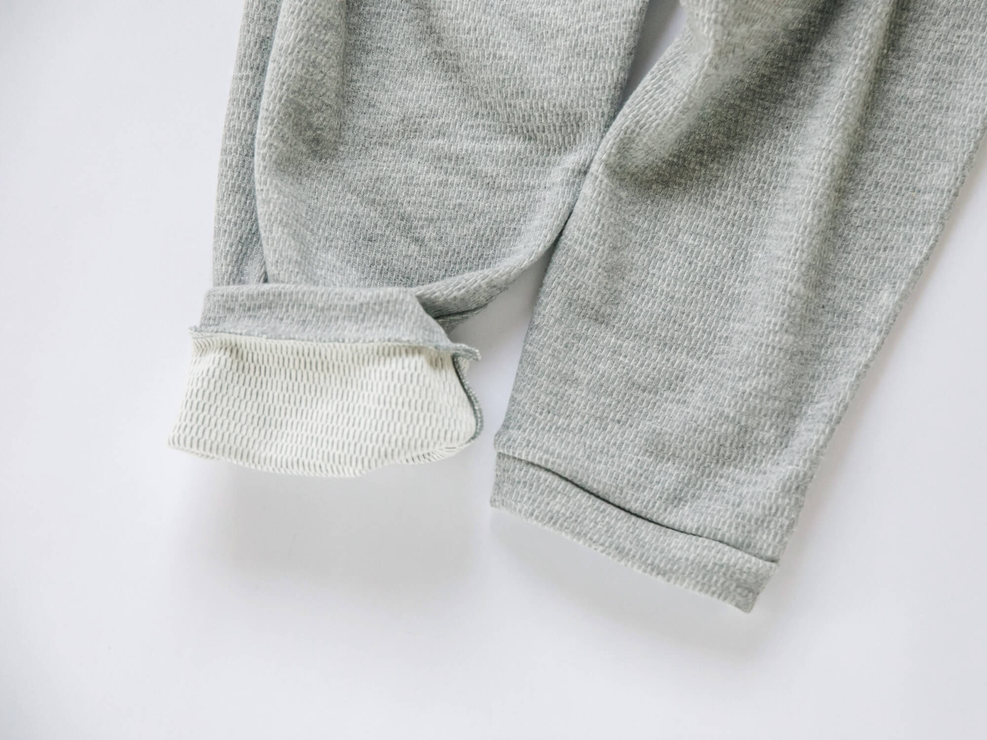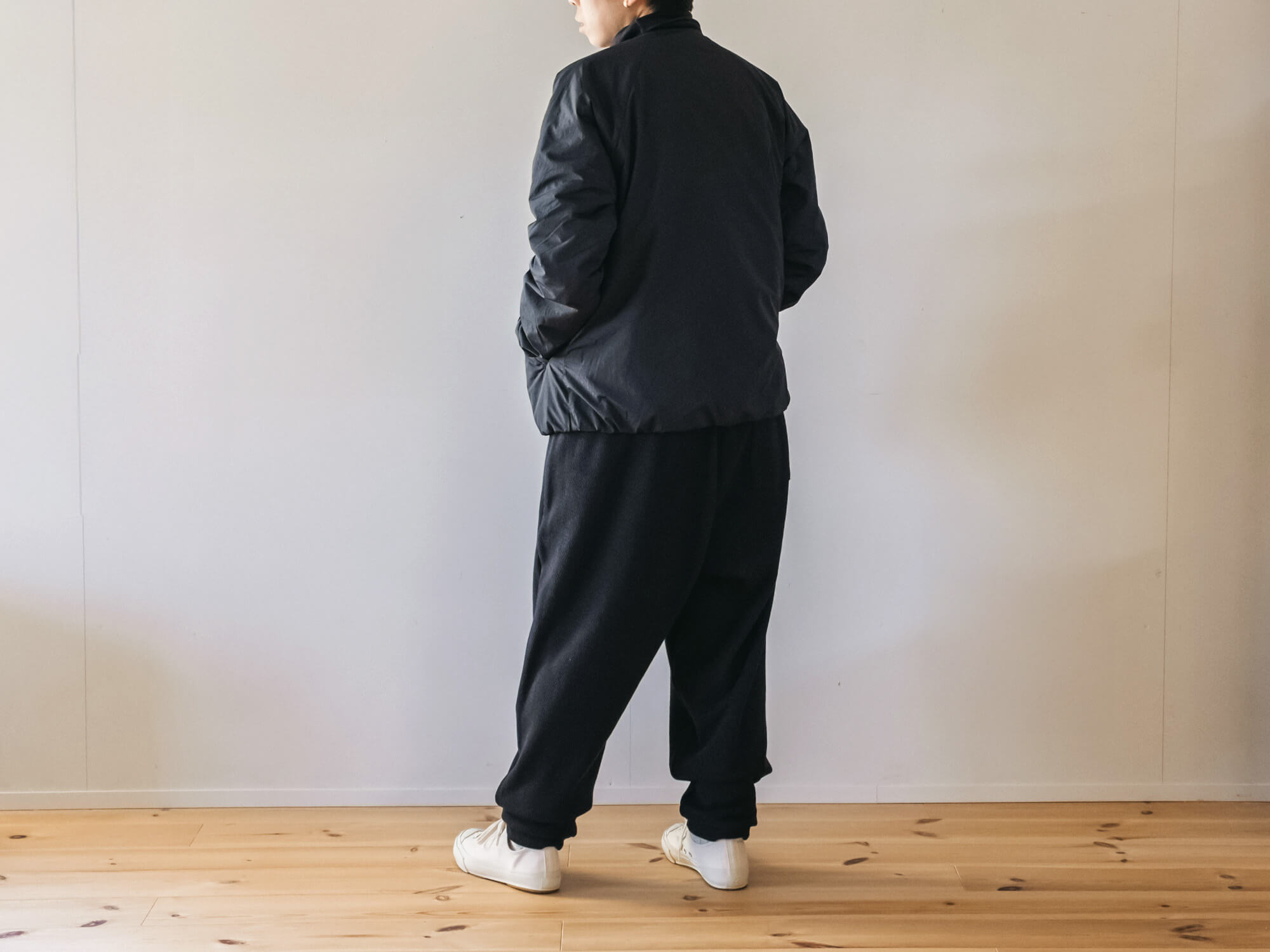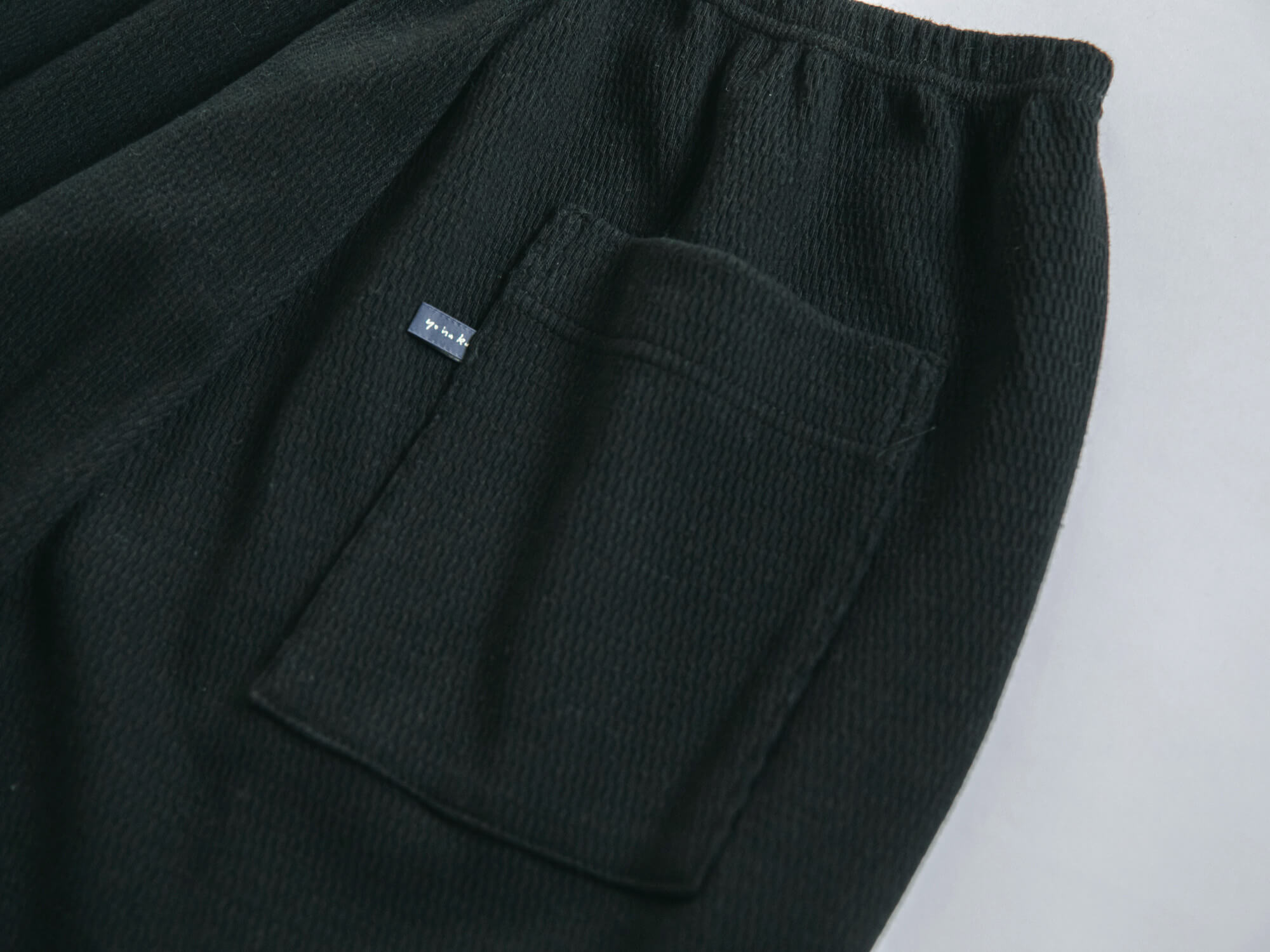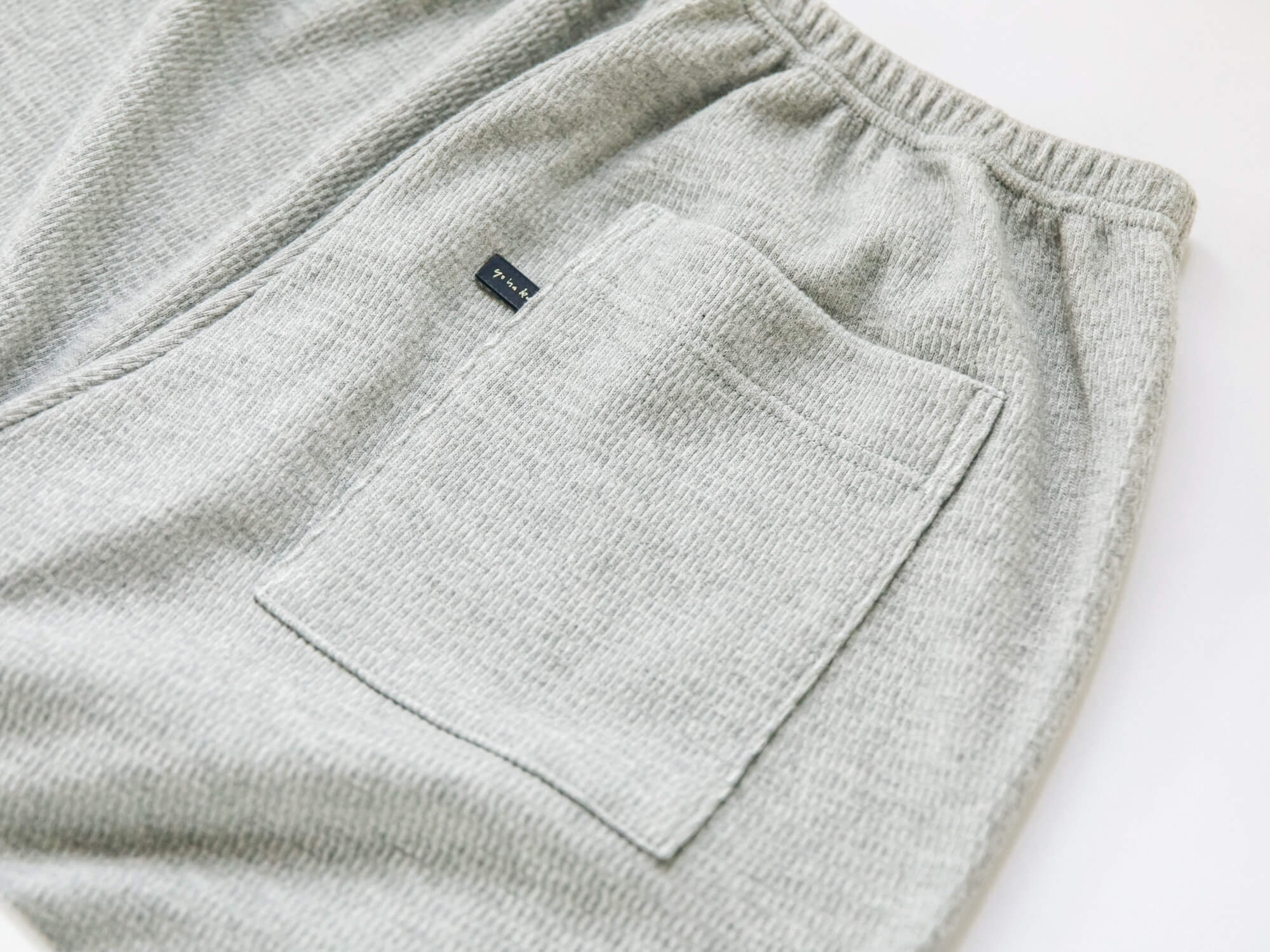 腰回りはゆるっと、裾に向かって細くなる独特のシルエット。リラックス感はあるのに、だらしなく見えず、ちょっと外にも出かけたくなるバランス。後ろにひとつだけ付いたポケットも、yohakuらしい遊び心です。