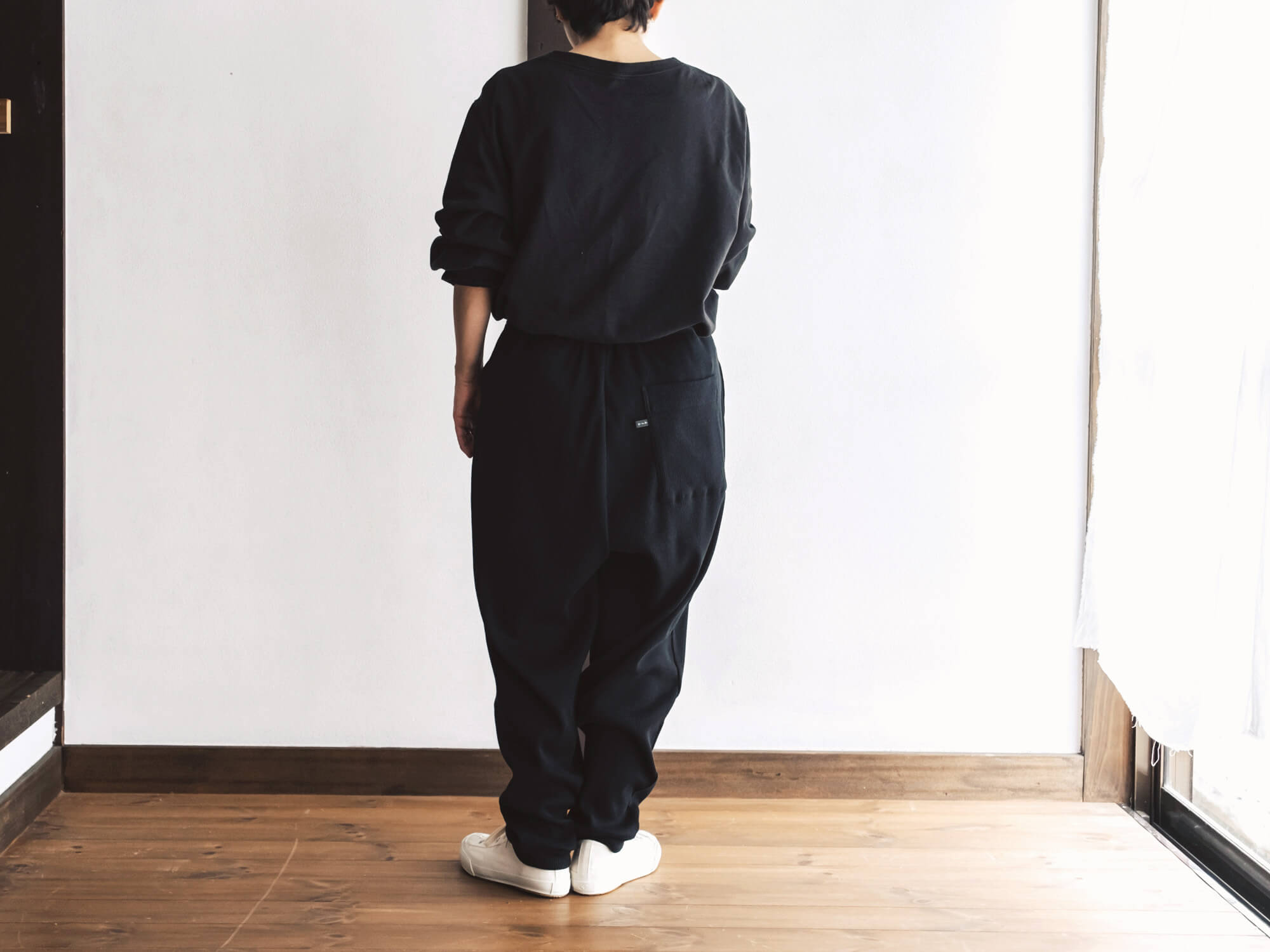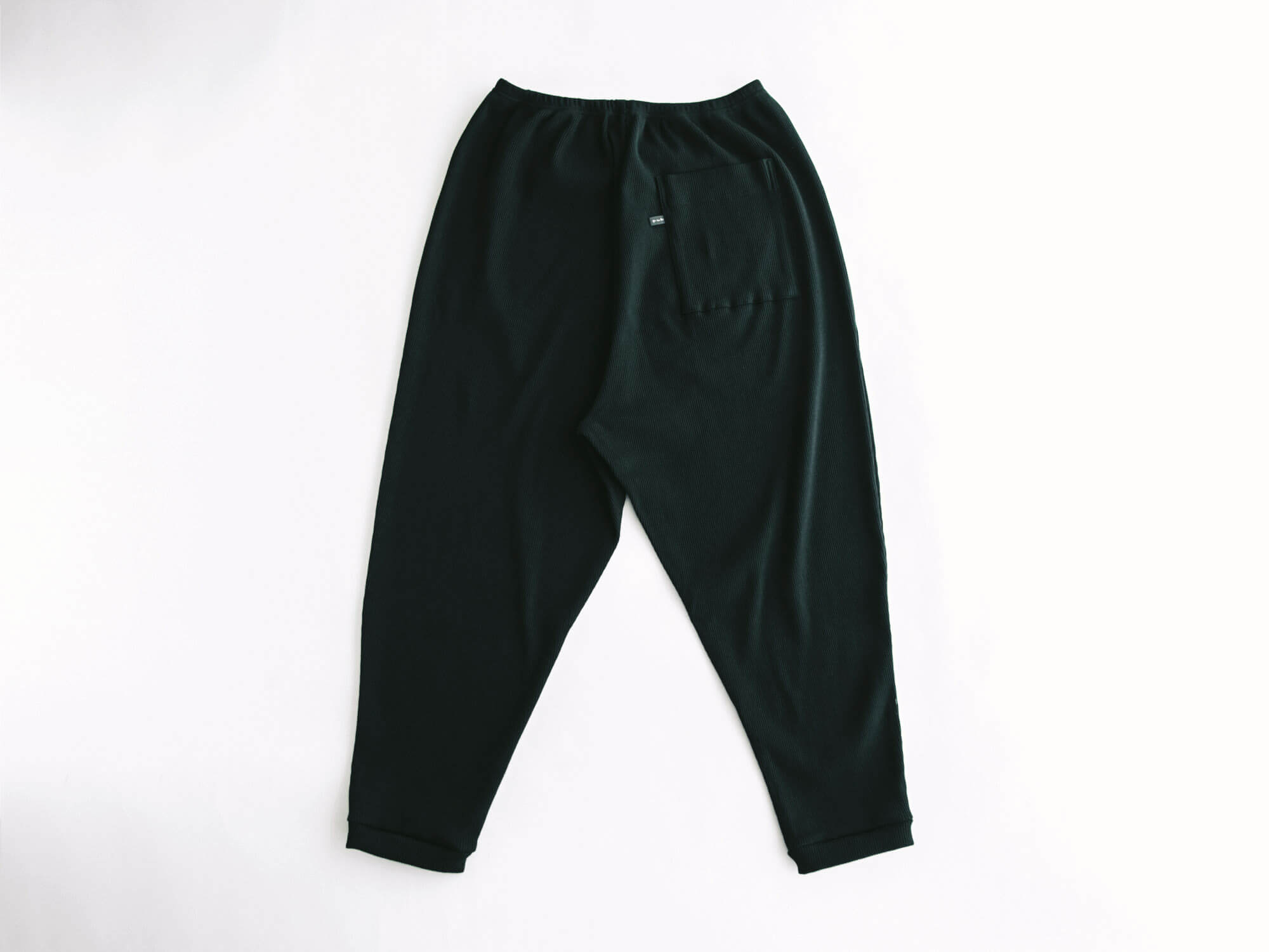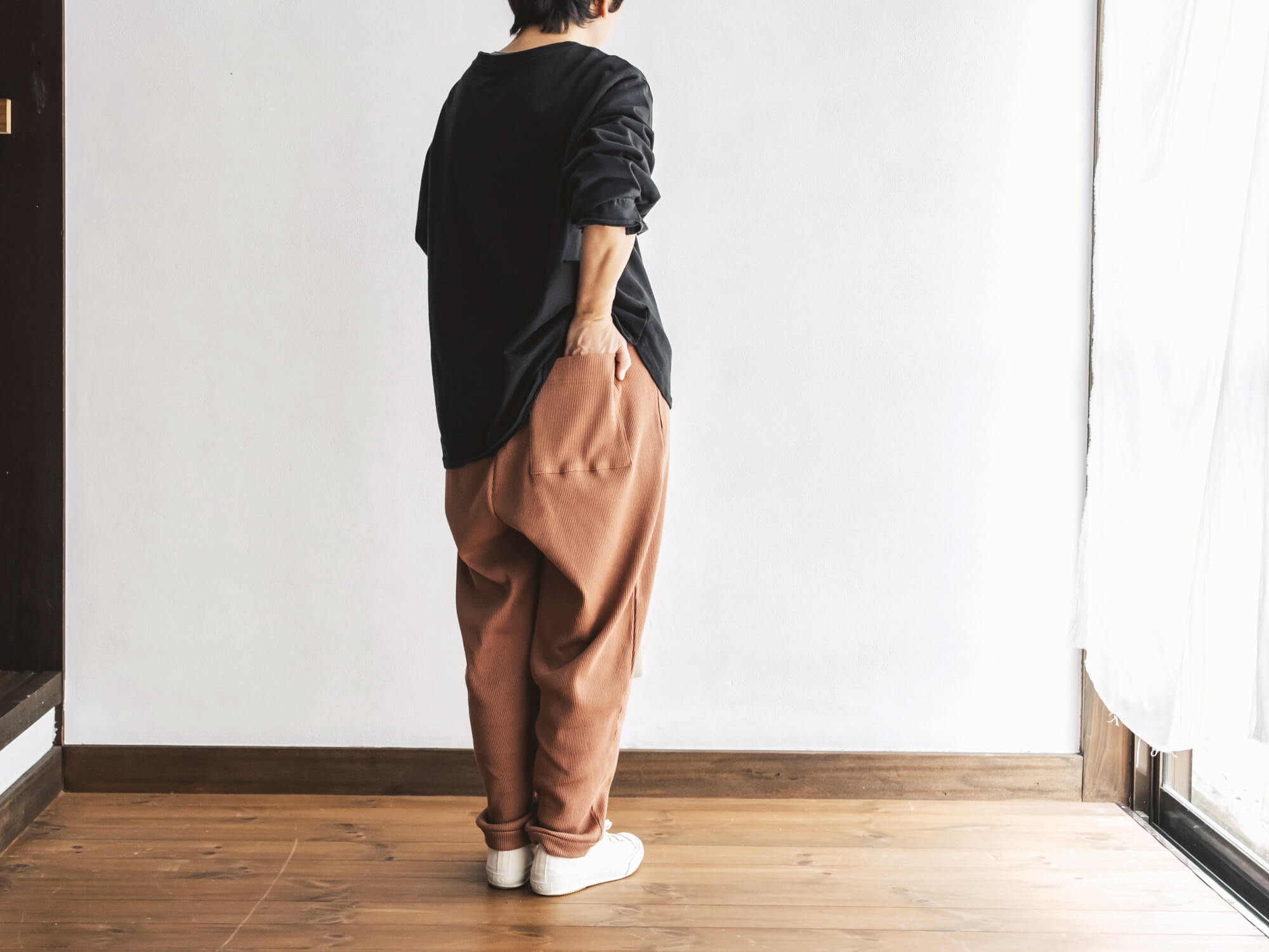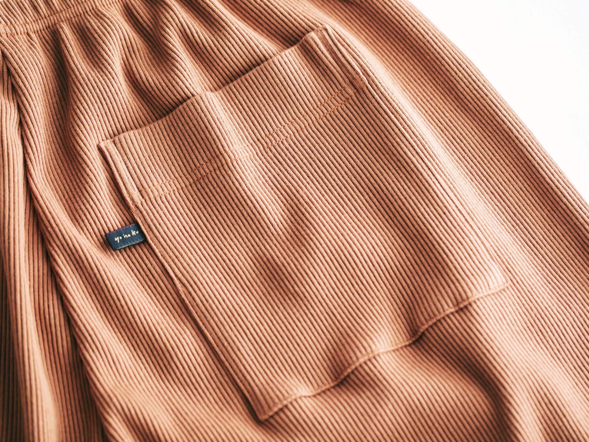 腰回りはゆるっと、裾に向かって細くなる独特のシルエット。リラックス感はあるのに、だらしなく見えず、ちょっと外にも出かけたくなるバランス。後ろにひとつだけ付いたポケットも、yohakuらしい遊び心です。