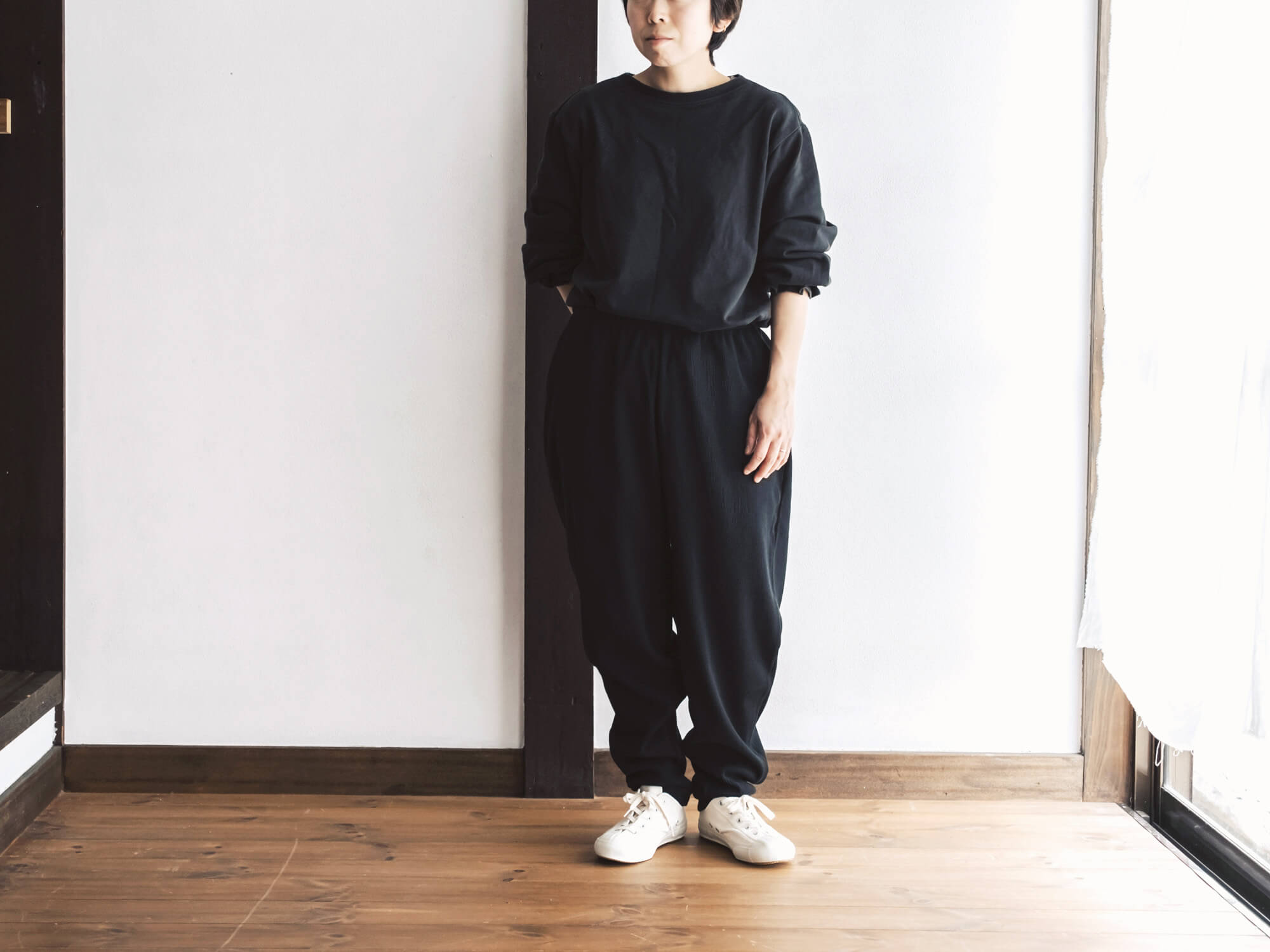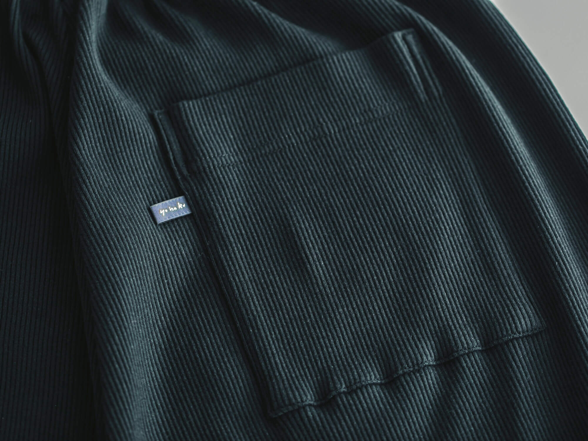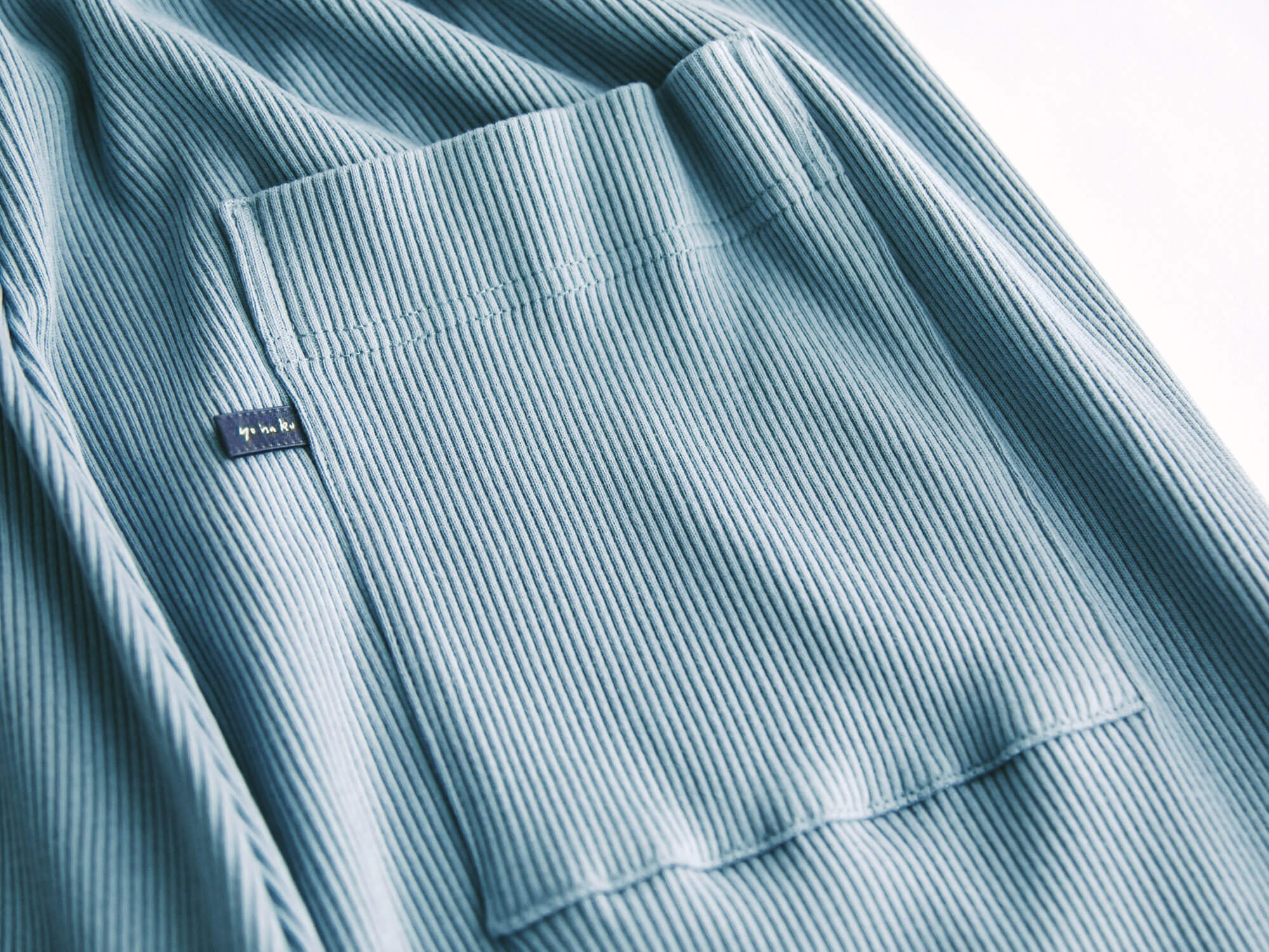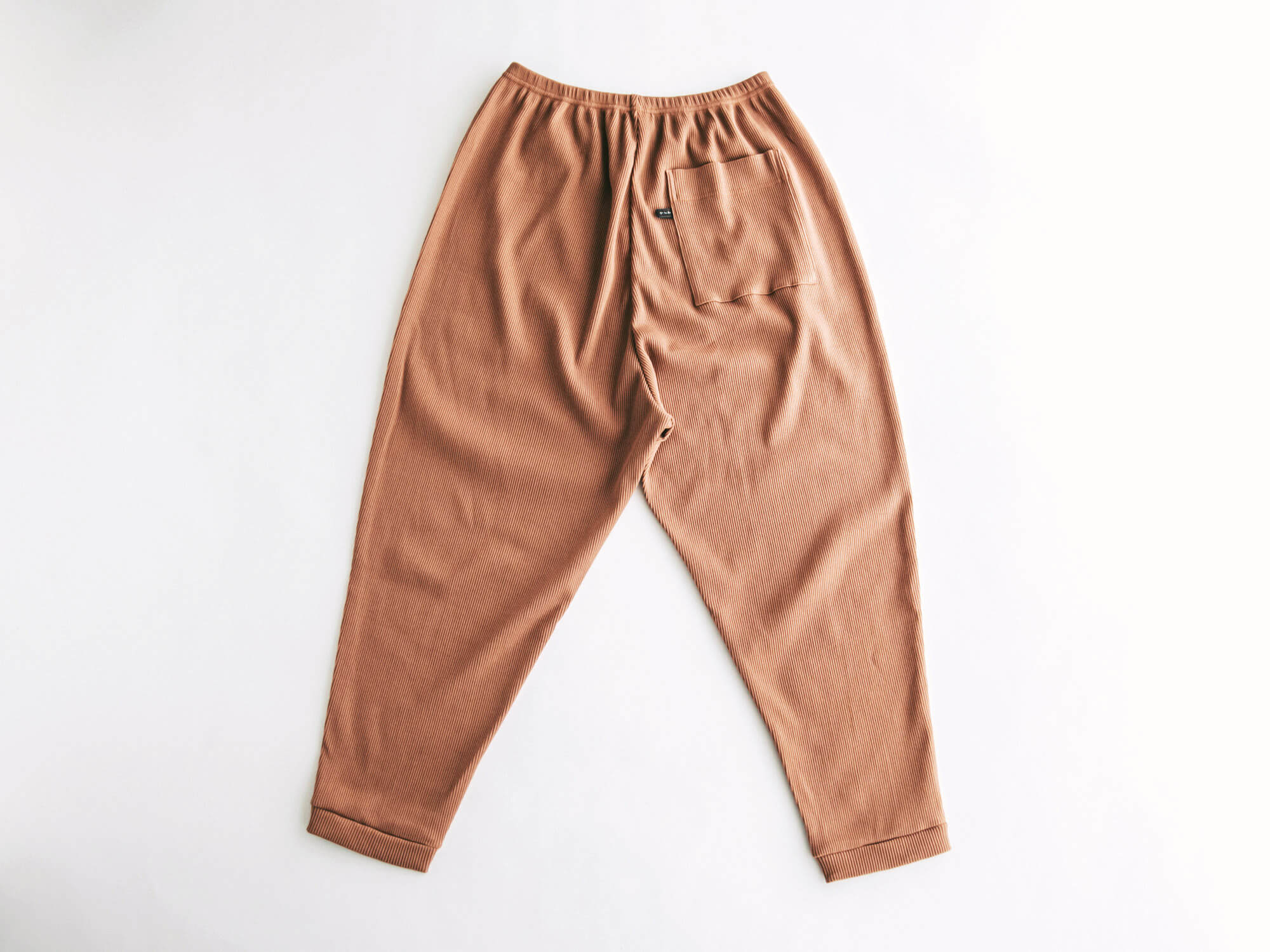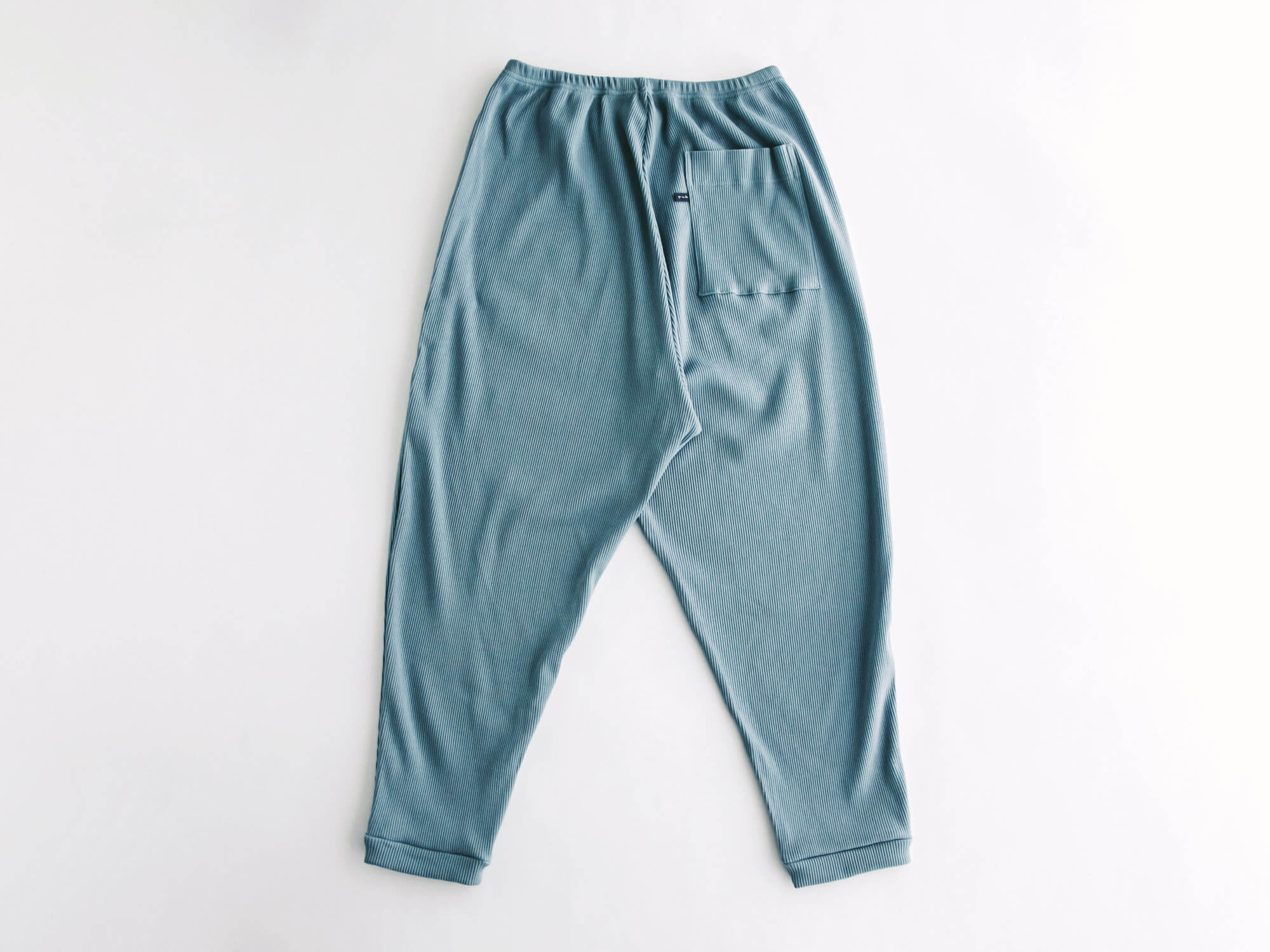 腰回りはゆるっと、裾に向かって細くなる独特のシルエット。リラックス感はあるのに、だらしなく見えず、ちょっと外にも出かけたくなるバランス。後ろにひとつだけ付いたポケットも、yohakuらしい遊び心です。