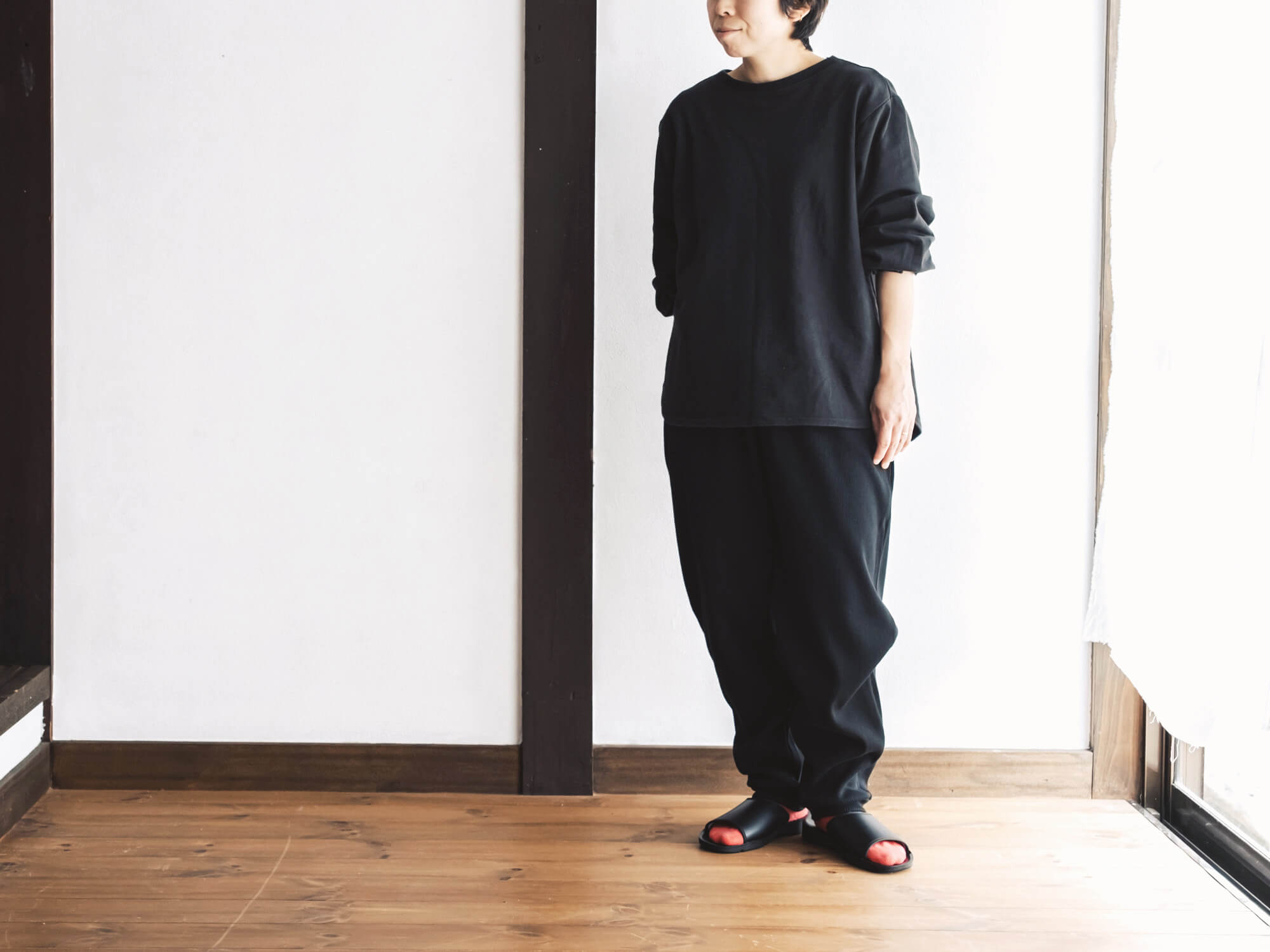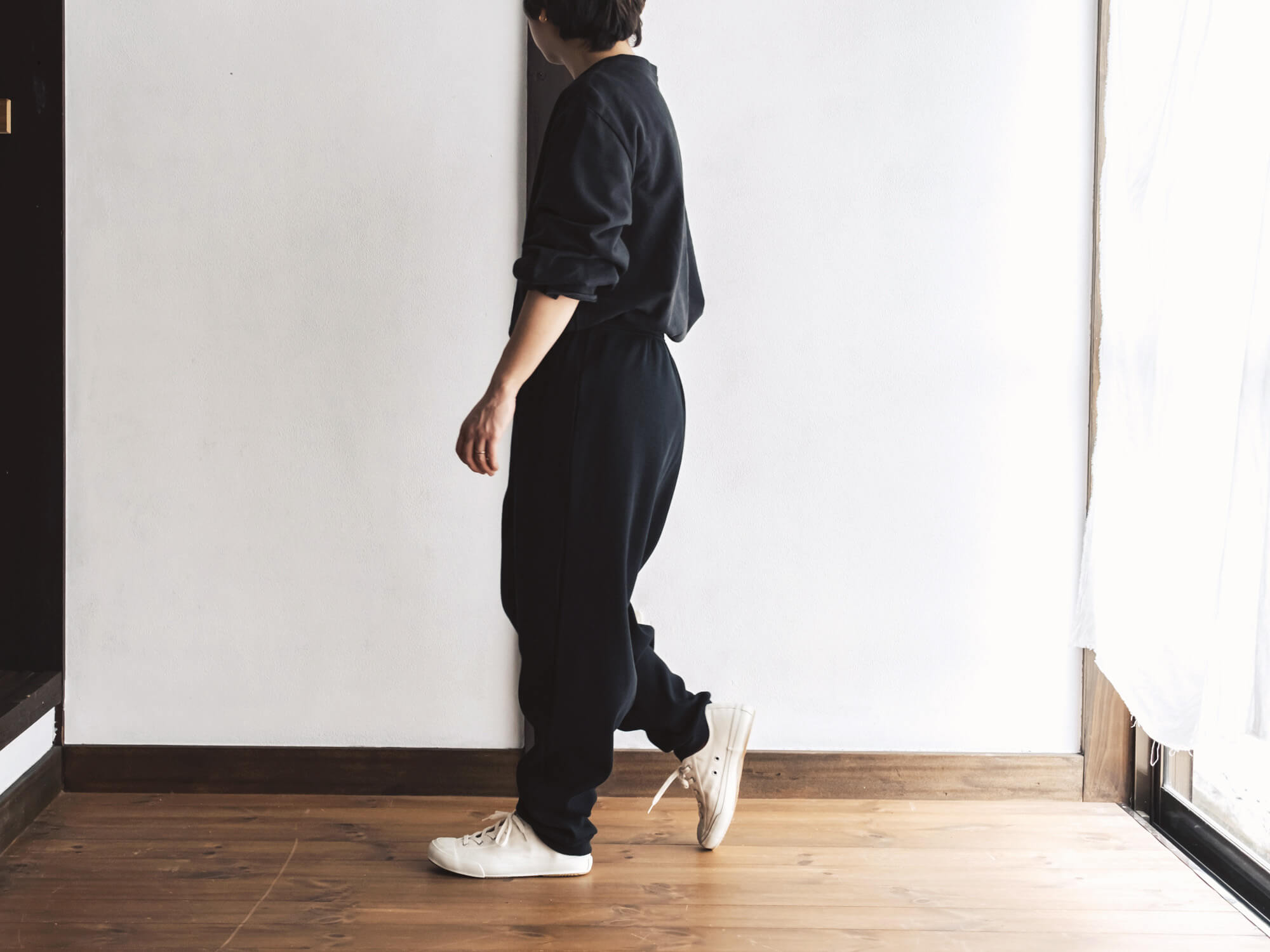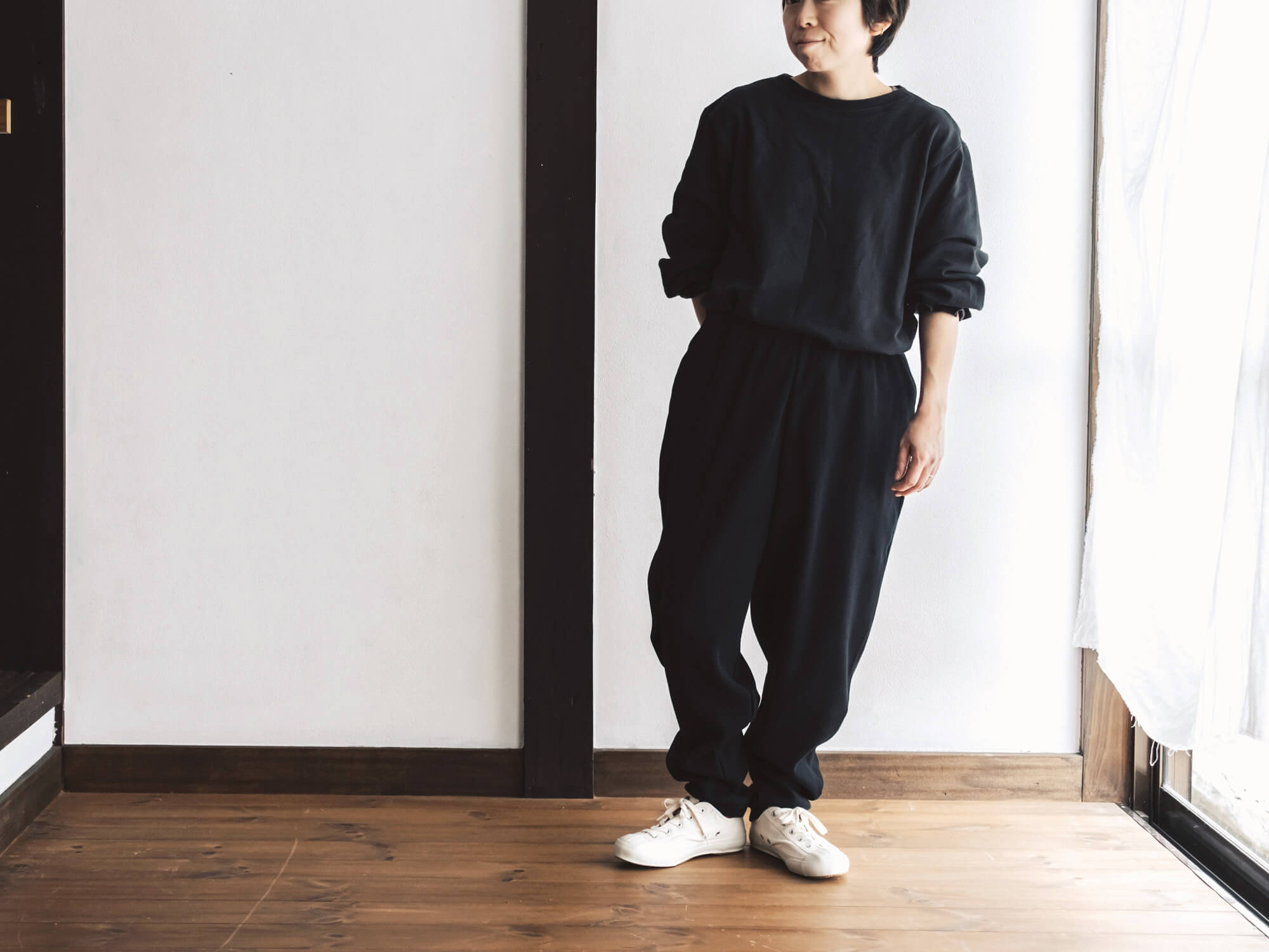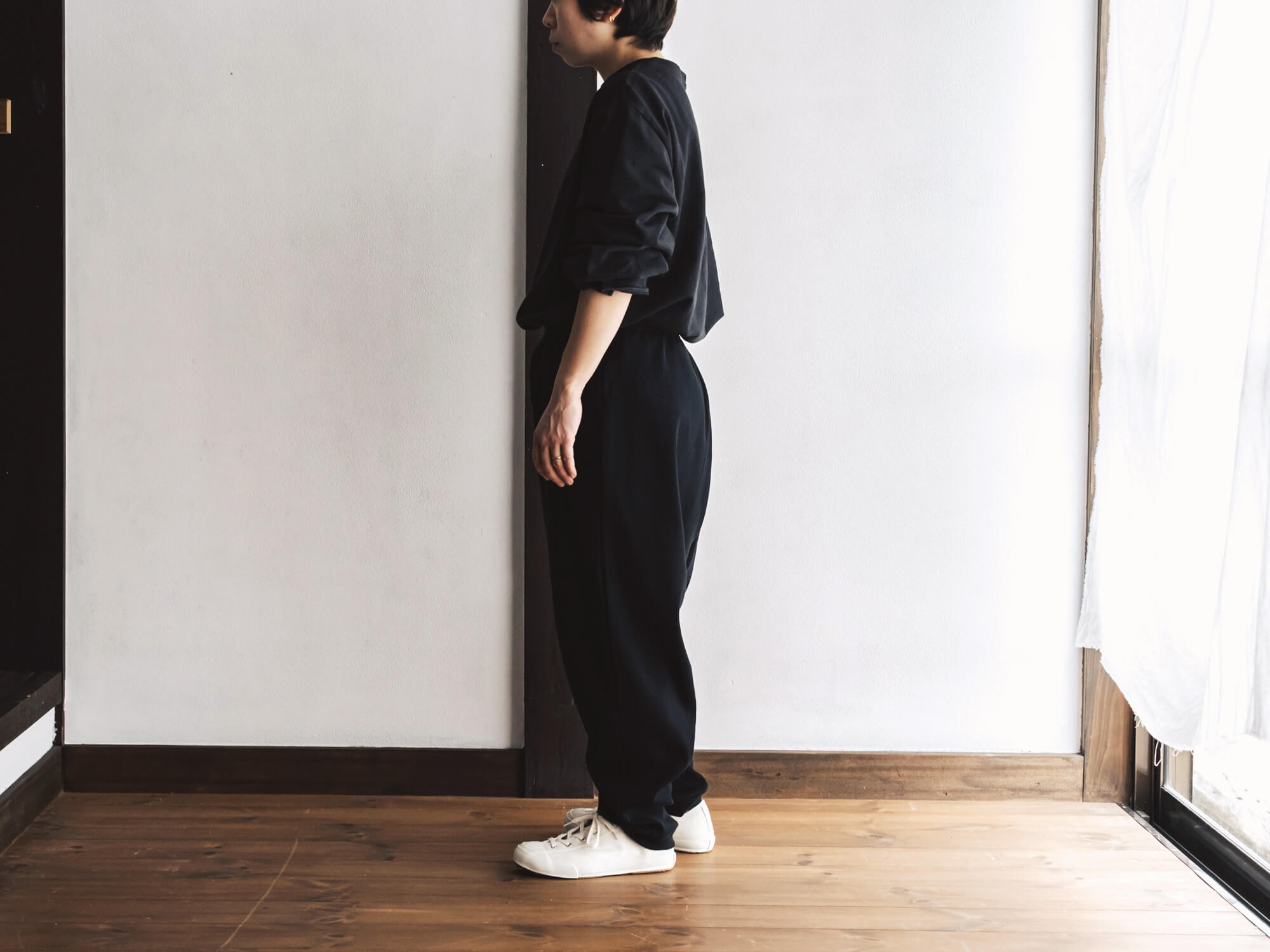 腰回りはゆるっと、裾に向かって細くなる独特のシルエット。リラックス感はあるのに、だらしなく見えず、ちょっと外にも出かけたくなるバランス。後ろにひとつだけ付いたポケットも、yohakuらしい遊び心です。